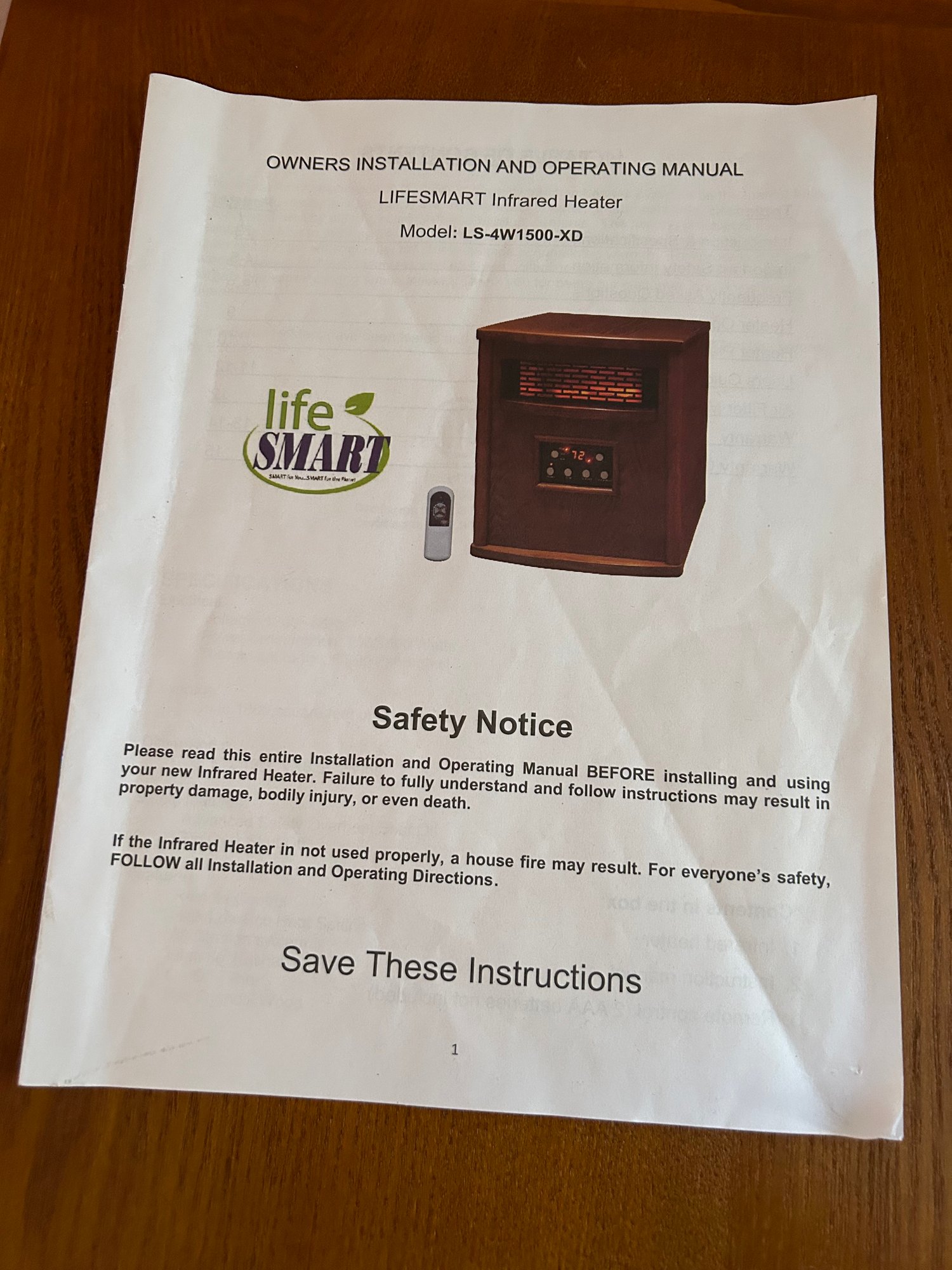 Smart life infrared heater complete with owners manual, 13“ x 16 1/2“ deep by 16 1/2 inches tall