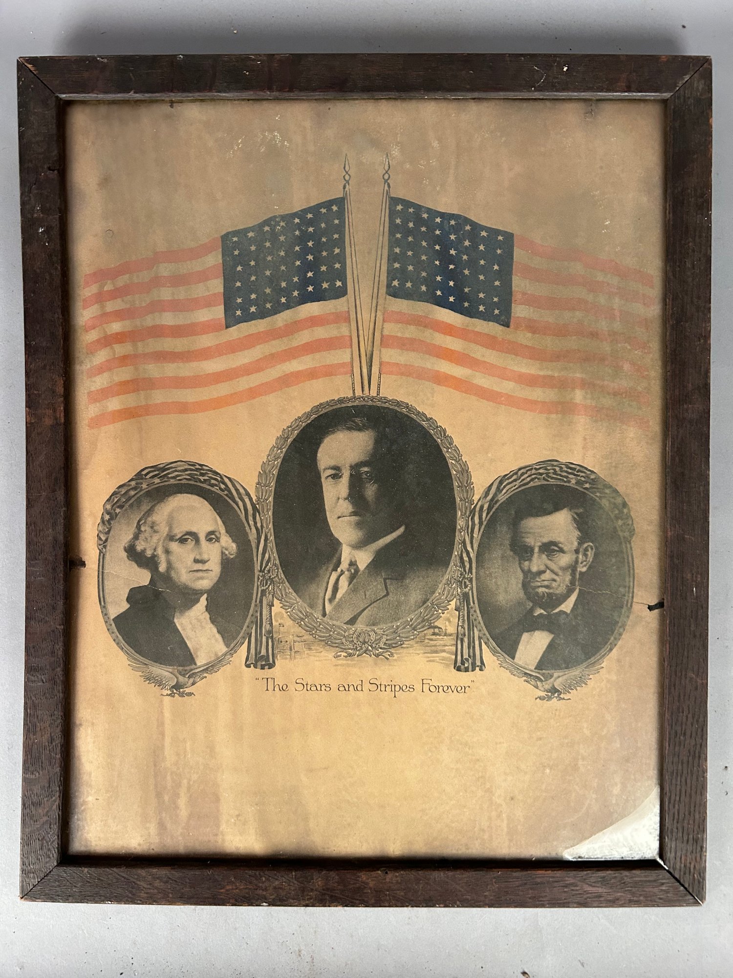 Stars and stripes forever poster, American flag, Washington and Lincoln and Wilson tears to left and right side through Washington and Lincoln portrait.