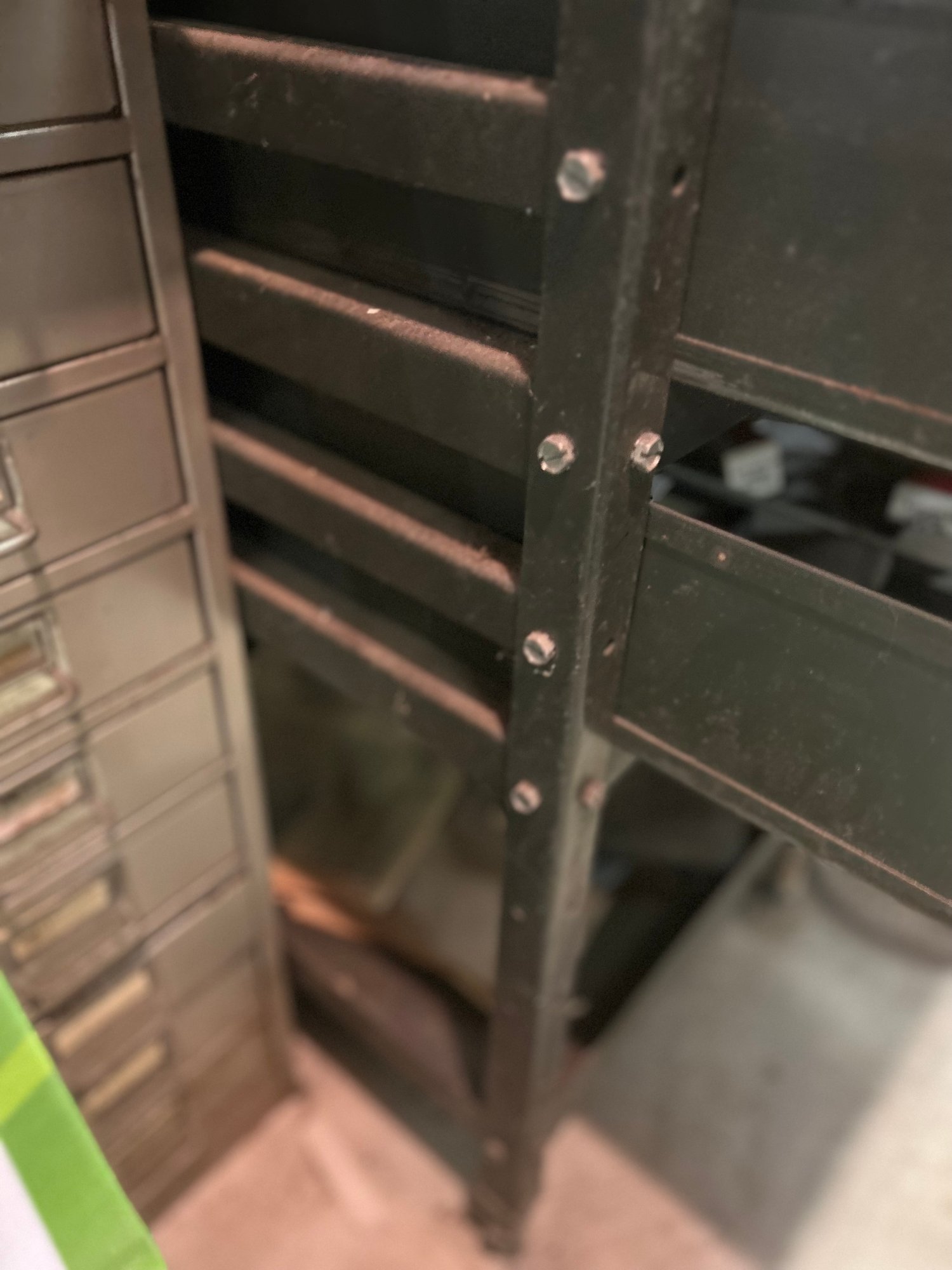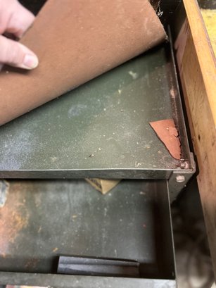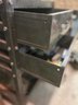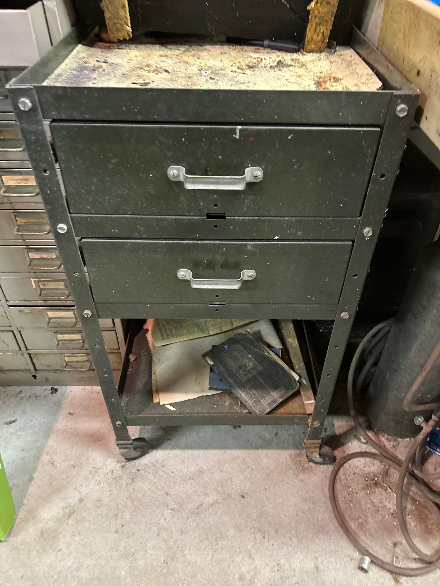 Steel cabinet on wheels. Tray top, two drawers, lower shelf. Dark green color good condition, 18“ x 25“ x 34“ tall.