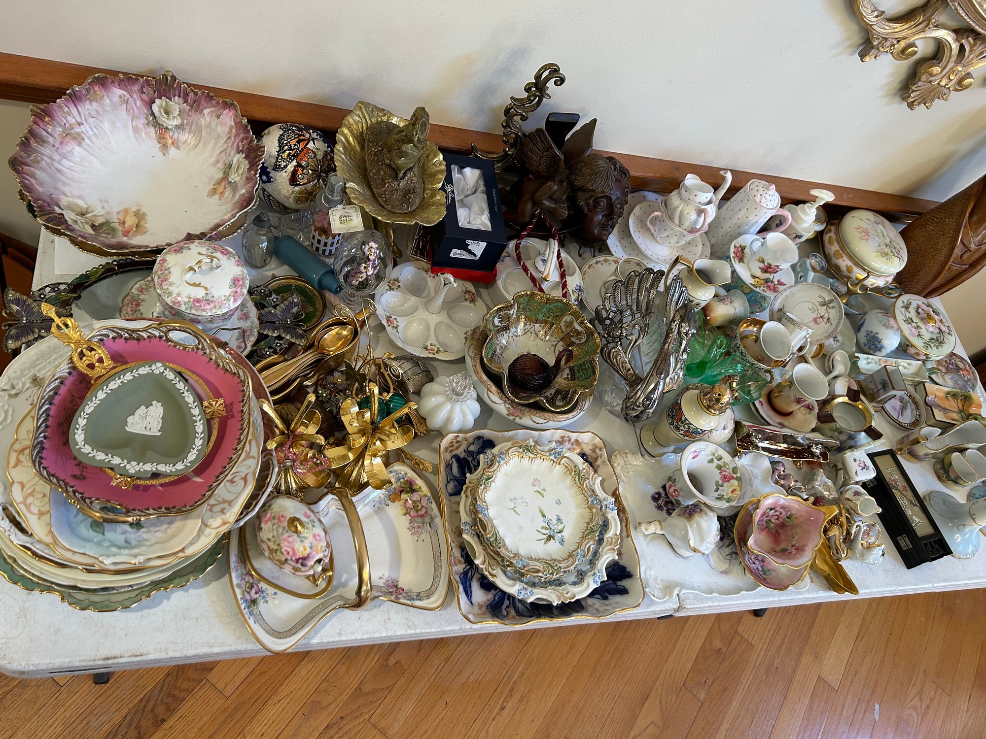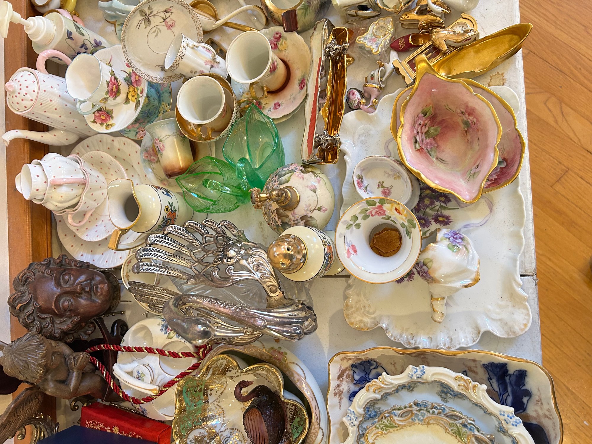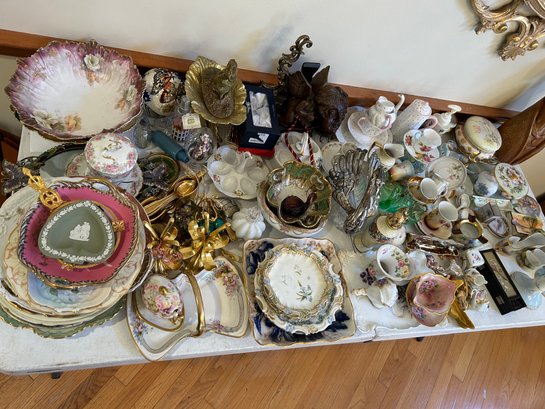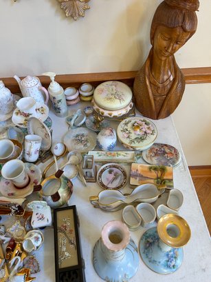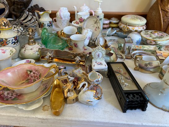 Table lot includes porcelain, glass, brass, wood, carvings, Miniature, handpainted items, Nipon,Limoges, over 100 pieces. All in good condition.