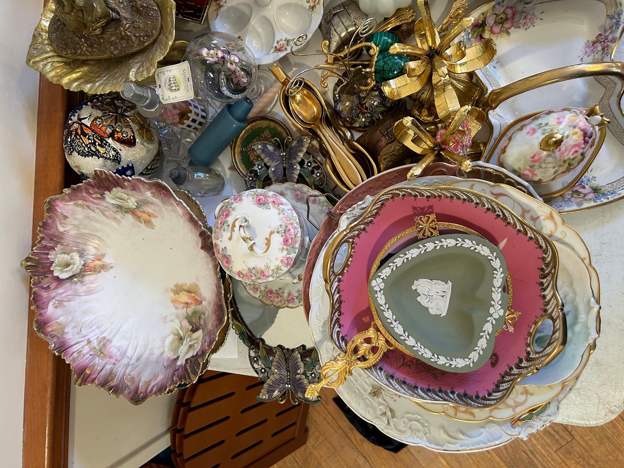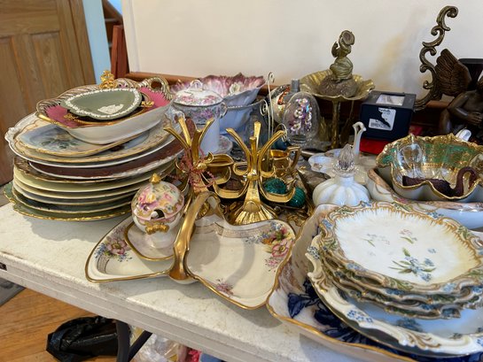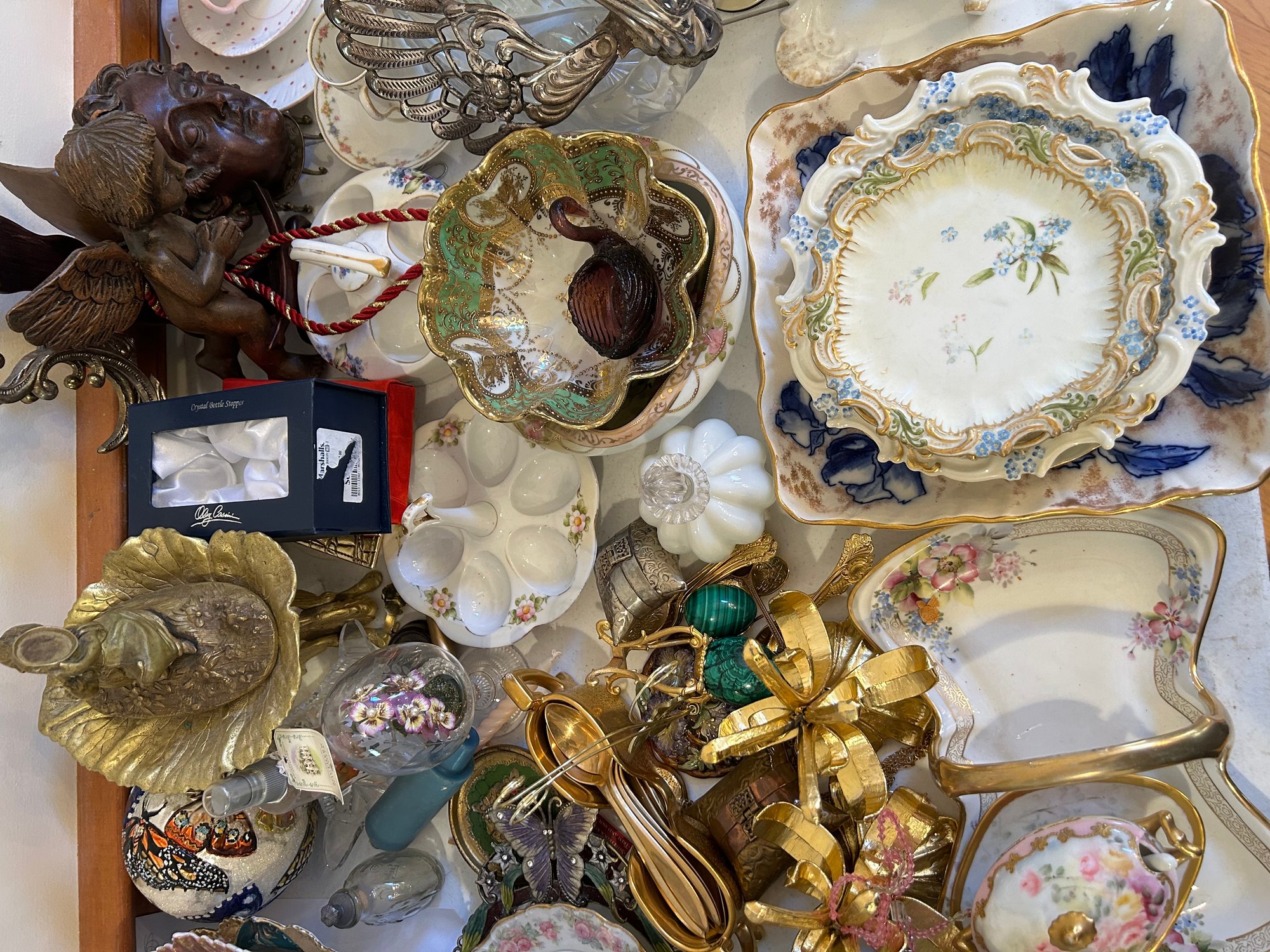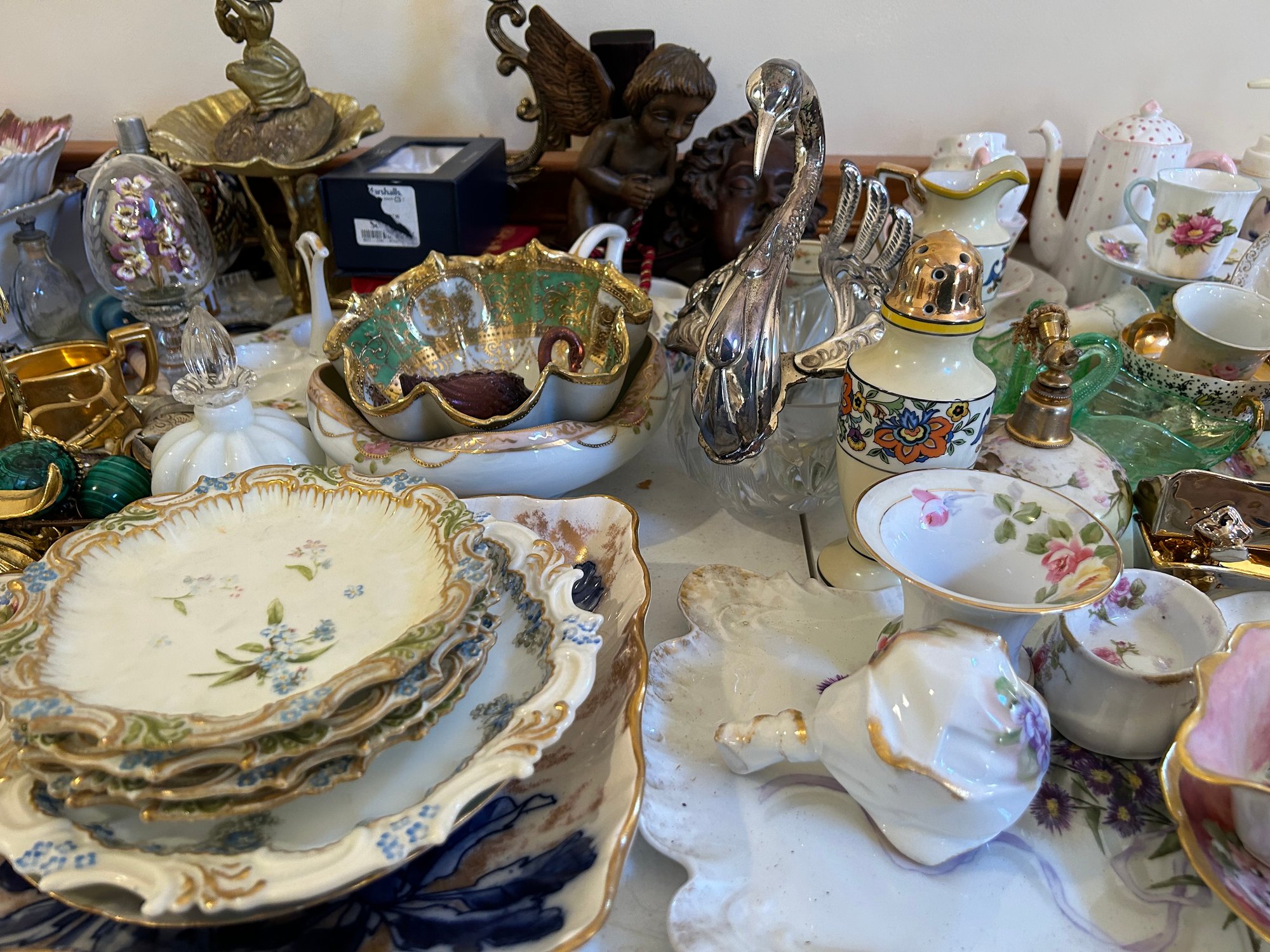 Table lot includes porcelain, glass, brass, wood, carvings, Miniature, handpainted items, Nipon,Limoges, over 100 pieces. All in good condition.