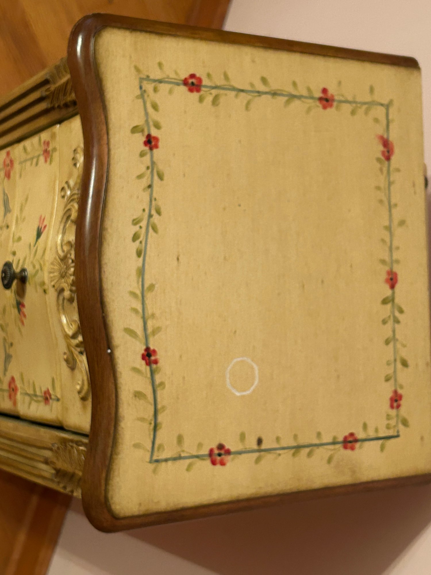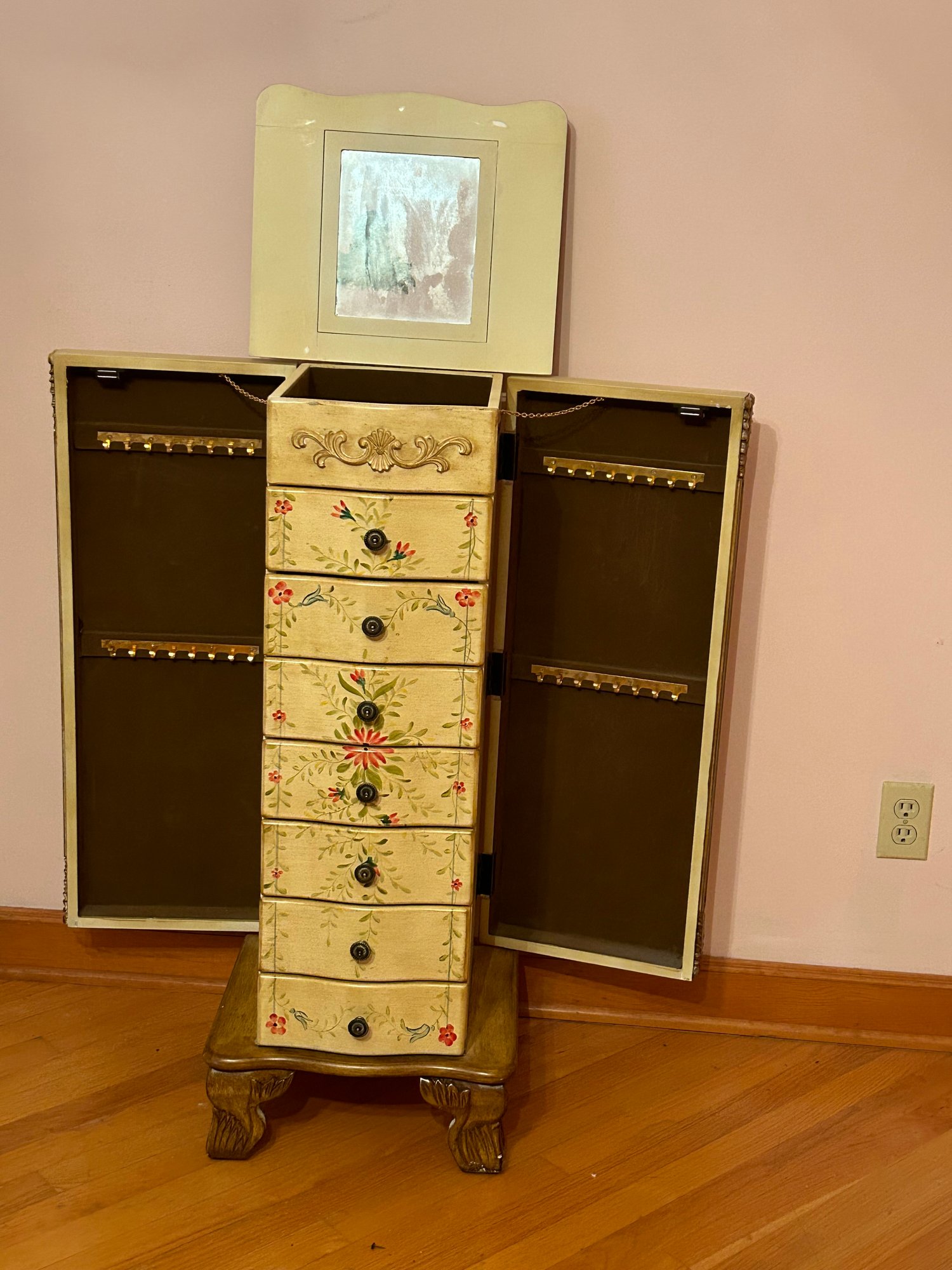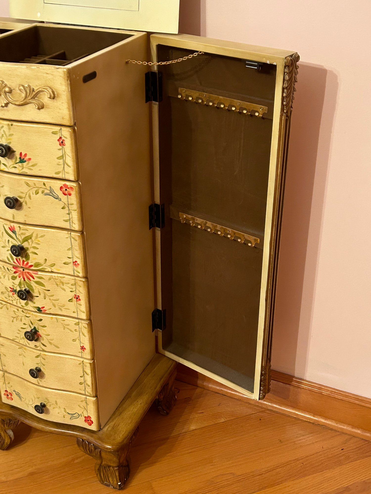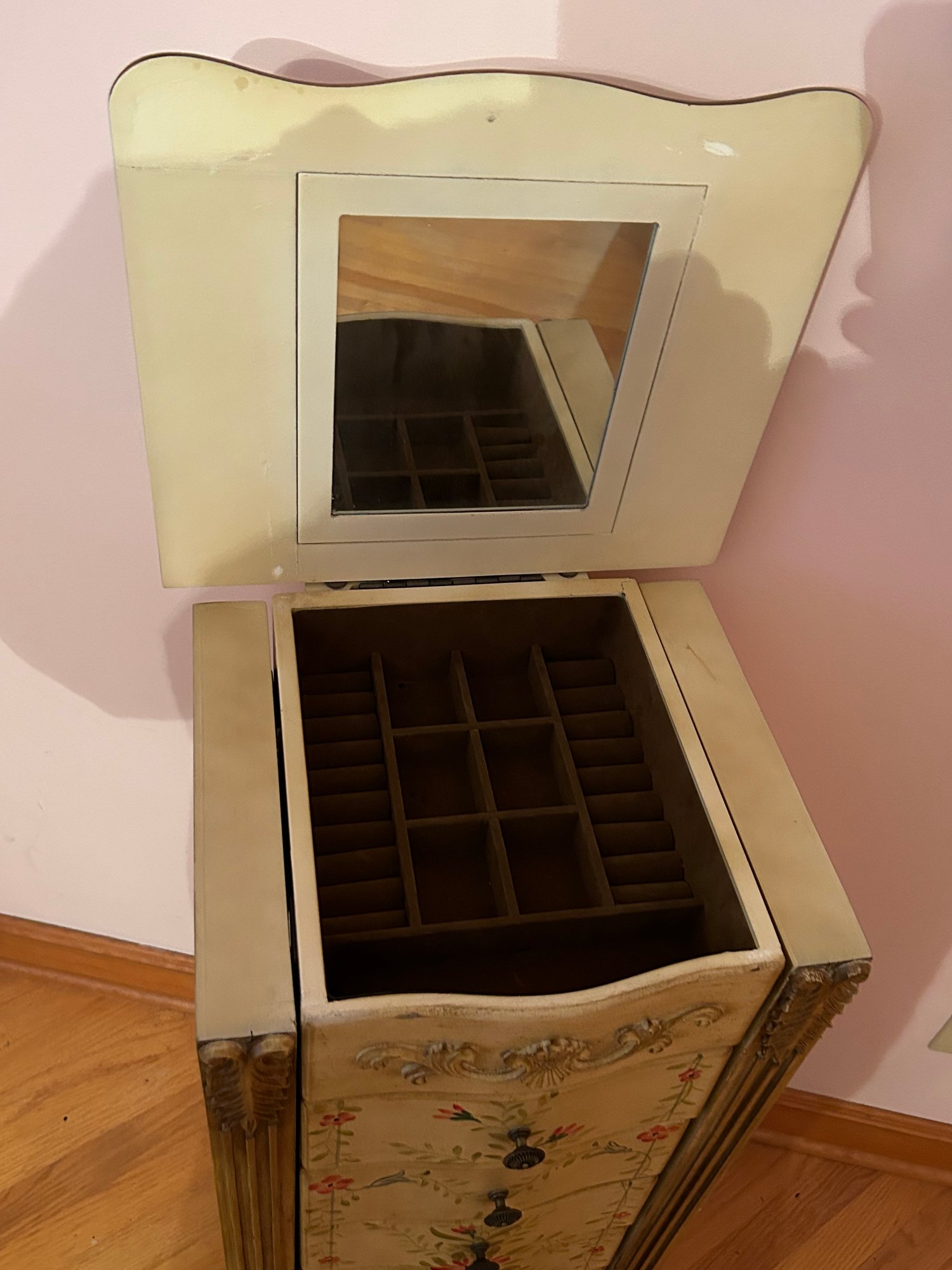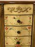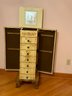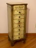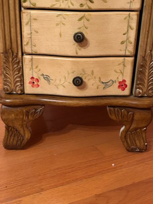 Tall chest jewelry cabinet, contemporary with paint decorated front, top and side. Seven drawers, lift top, open sides. 15” x 12” deep by 28 1/2 inches tall.