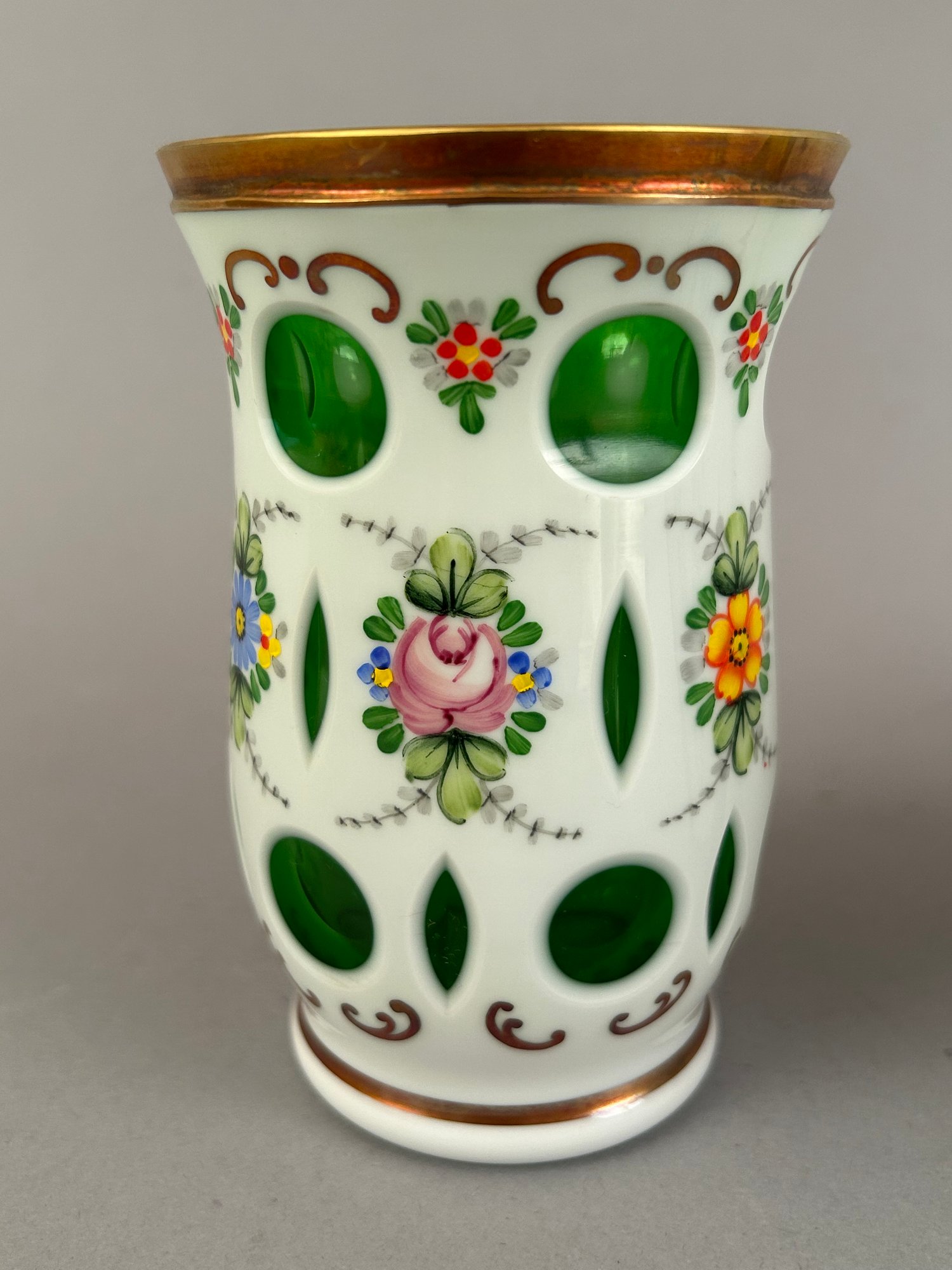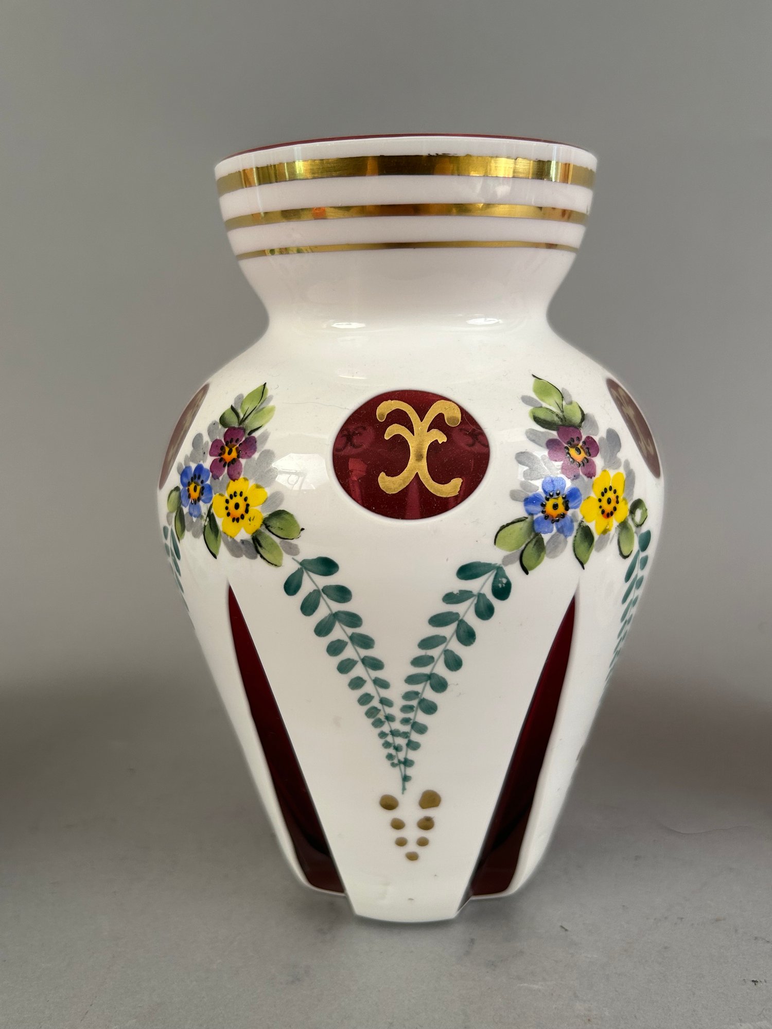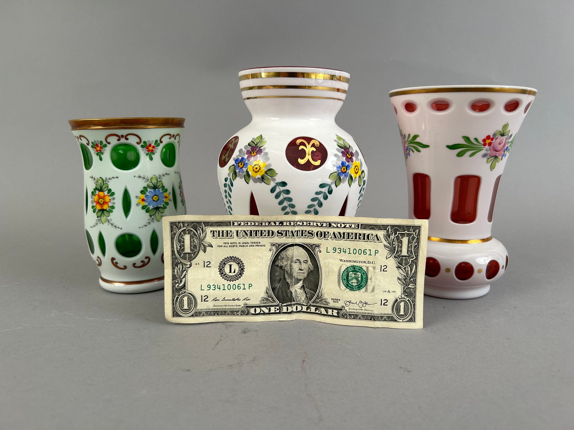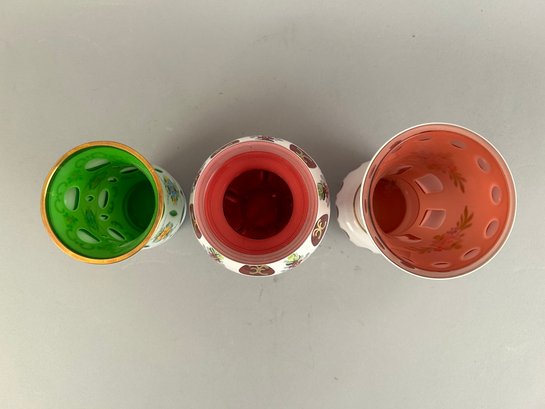 Three bohemian glass vases. Two cut to cranberry and one cut to green. All with hand painted flower details