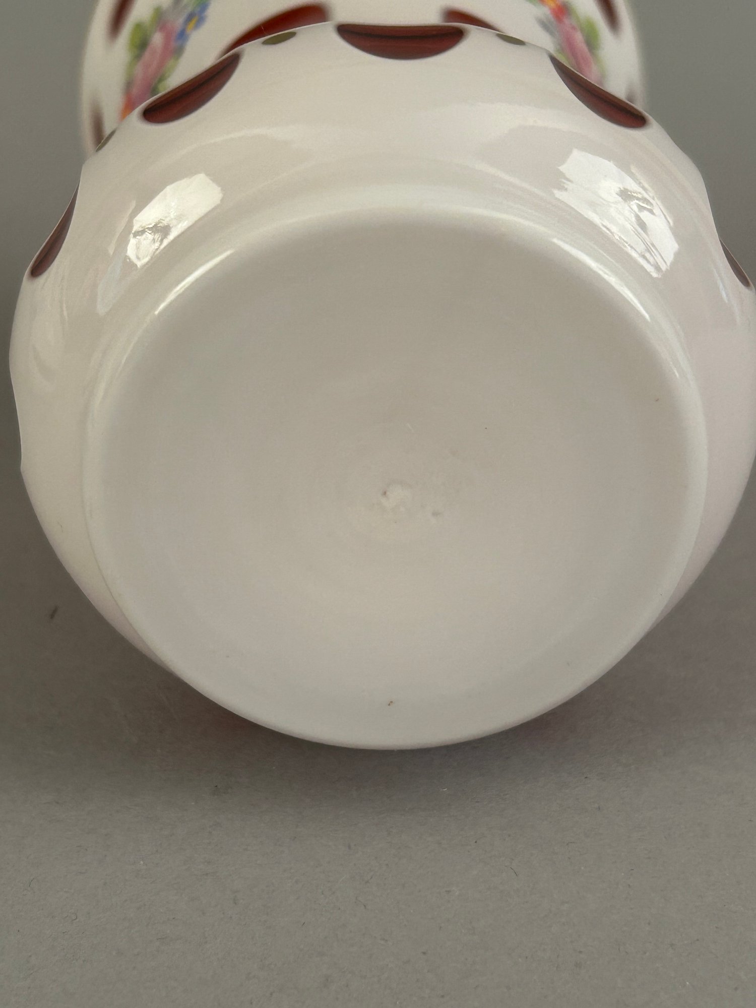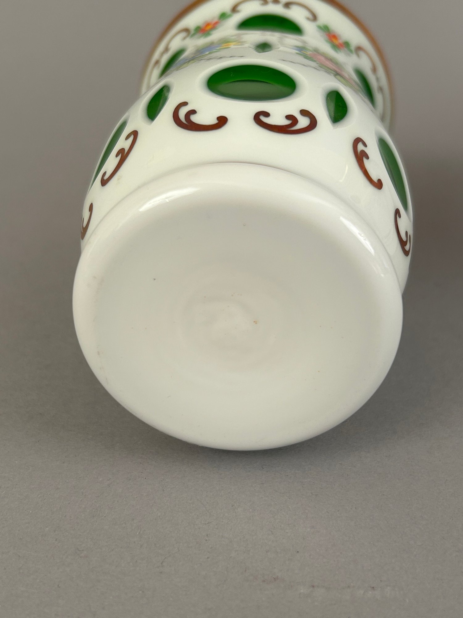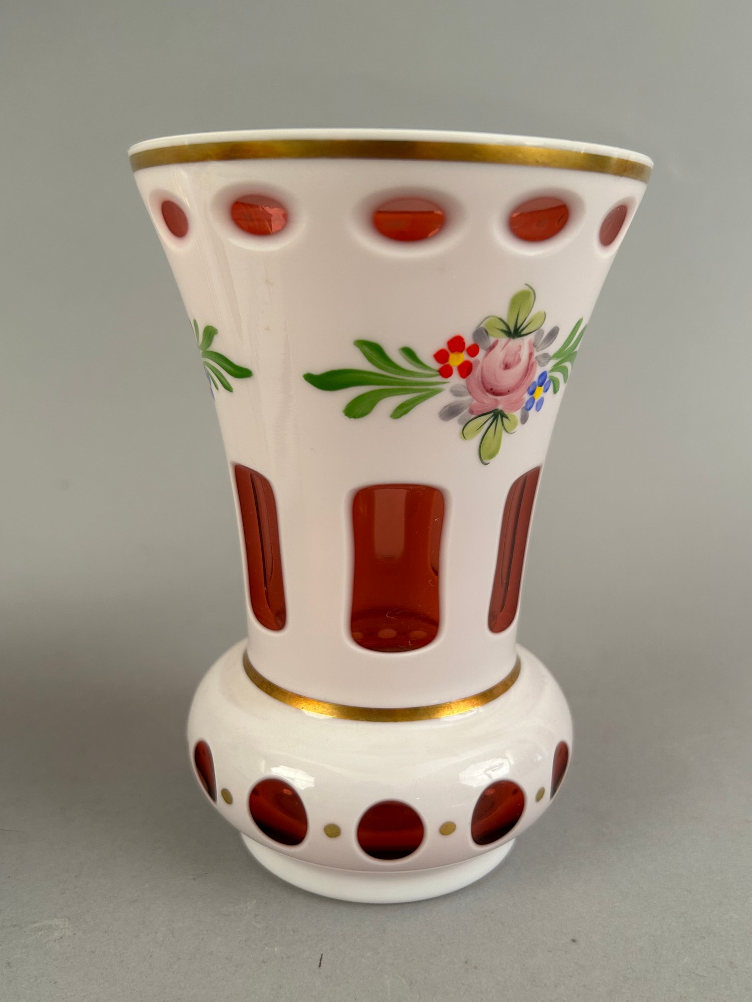 Three bohemian glass vases. Two cut to cranberry and one cut to green. All with hand painted flower details
