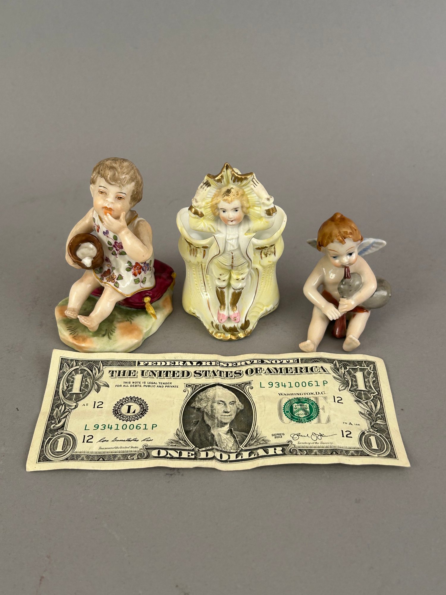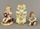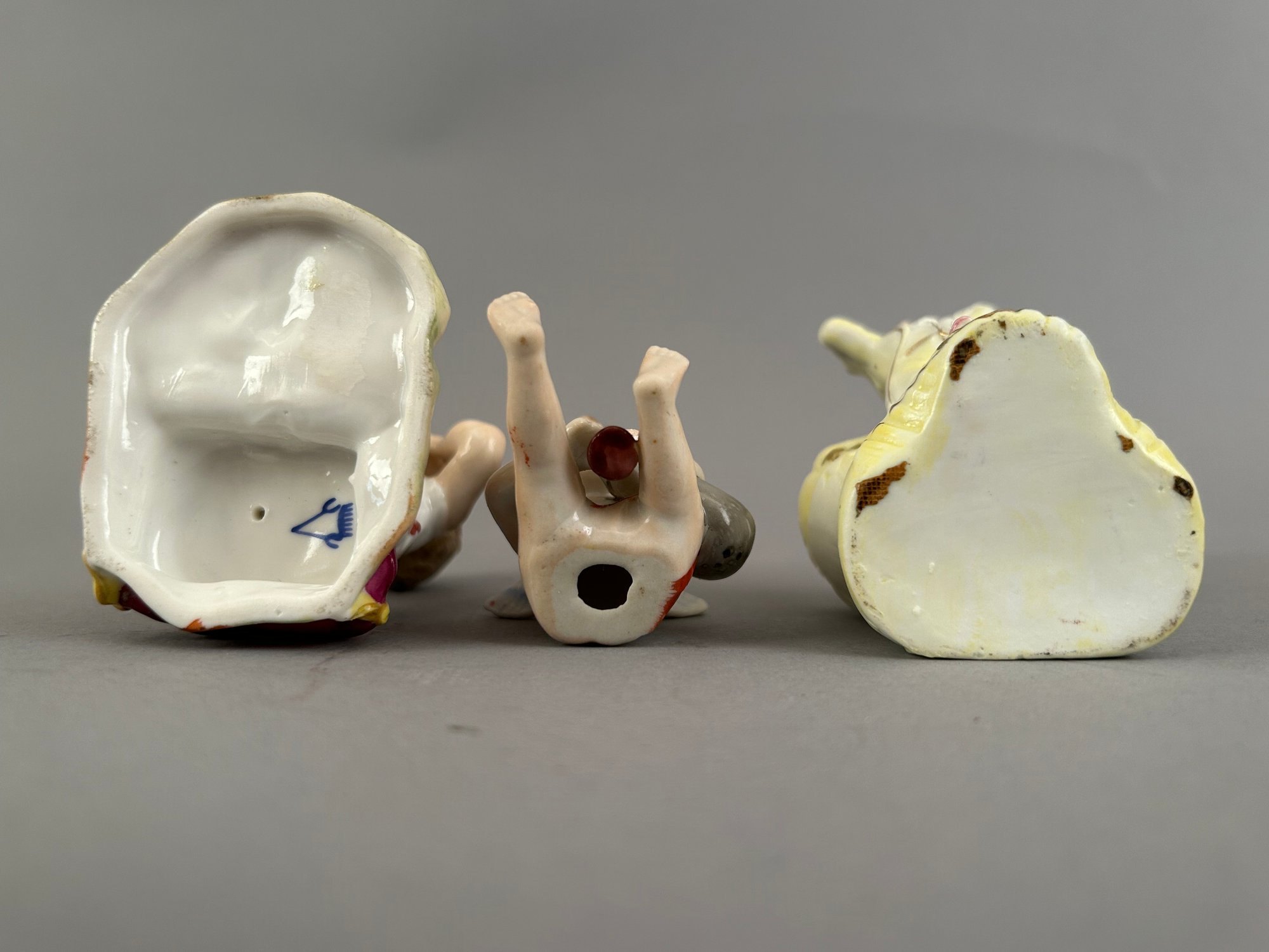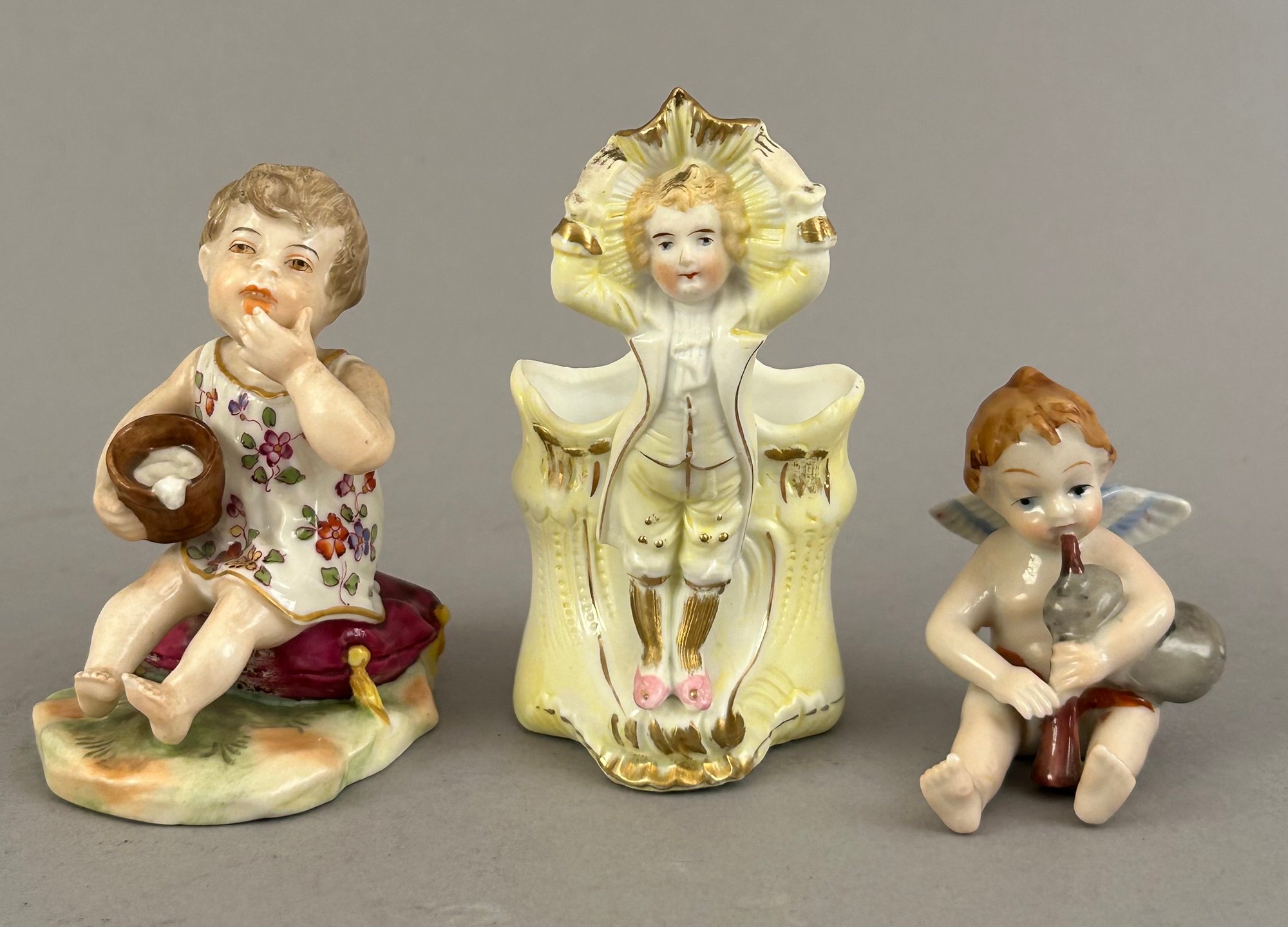 Three small figurines. One marked, one toothpick holder.