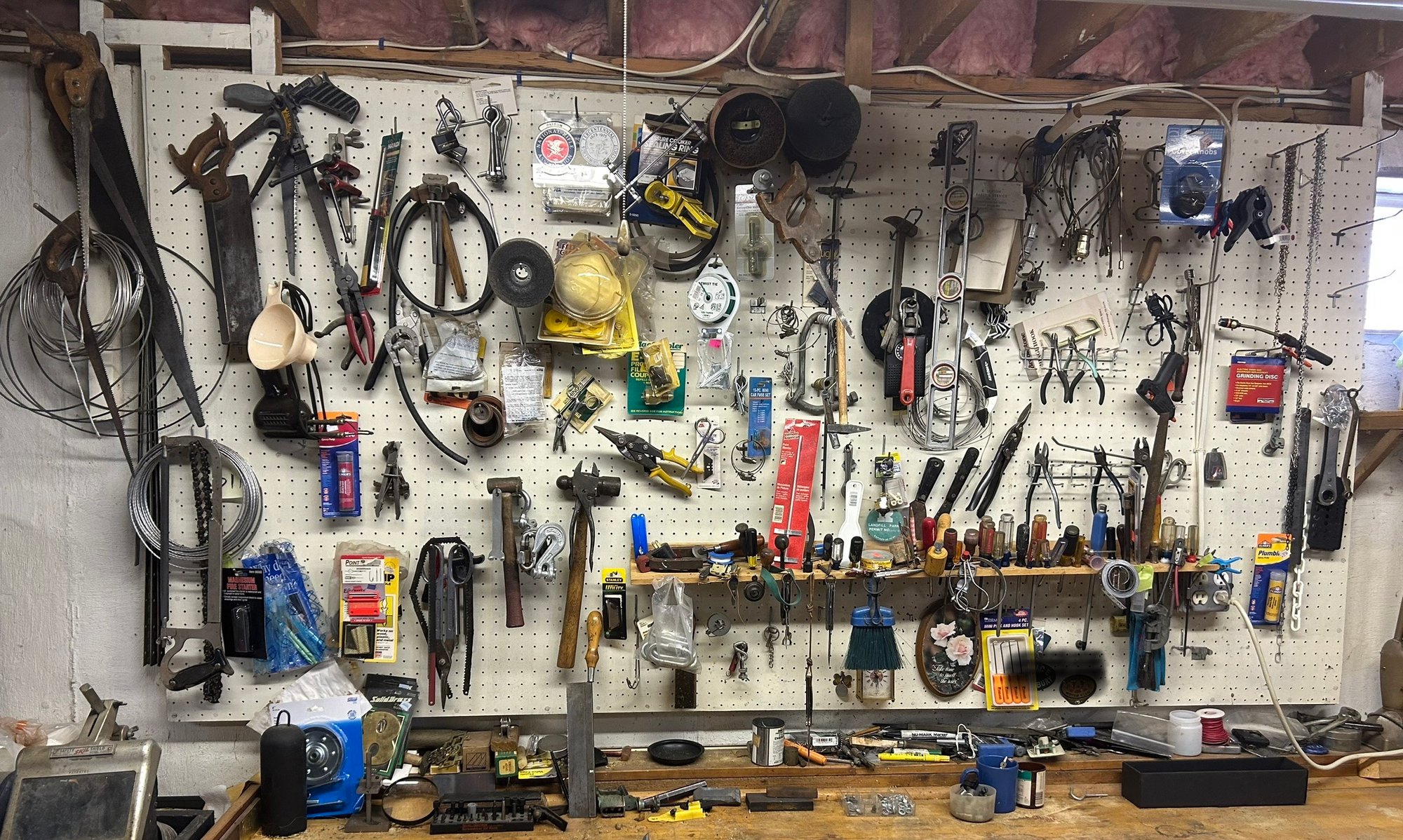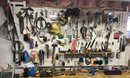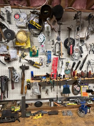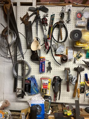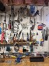 Tools, tools, tools #1 contents of back wall. All tools in photograph includes saws, hammers, screwdrivers, wire cutters, hot glue gun, soldering iron, etc.