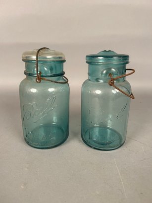 Two antique blue glass ball jars with bail handles. And glass lids 7 1/2 inches tall.