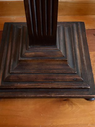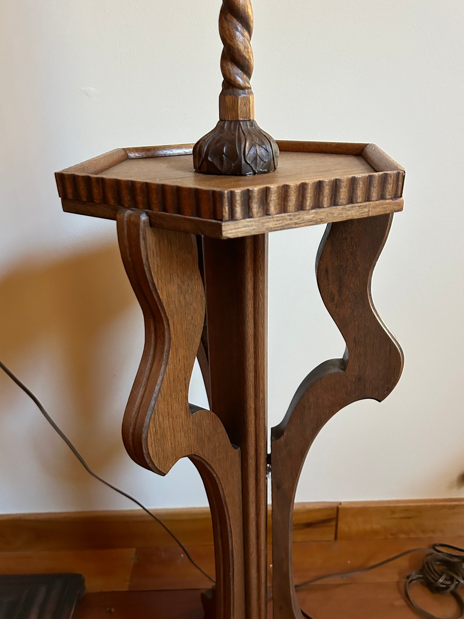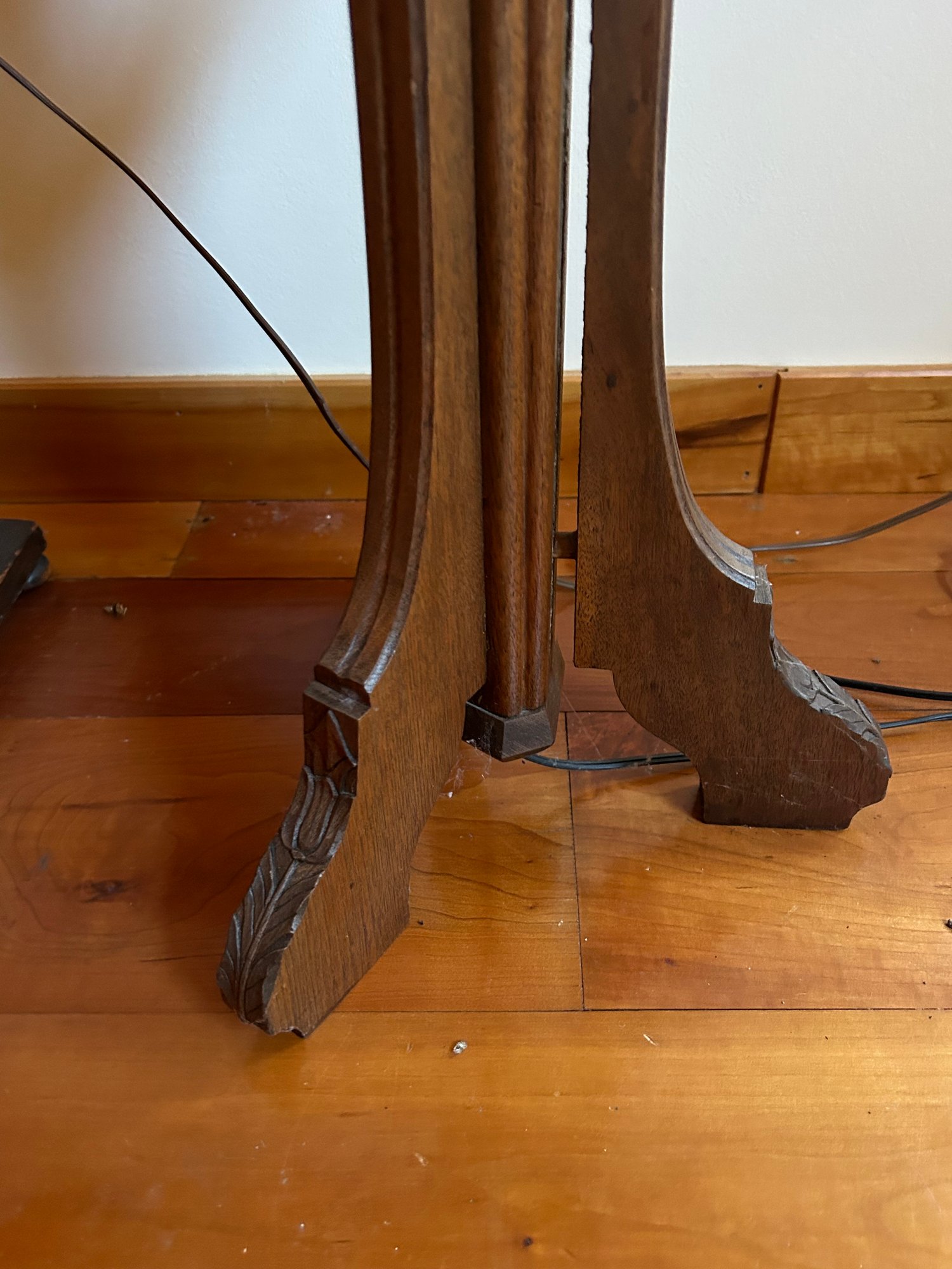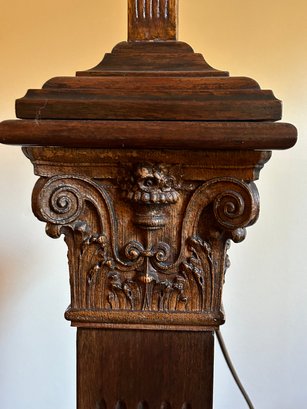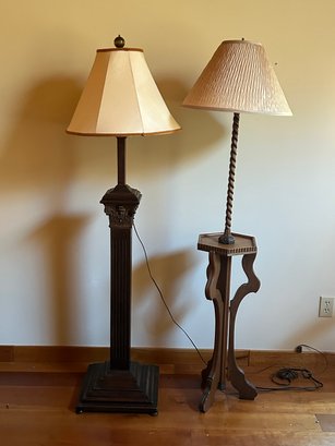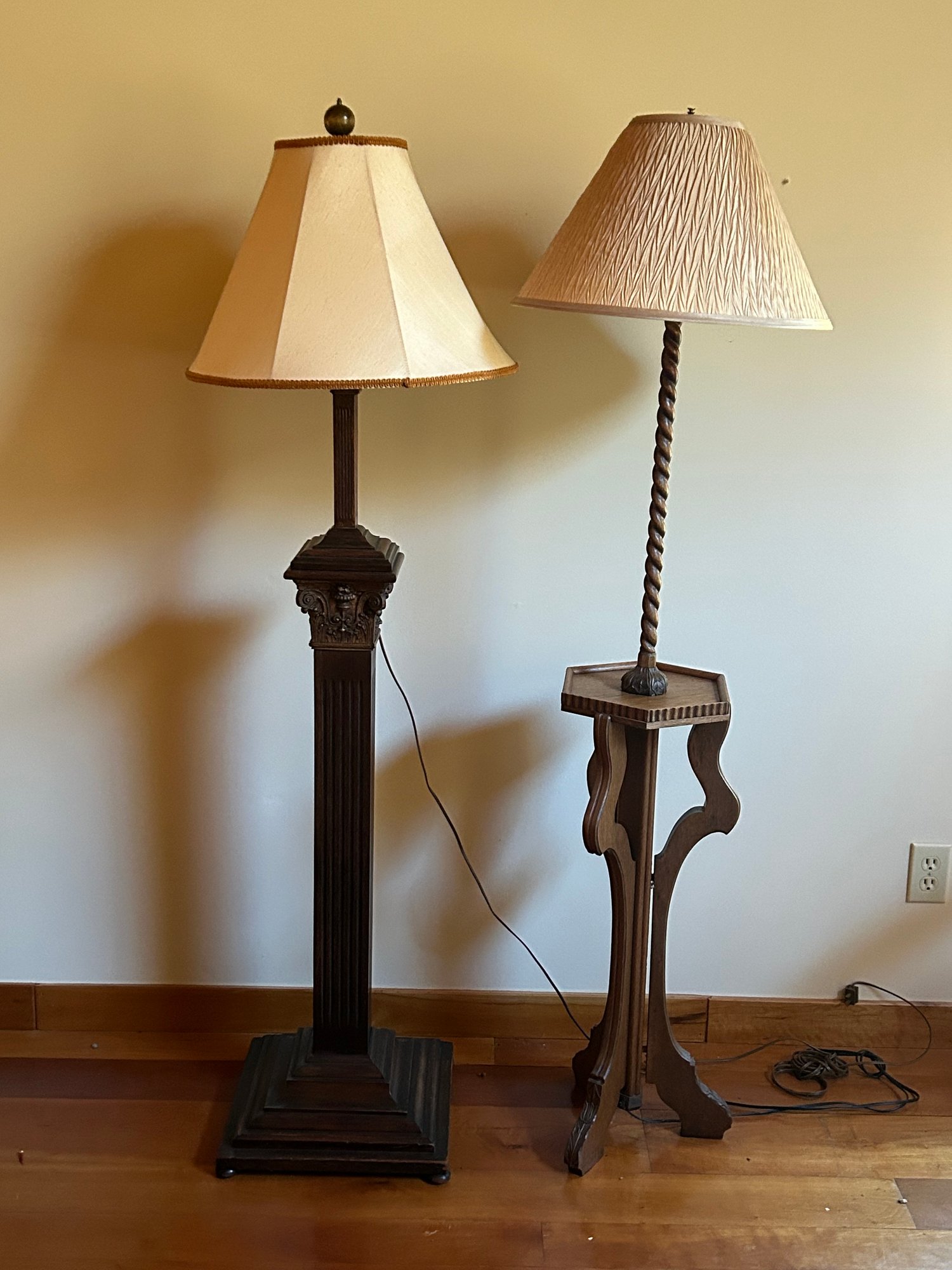 Two antique style floor lamps. One with carved Corinthian capital the other Victorian style. Tallest 64 inches.