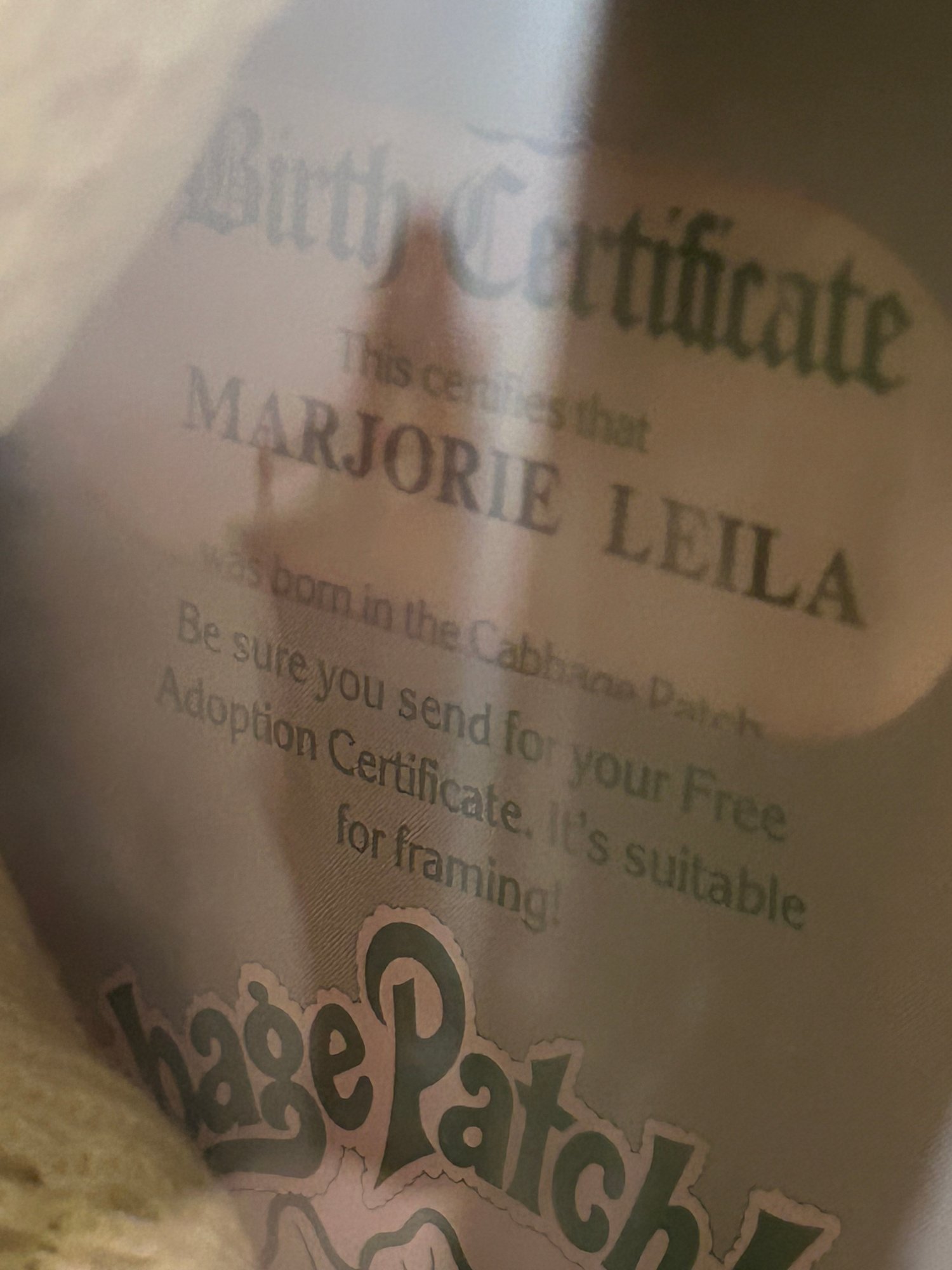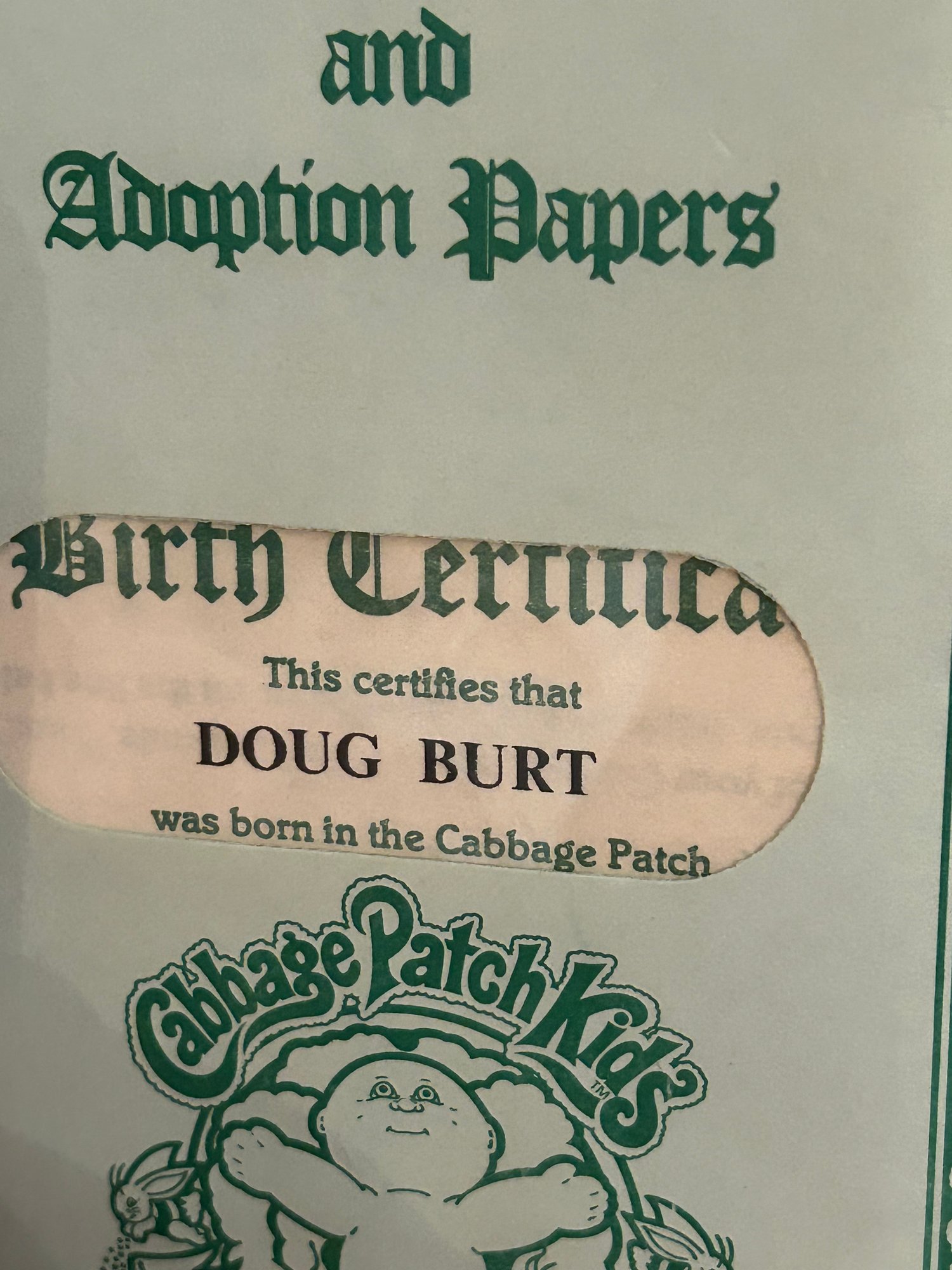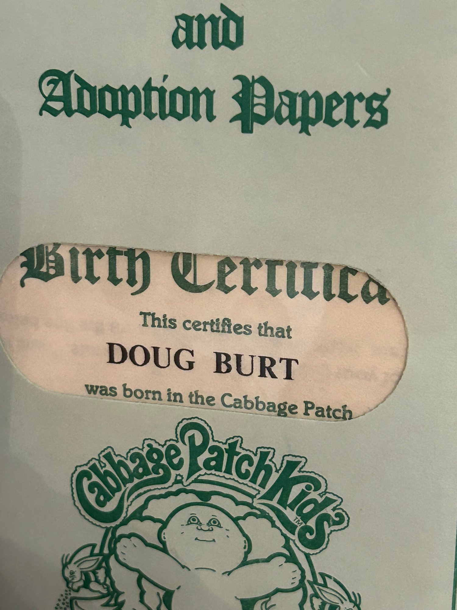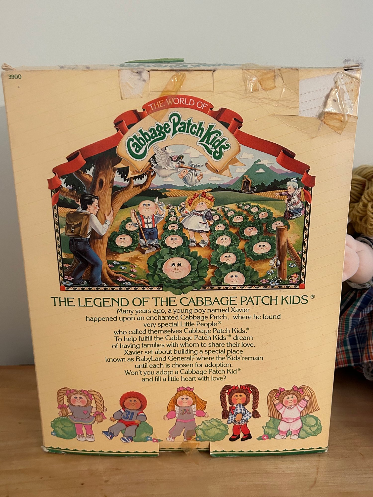 Two Cabbage Patch kids, one in original box. Both with birth certificate and adoption papers. Box 15 inches tall.