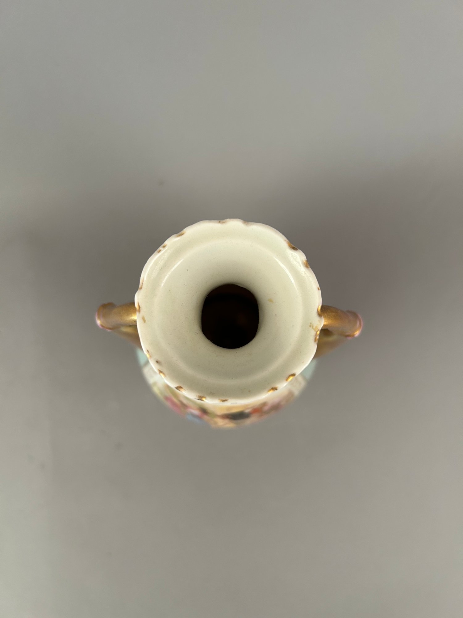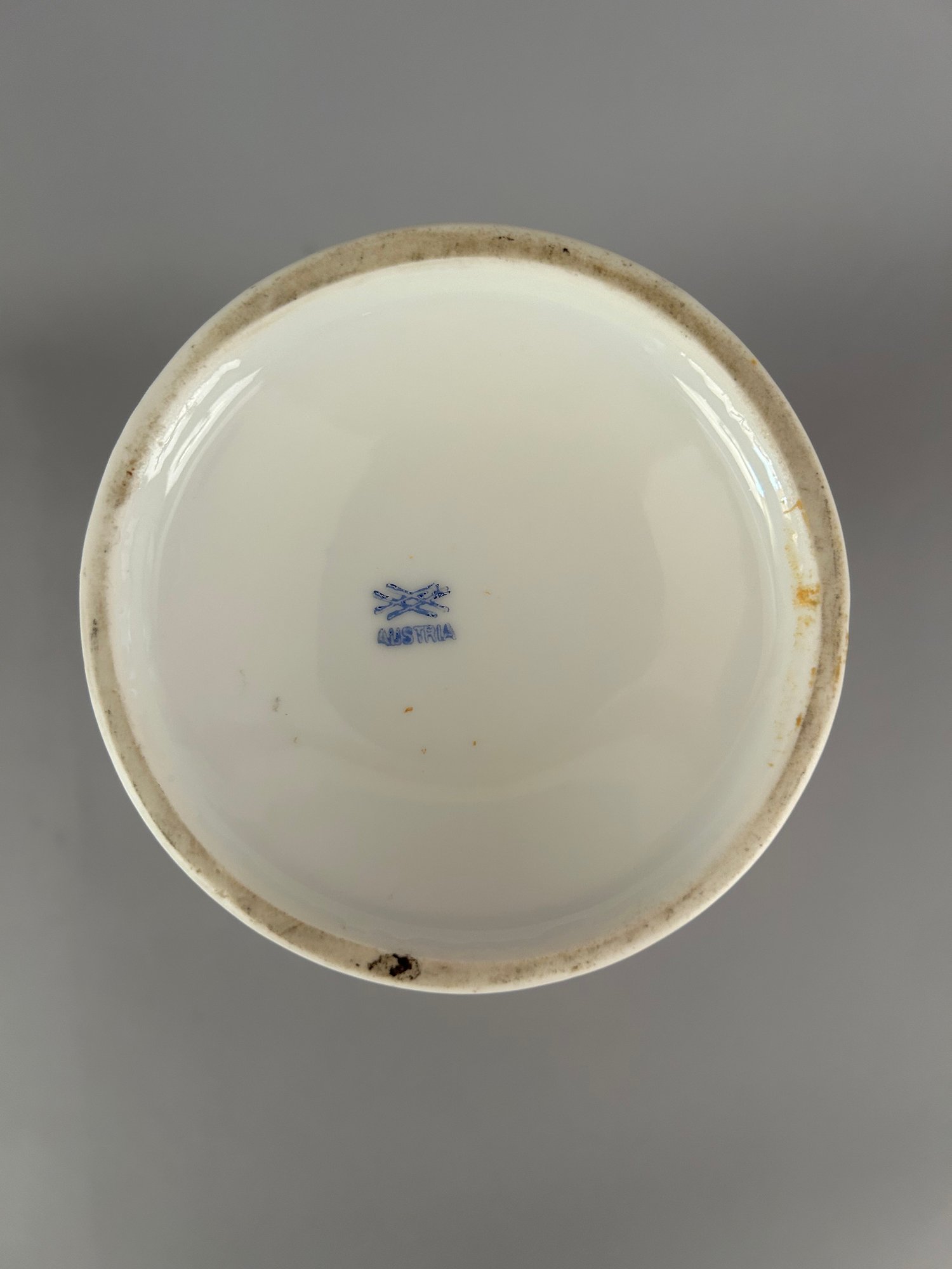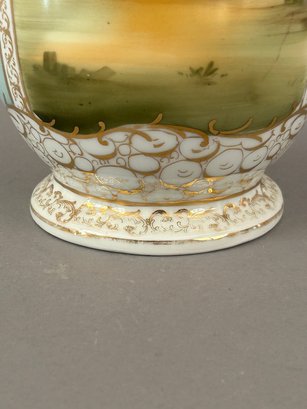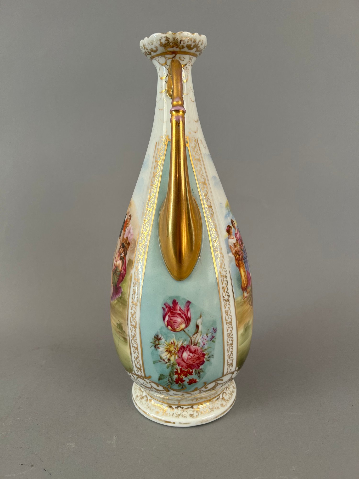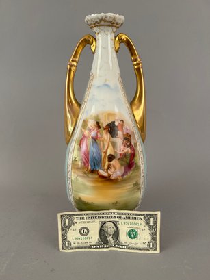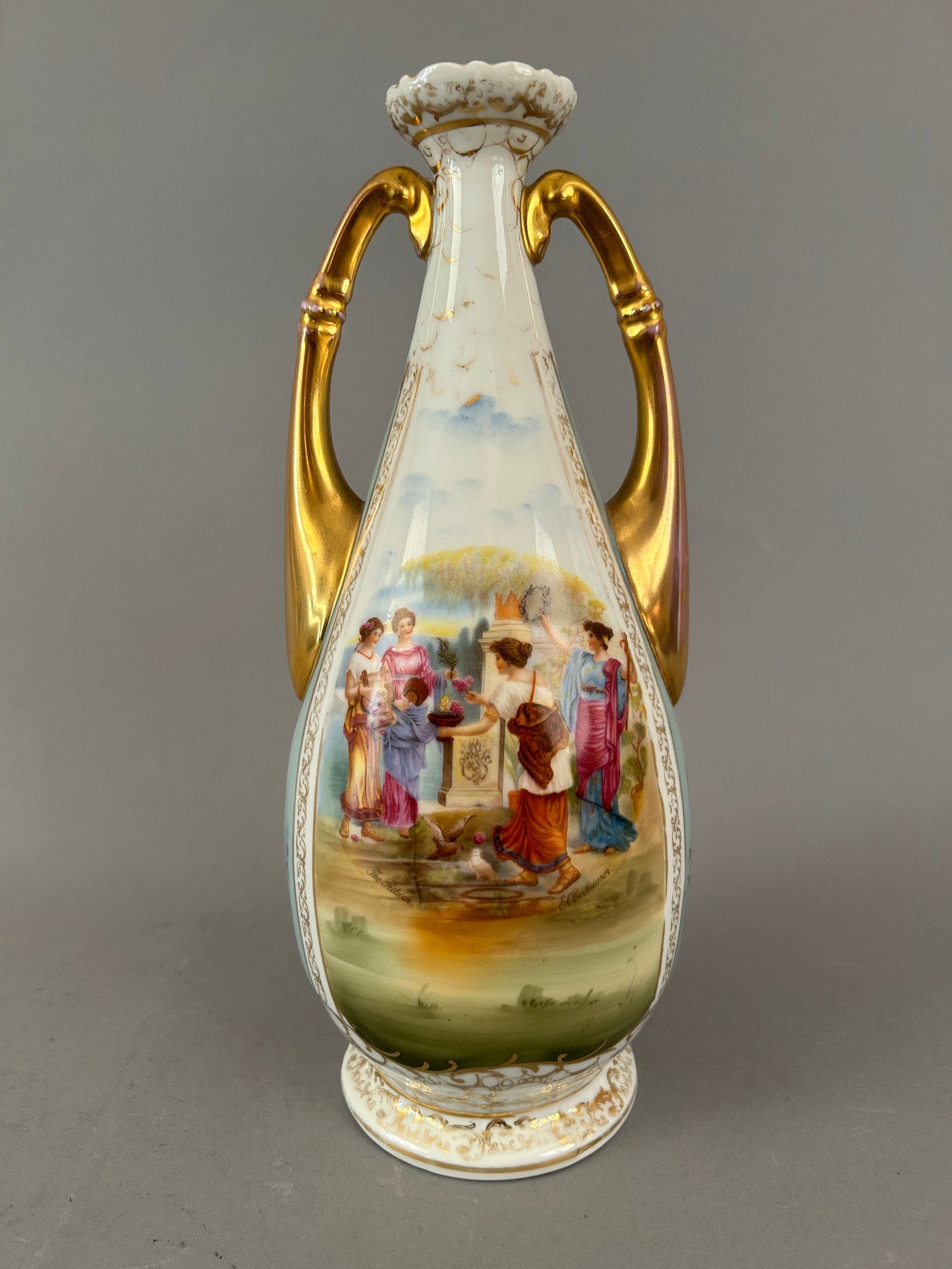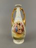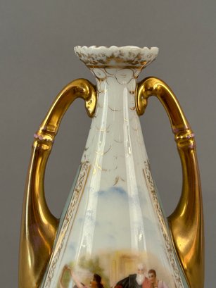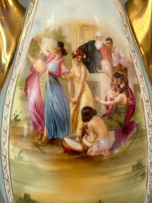 Two handled vase with different images on each side with the artists name signed in lower right. Marked Austria on bottom.