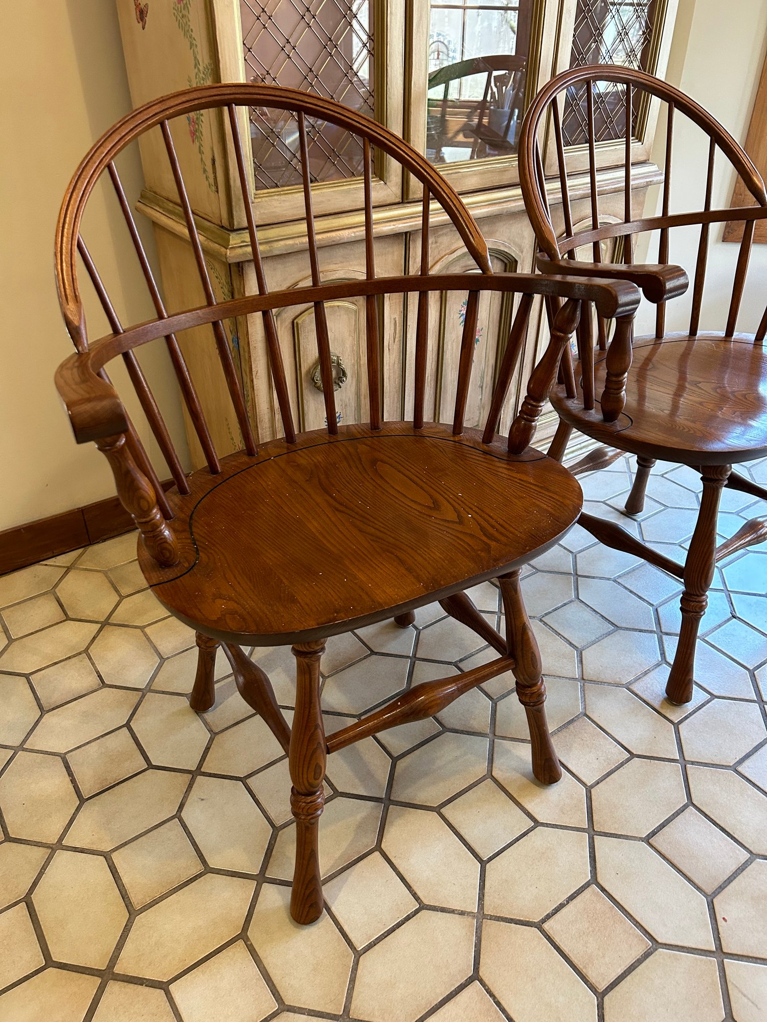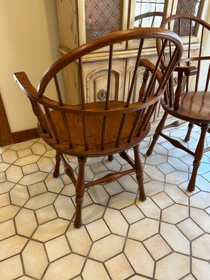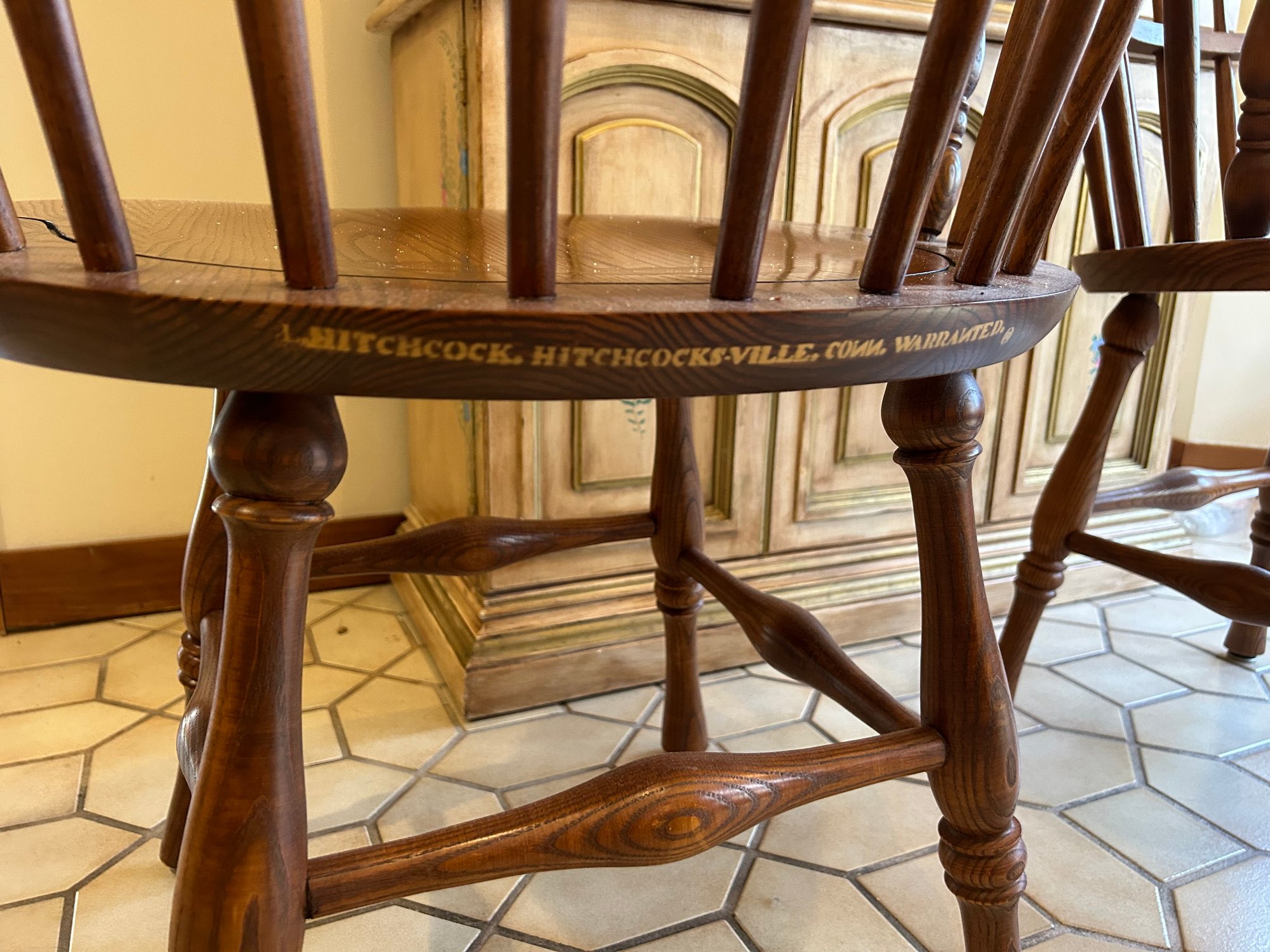 Two Hitchcock Windsor style chairs. Both with painted label on back of seat. 25“ x 18“ x 35“ tall.
