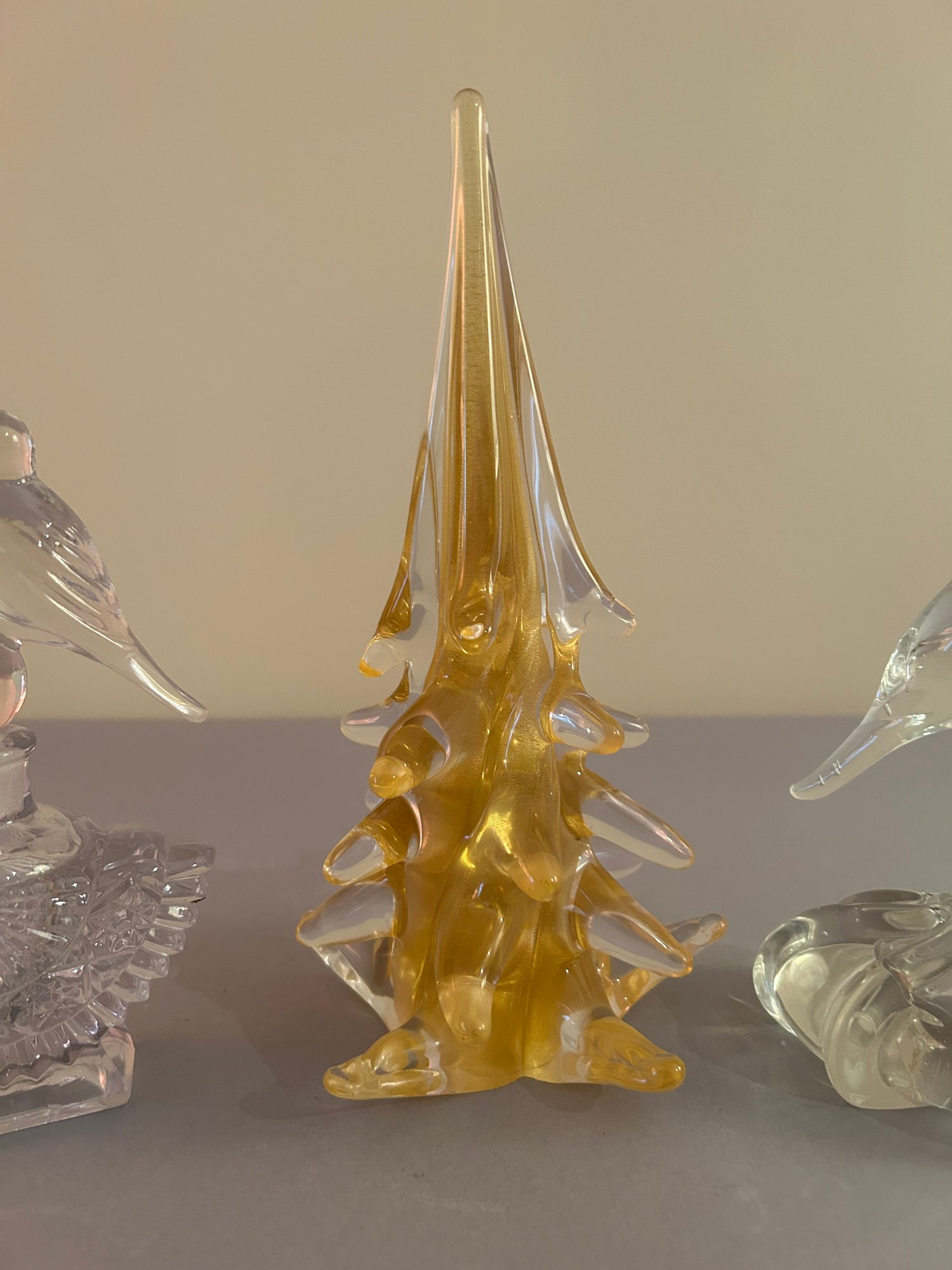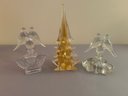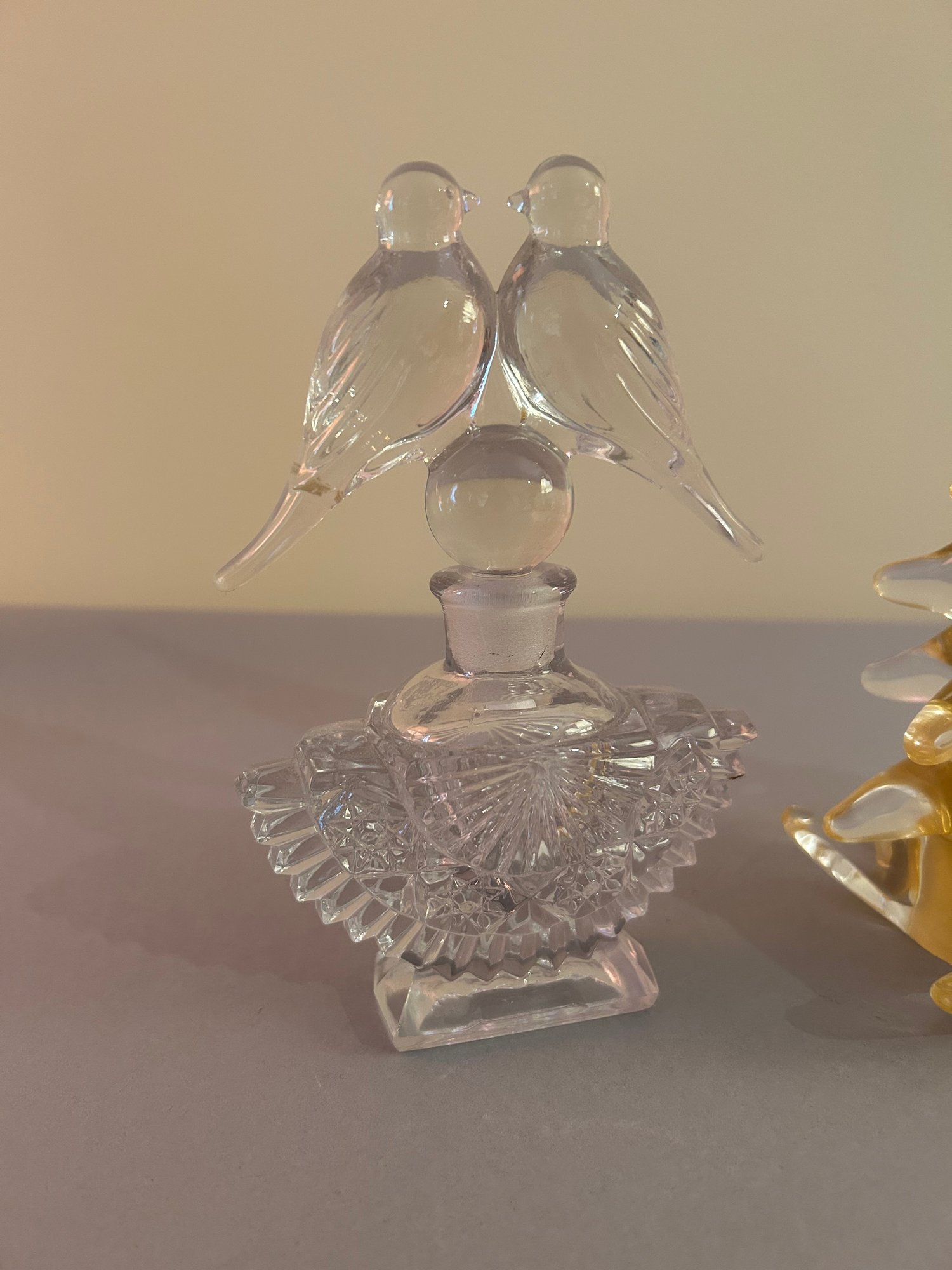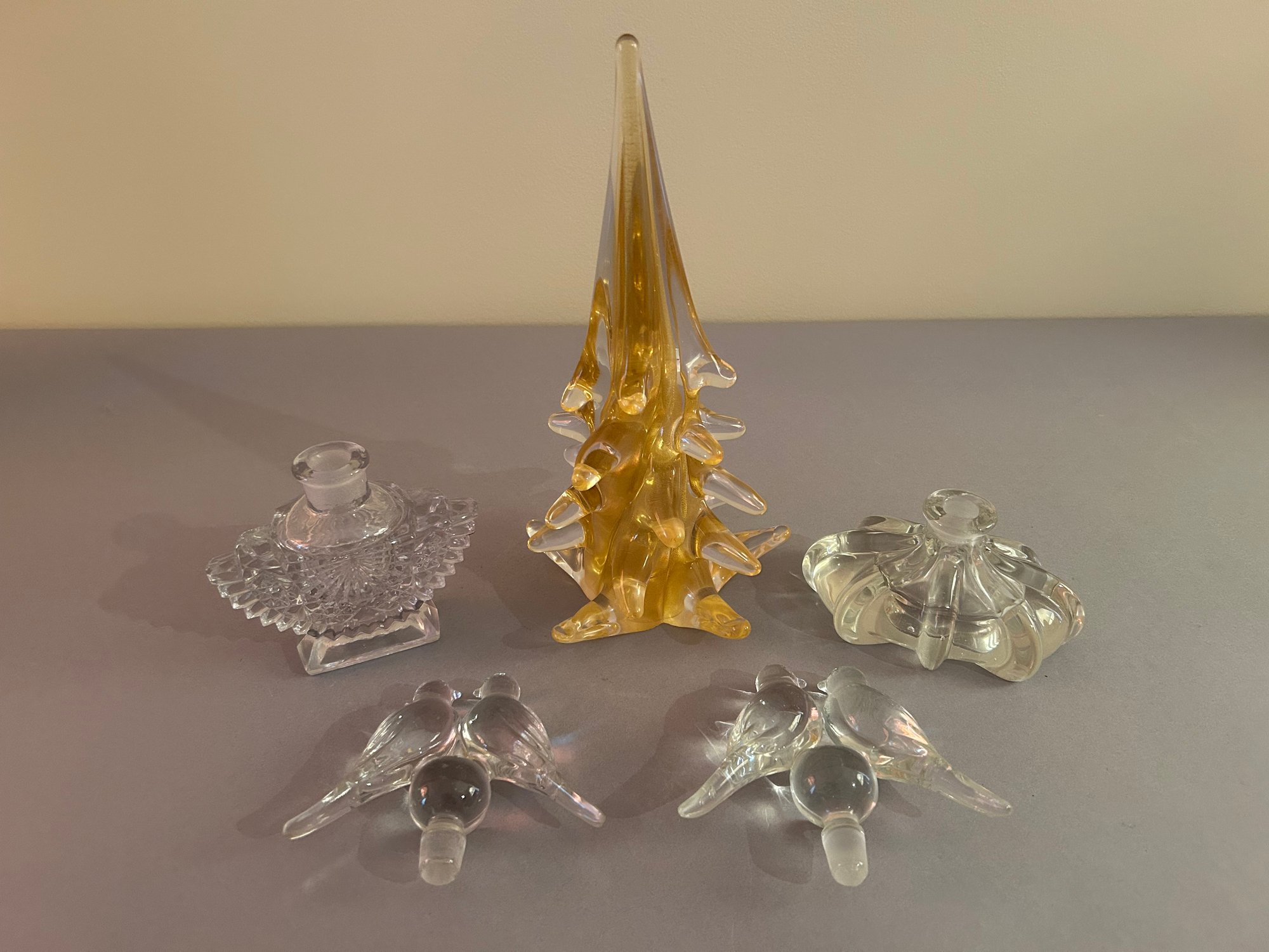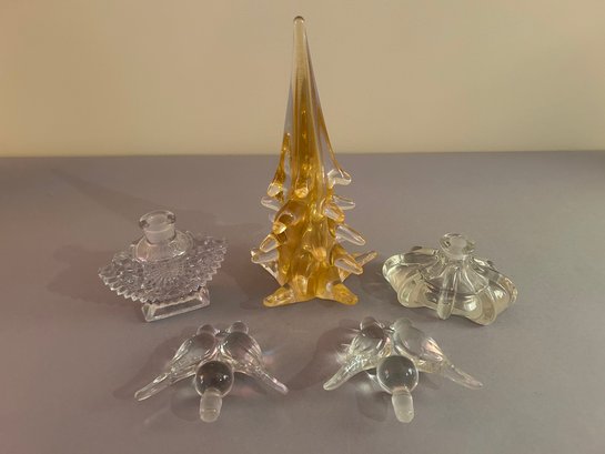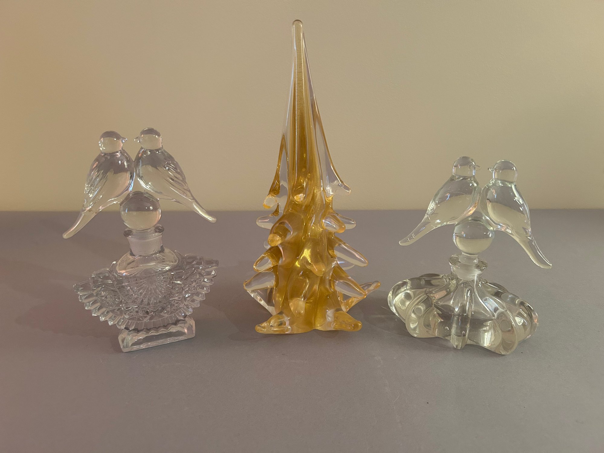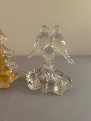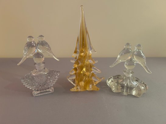 Two perfume bottles with bird stoppers and a Glass tree. Tallest 10 inches