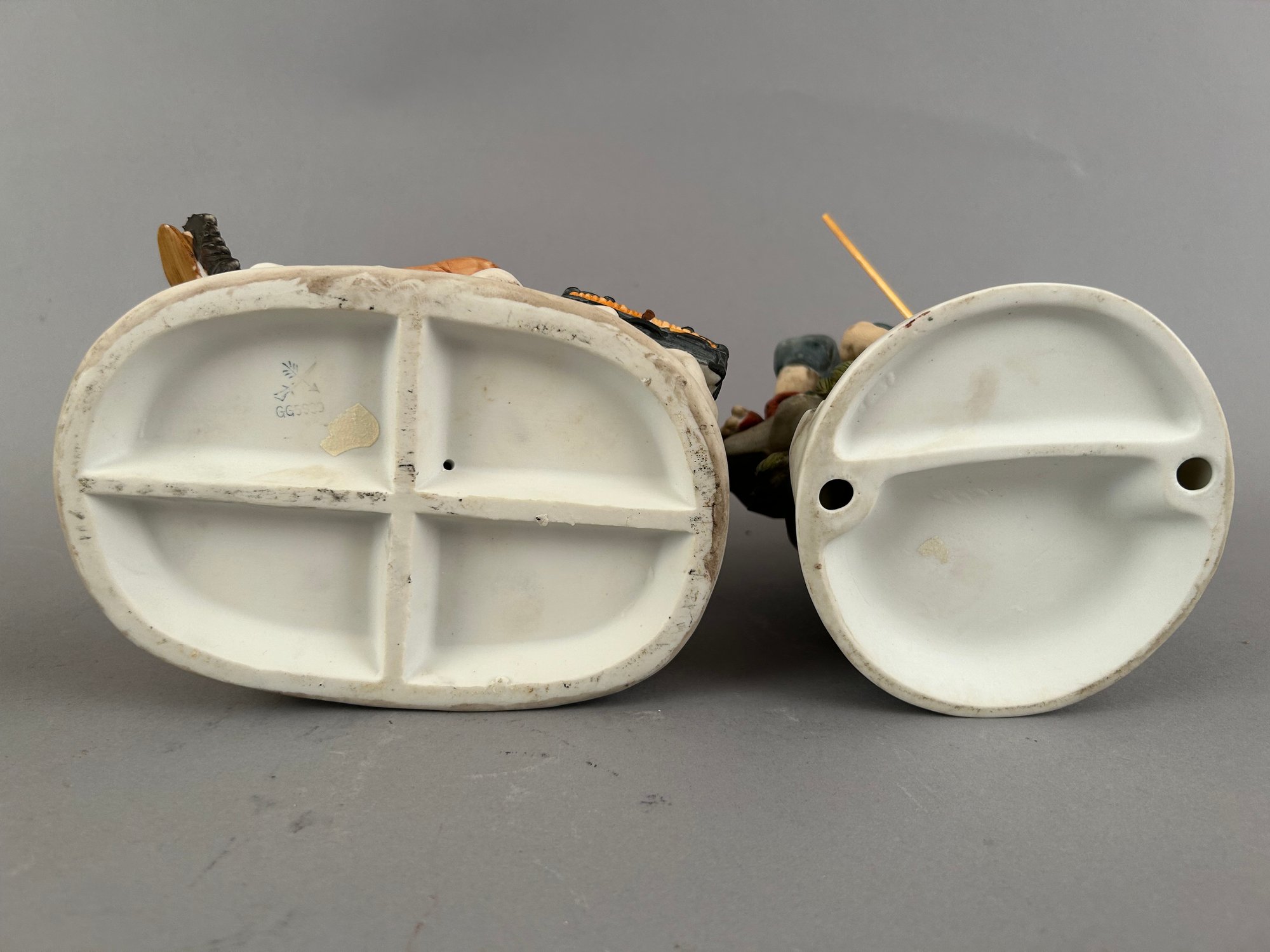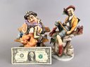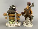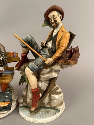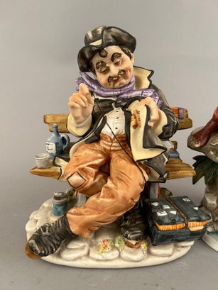 Two vintage bisque porcelain figures. One a homeless man sitting on a bench sewing his jacket. The other a man fishing.