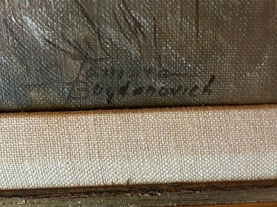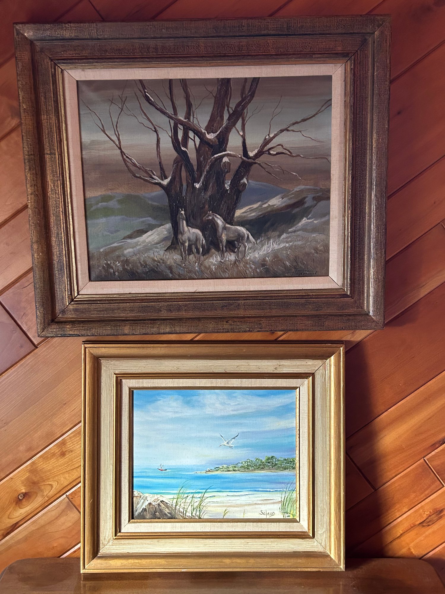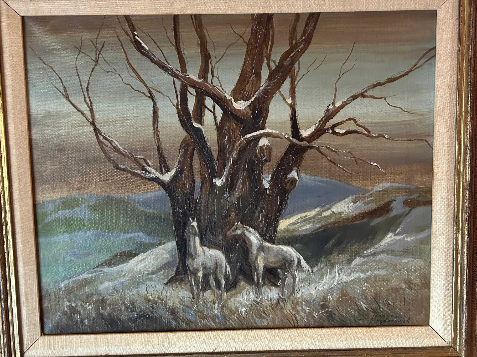 Two vintage oil paintings. One horses in front of large tree signed Tamara Boydanovich lower right.