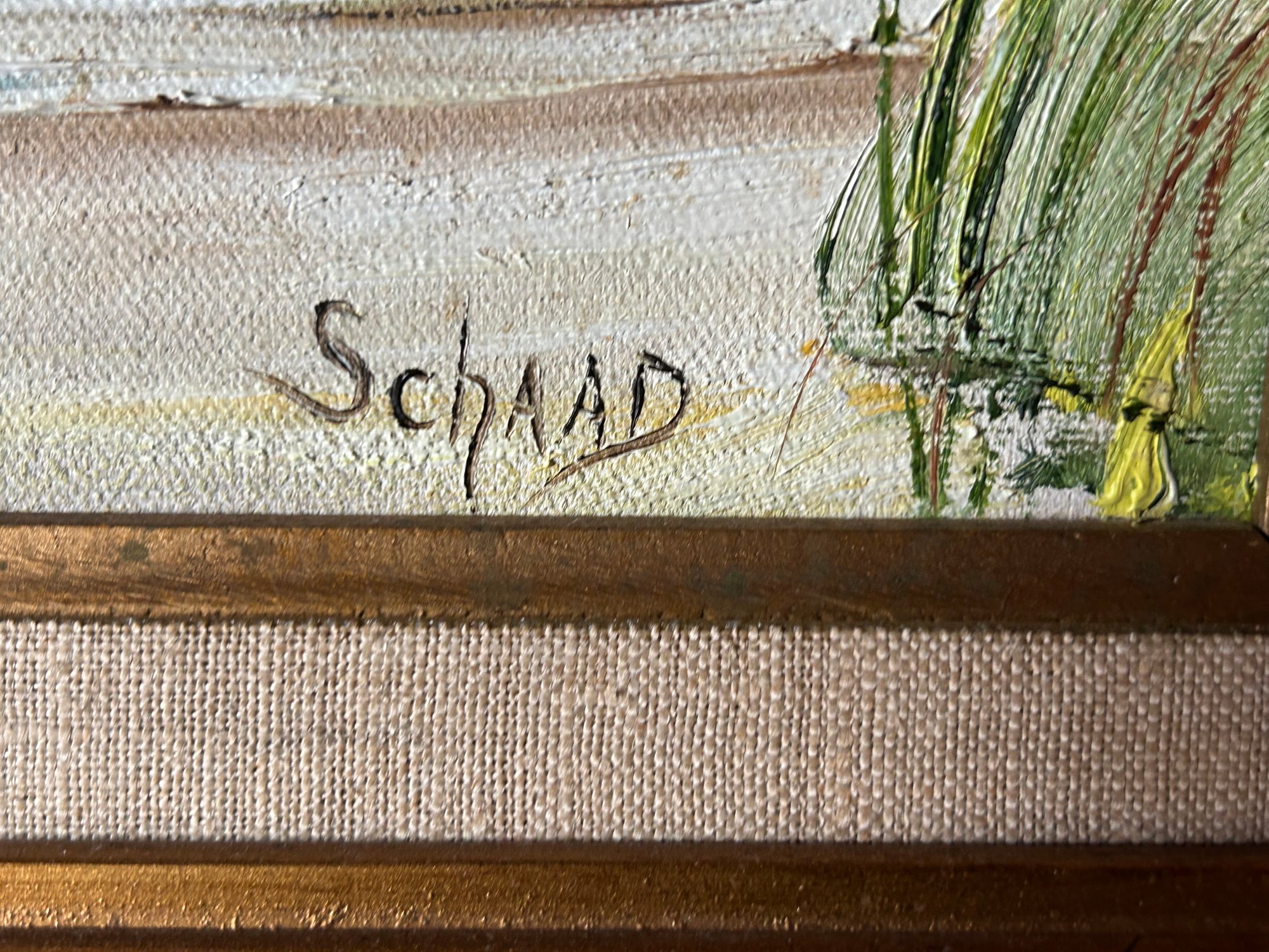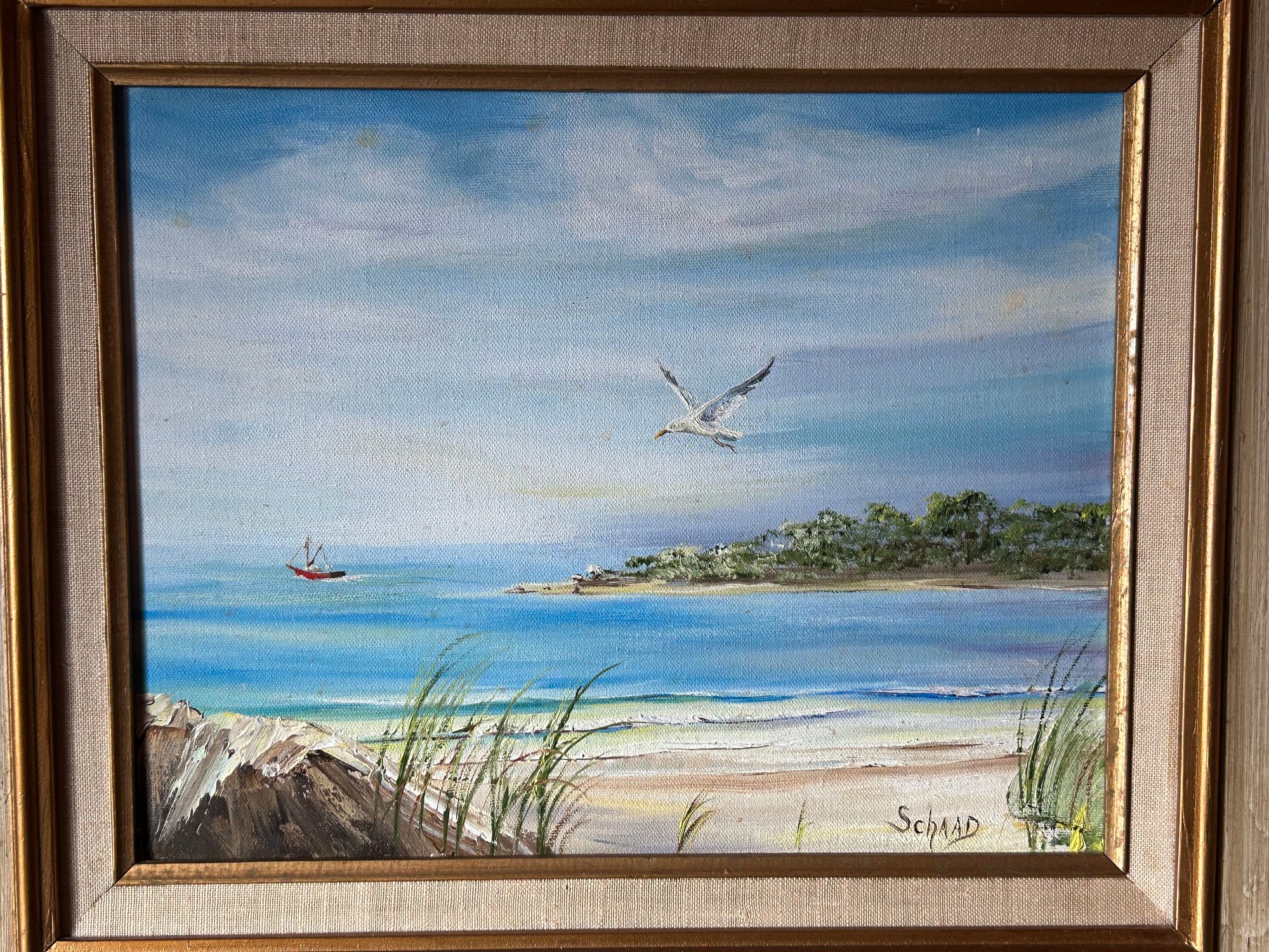 The second seaside painting with seagulls and a boat signed Schaad lower right. Larger painting, including frame, 23 1/2 x 28