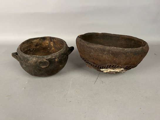 Two vintage pottery bowls, one with ornate decorations