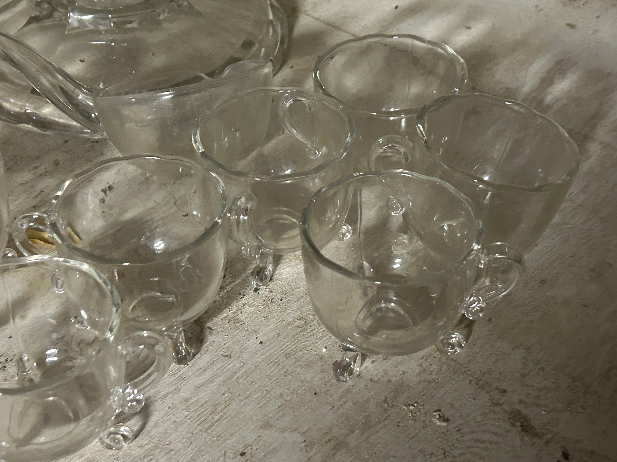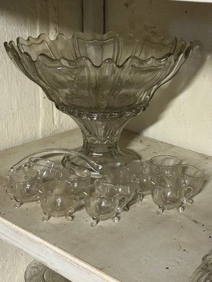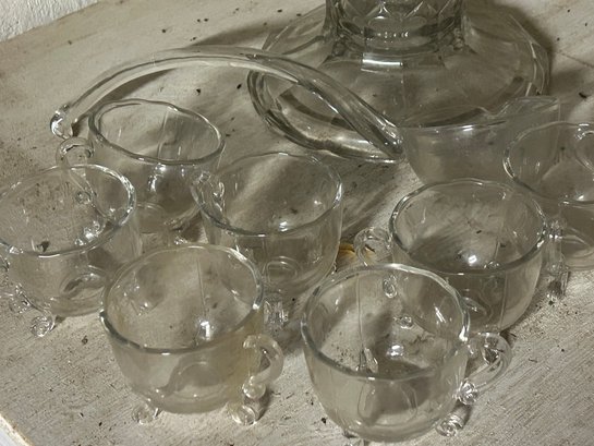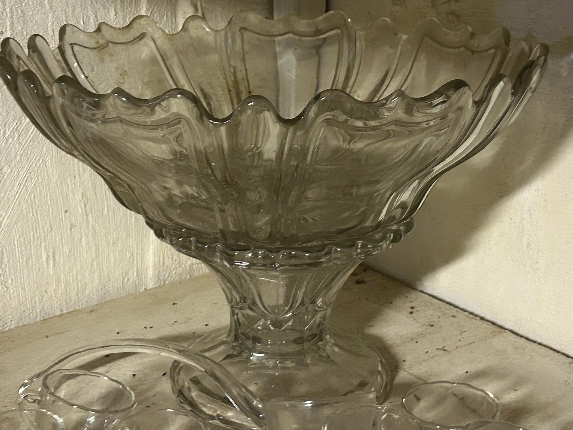 Punch bowl set #1. Large punch bowl with 10 cups and glass ladle. Punch bowl in two pieces. Bowl measurements 12 1/2 inches tall. Very good condition.