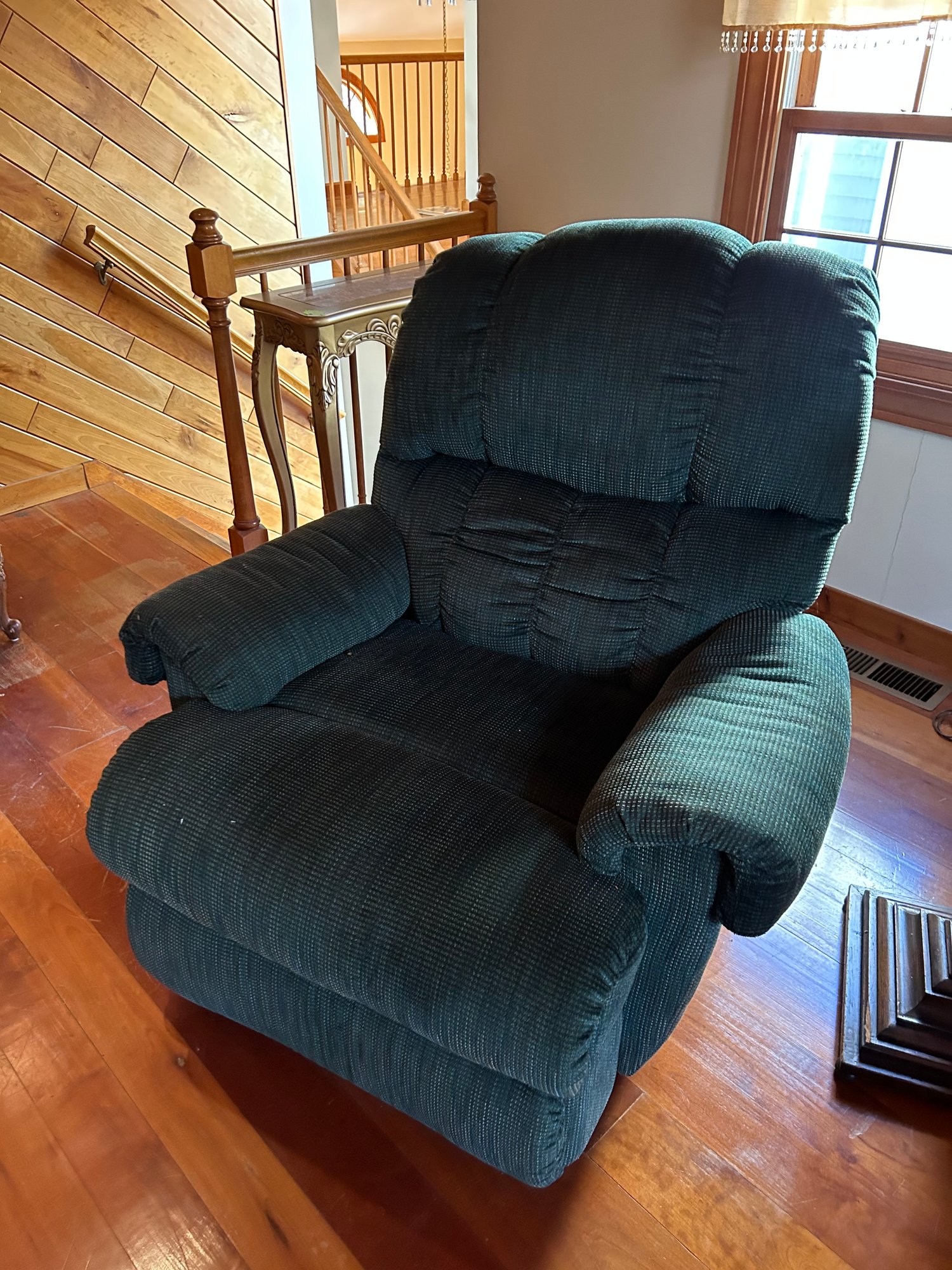 Upholstered reclining, rocking arm chair very good condition. 40 inches wide 40 inches deep 40 inches tall