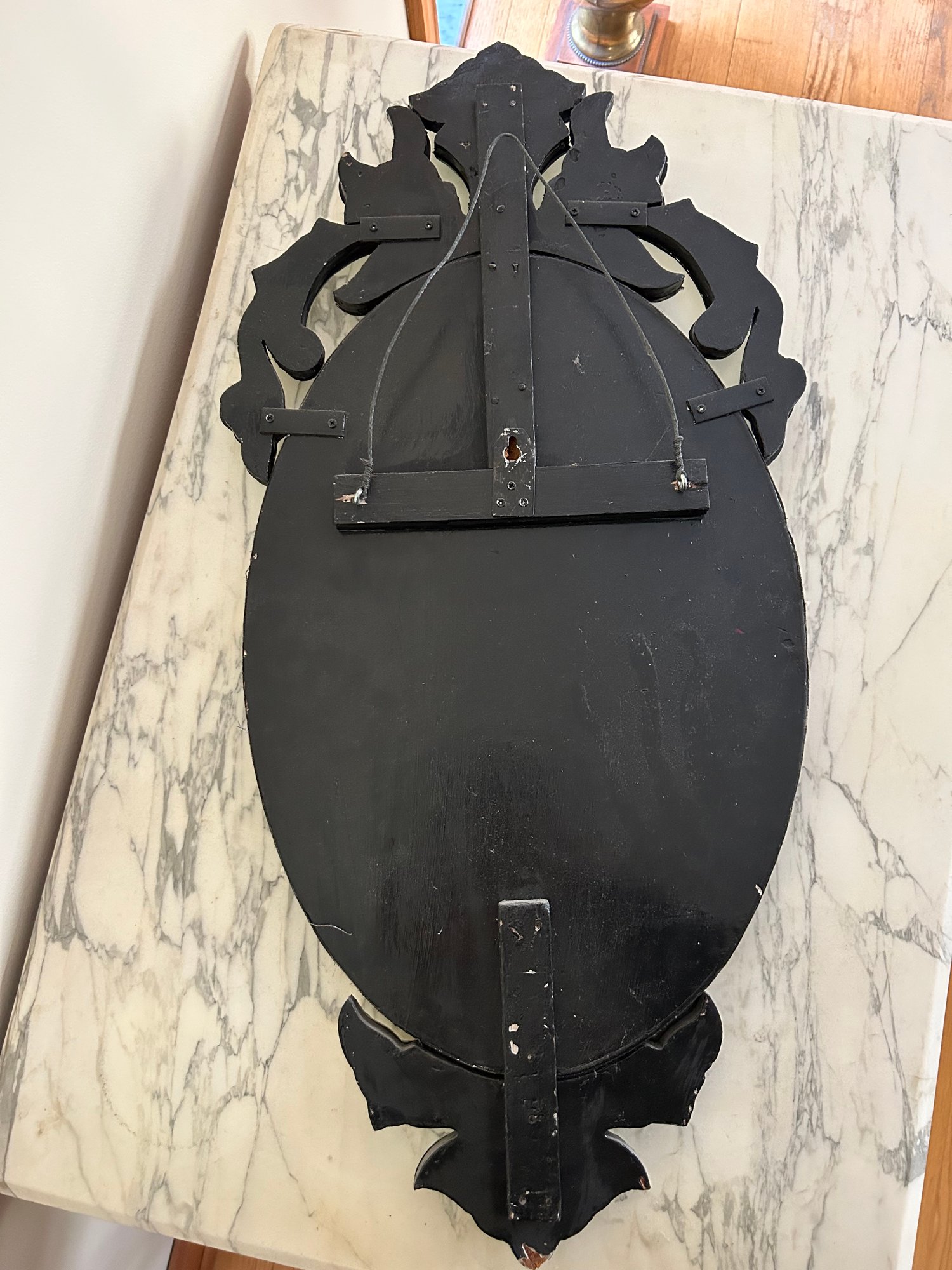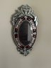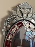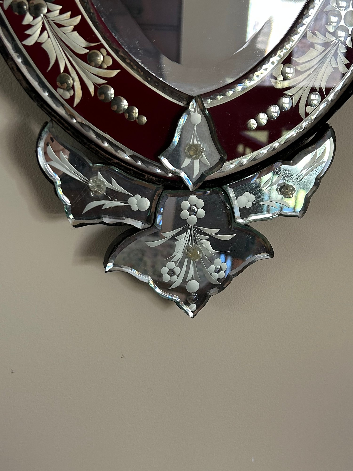Venetian glass mirror with cranberry glass, beveled glass, etched design. 15 inches wide by 30 inches.