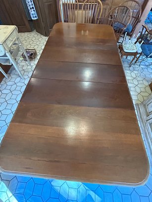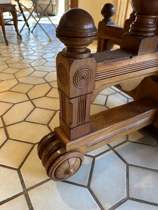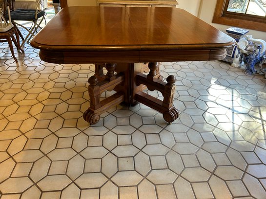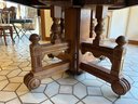 Victorian Eastlake walnut extension table. Carved detail in base. Table opens up to 93 inches. Includes four leaves. 44“ x 44“ x 28 1/2“ high.