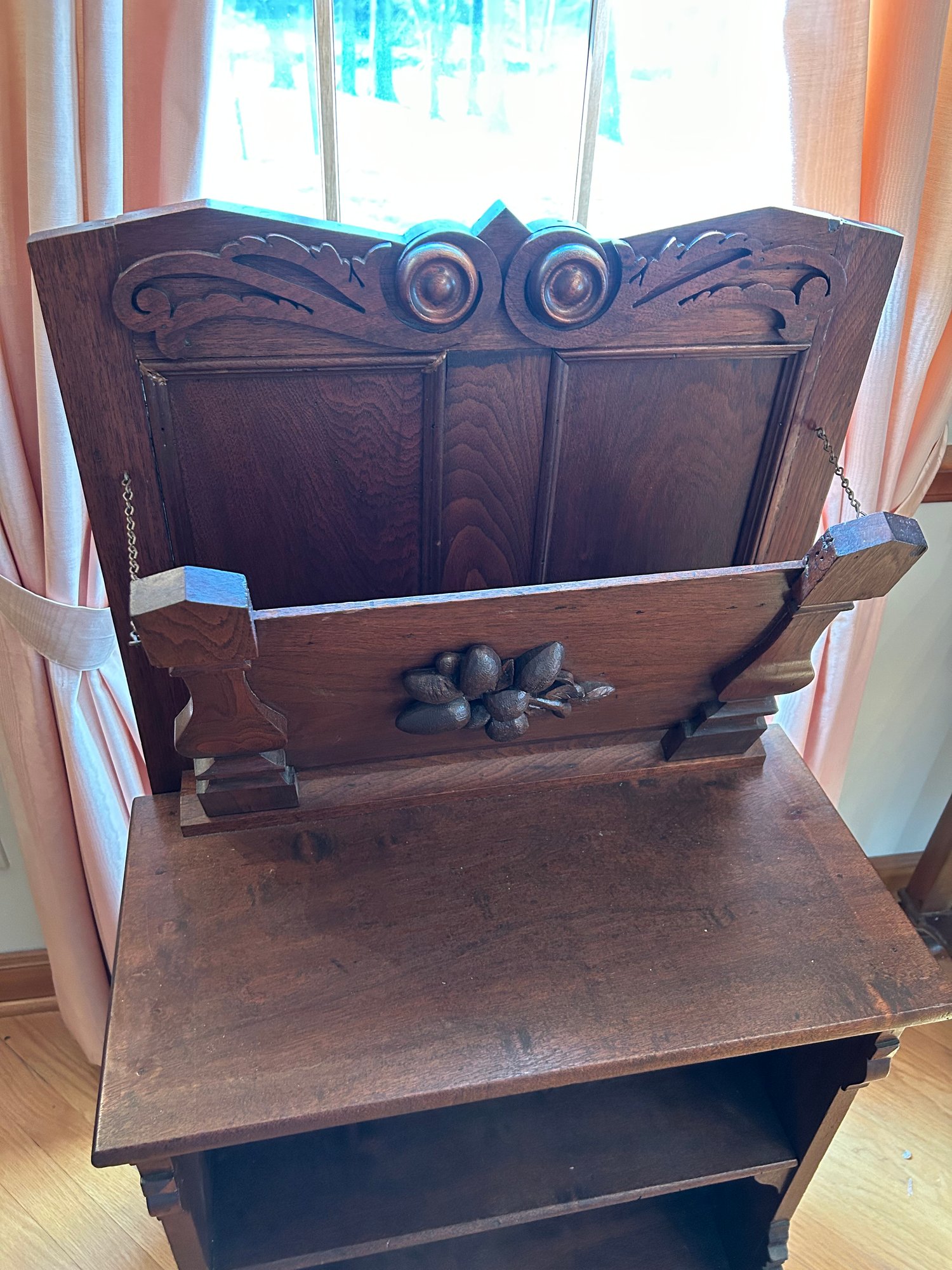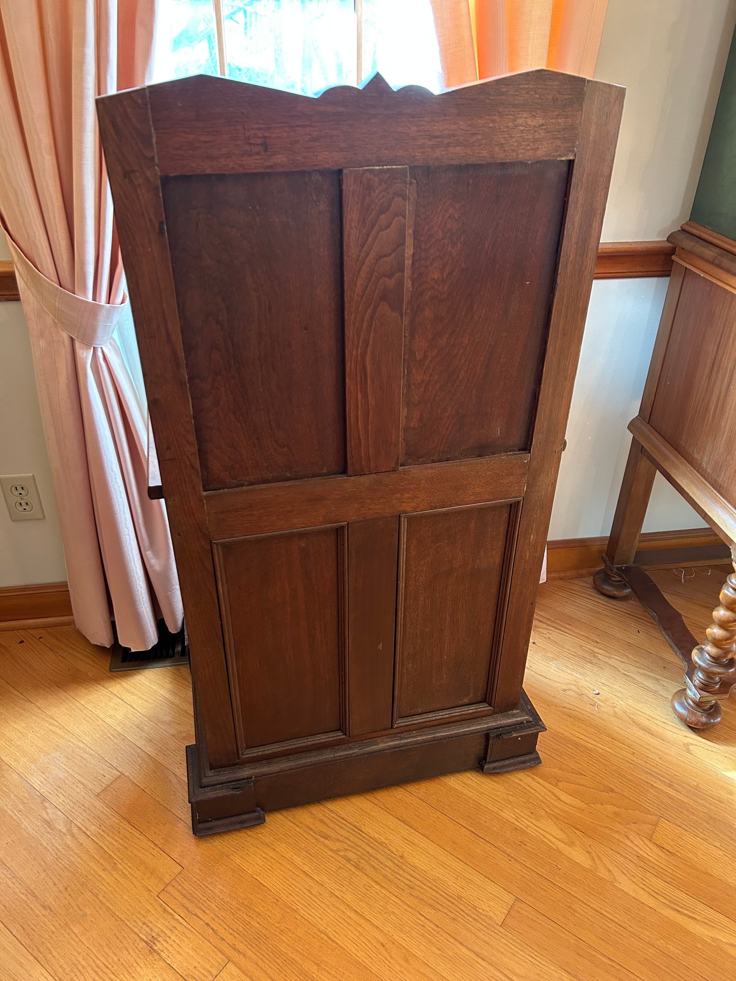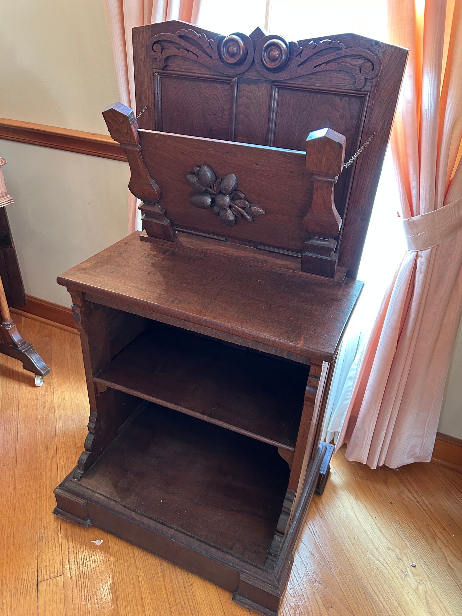 Victorian shelf/wall pocket unit. Wall pocket top section shelf on bottom. Backside paneled. Walnut 25 inches wide 19 inches deep 45 inches tall.