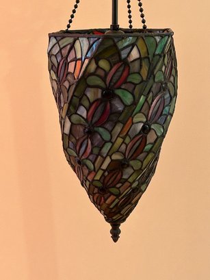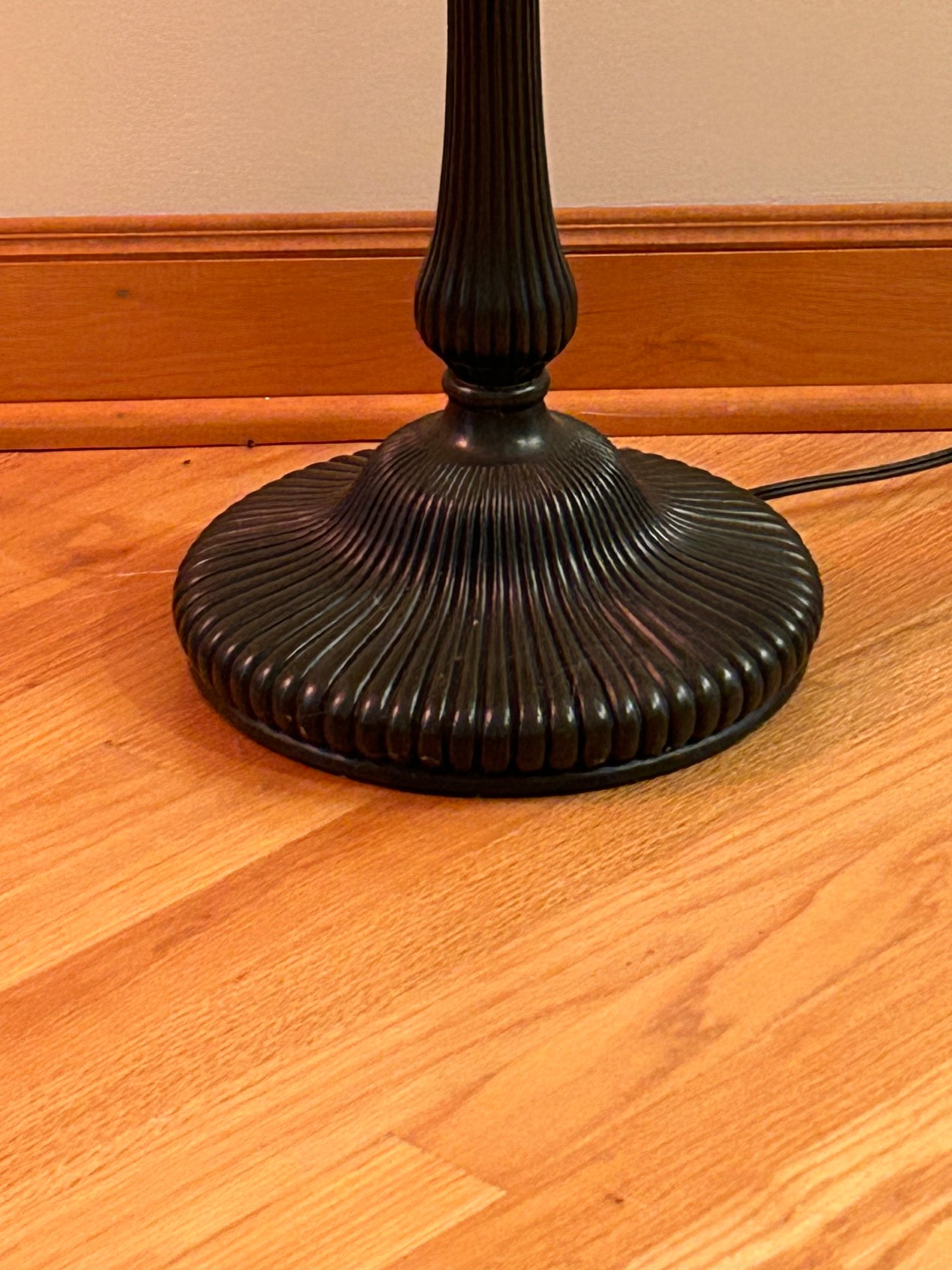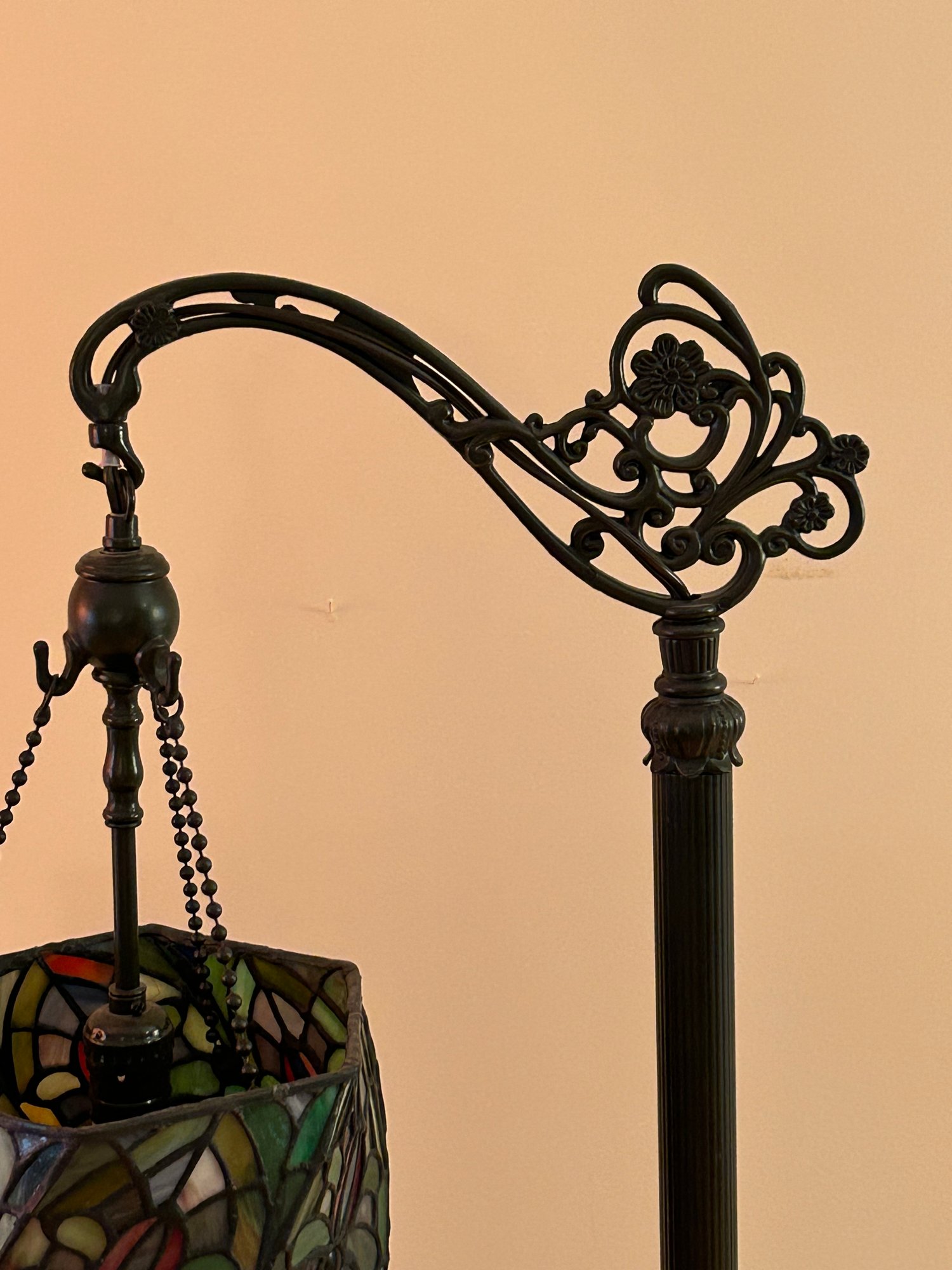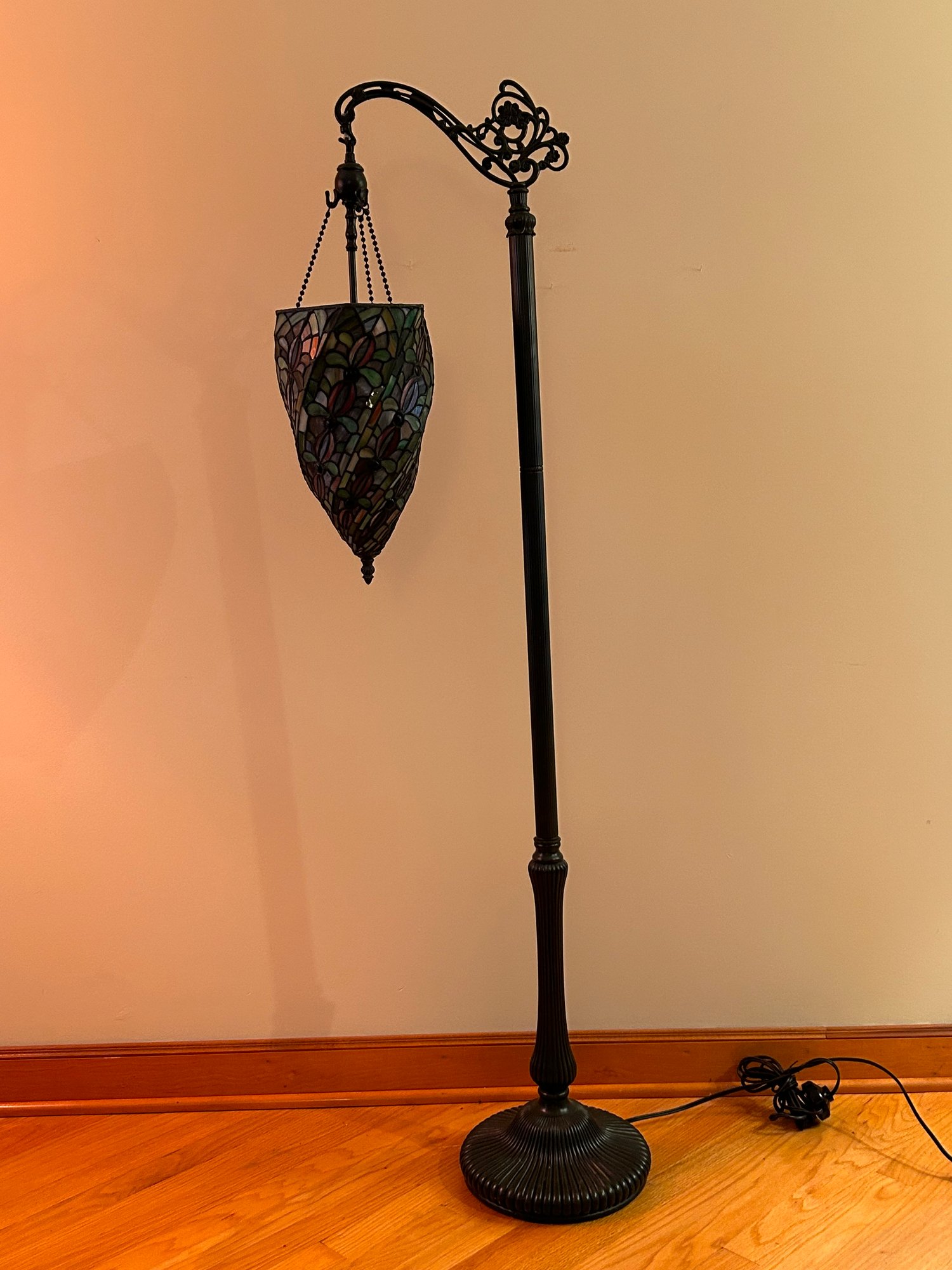Victorian style stained glass floor lamp. Metal shaft with scrolled detail, nicely done stained glass shade. 60x16 inches