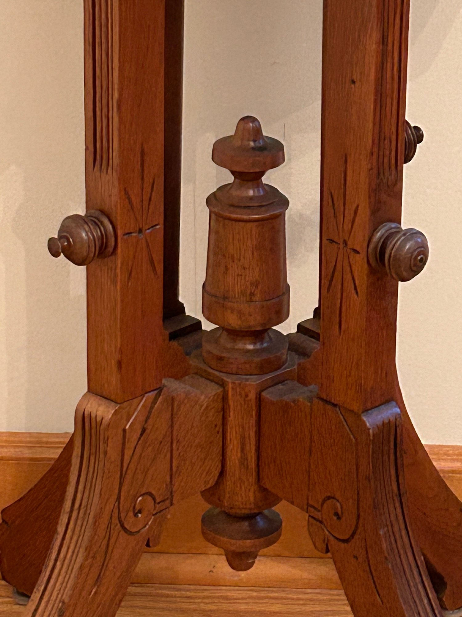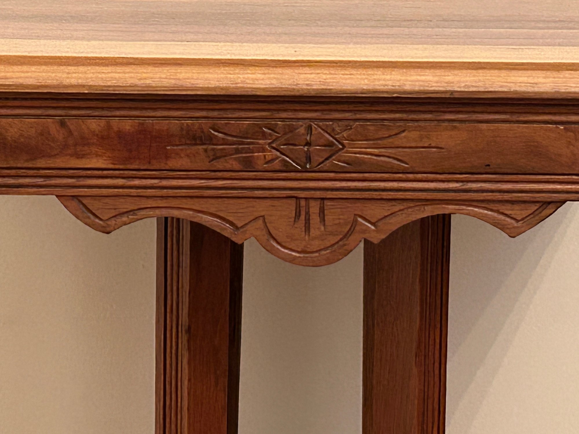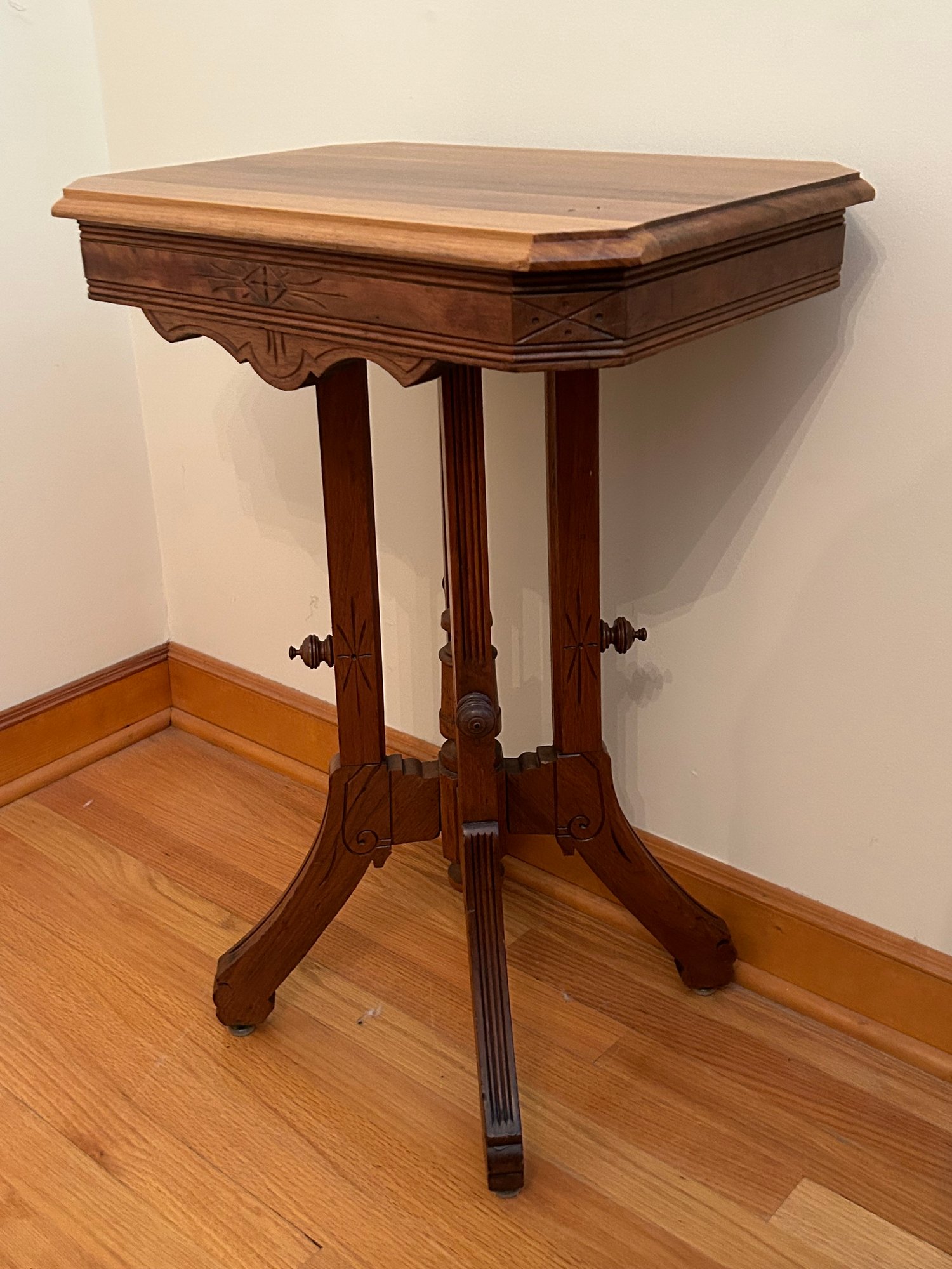 Victorian Walnut end table with carved details, center finial, cut corners. 21“ x 15“ x 29“ tall.
