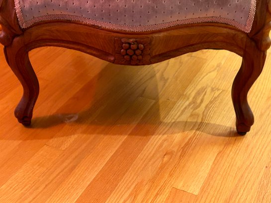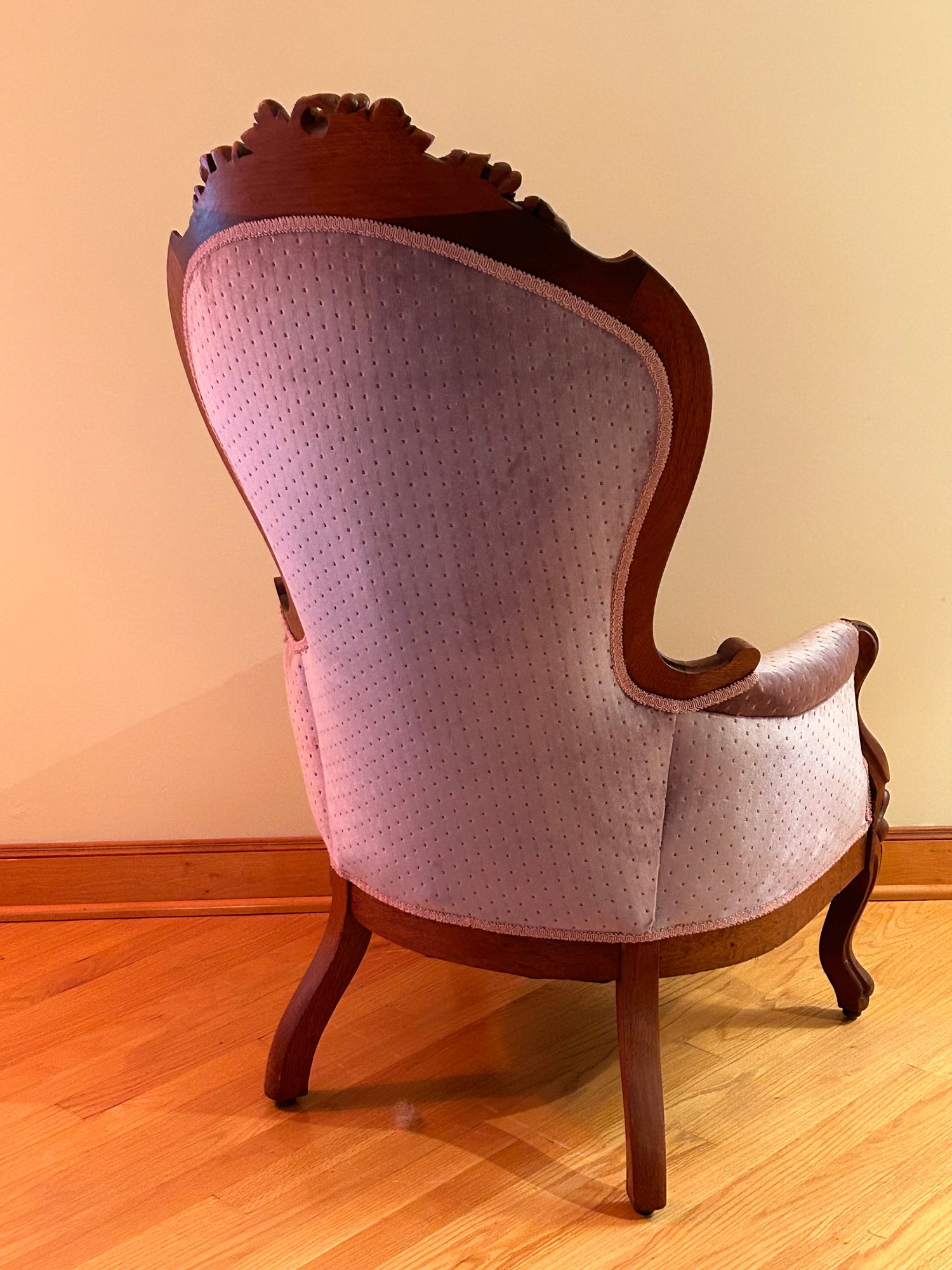 Victorian walnut upholstered armchair with carved grape pattern on crest and stretcher. New lavender upholstery. Chair is in excellent condition. 26 inches wide by 24 inches deep by 45 1/2 inches tall.