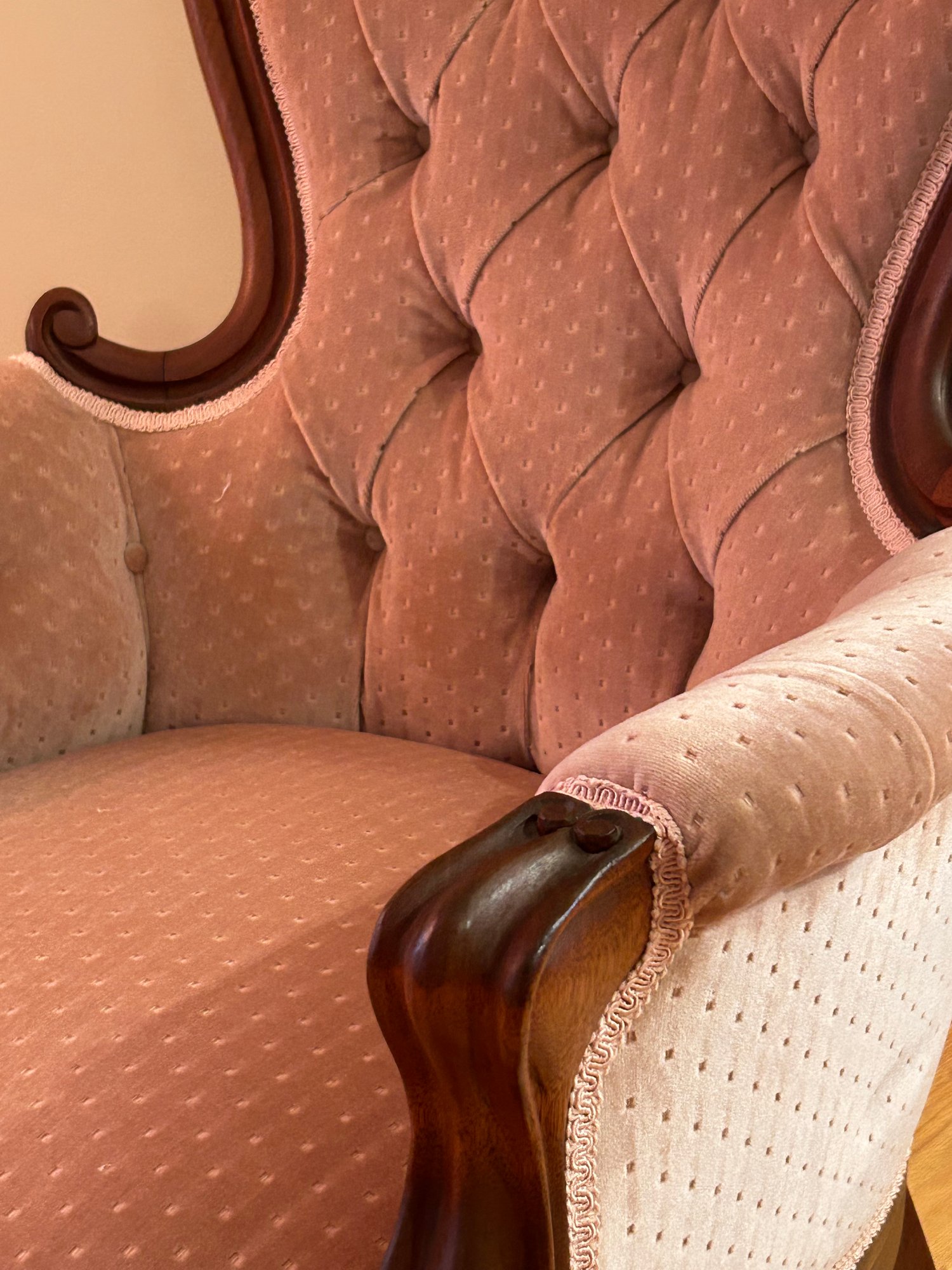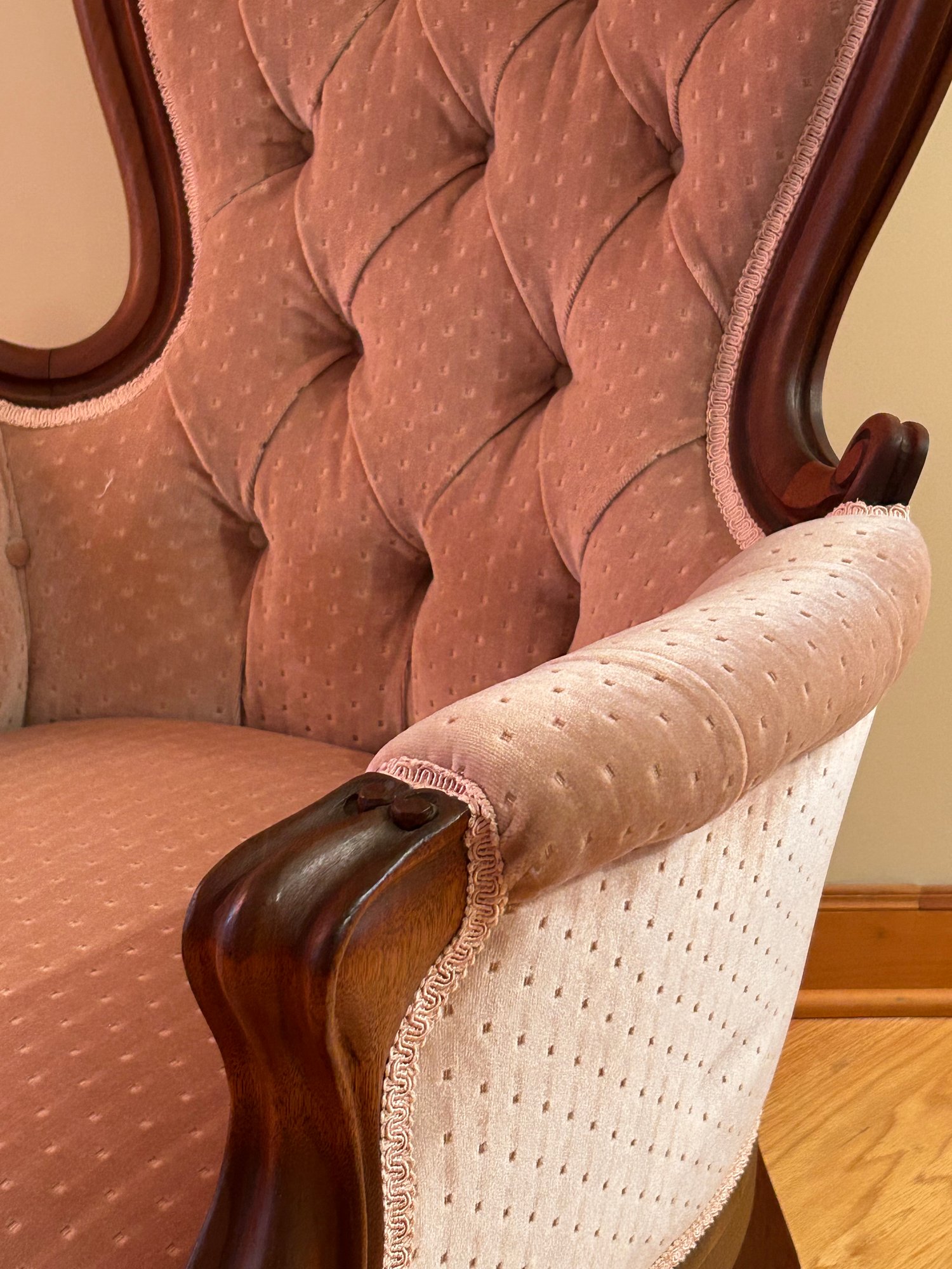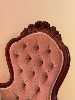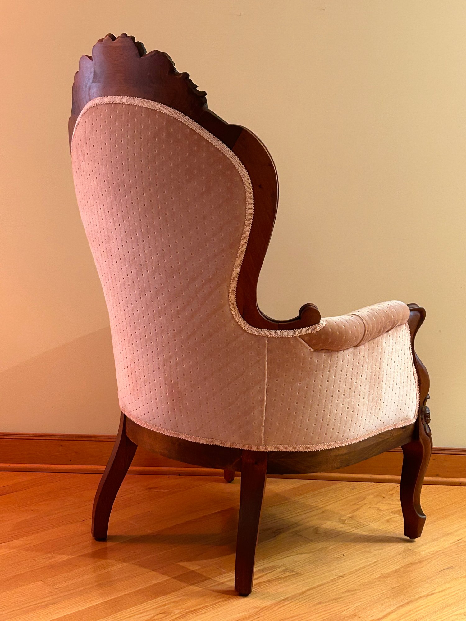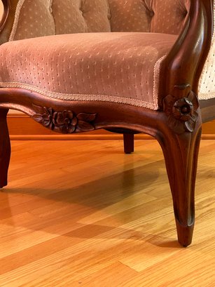 Victorian walnut upholstered armchair with floral carved crest, arms and skirt. Newer upholstery, excellent condition. 44x29x30 inches