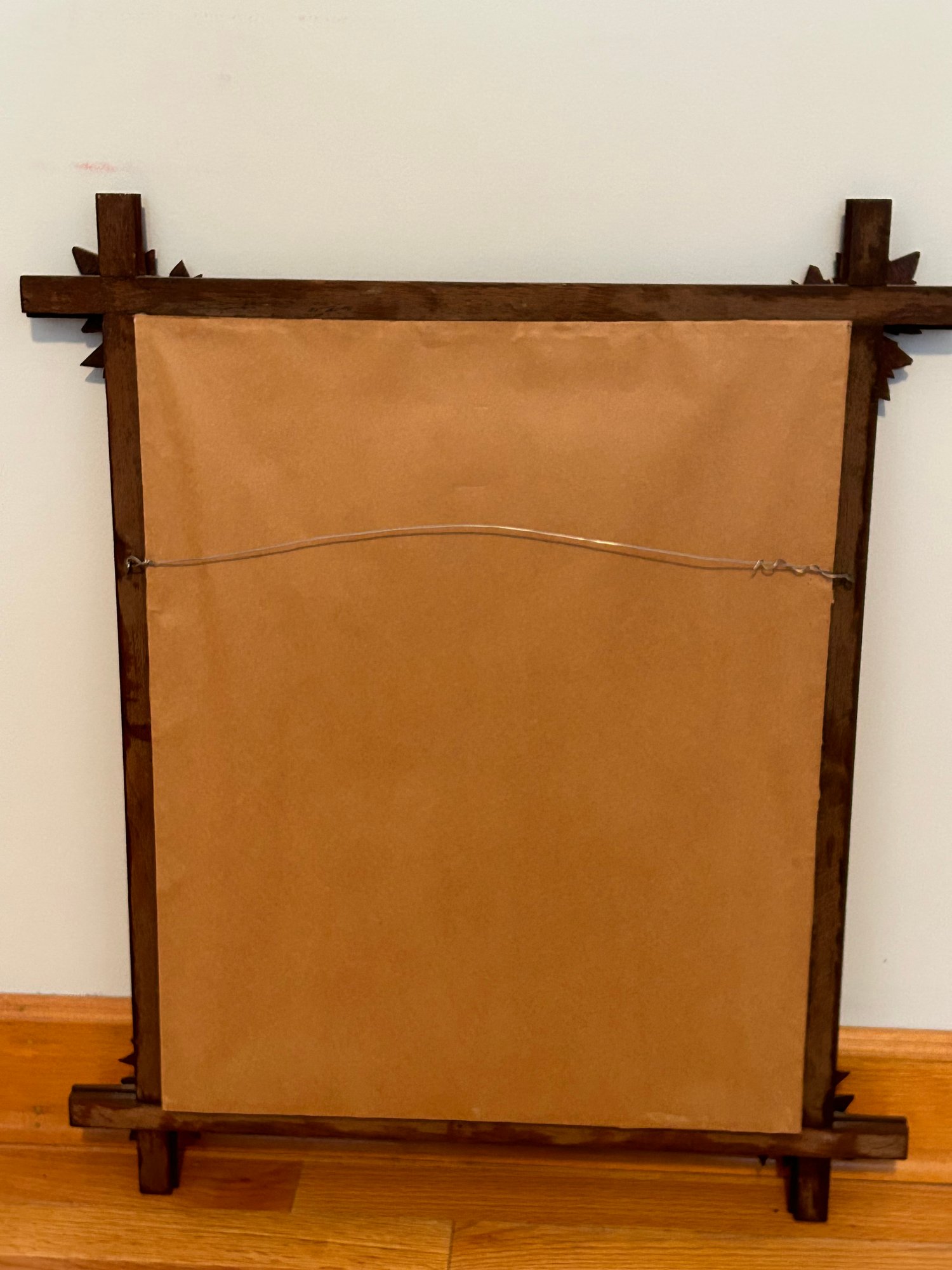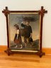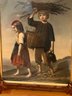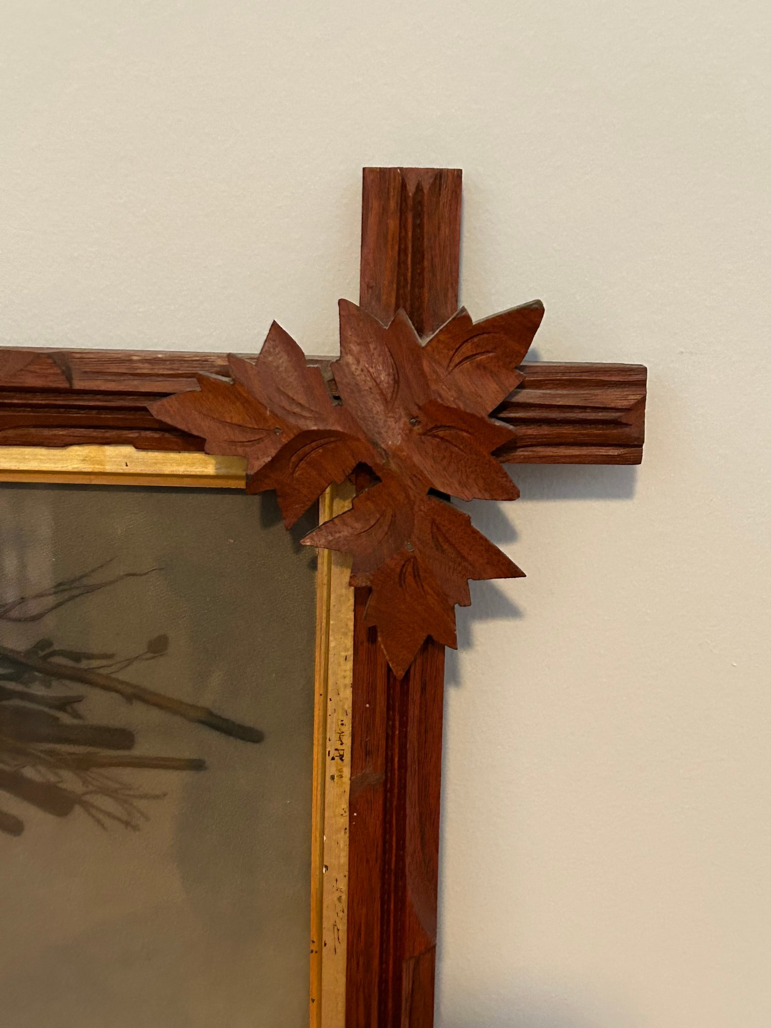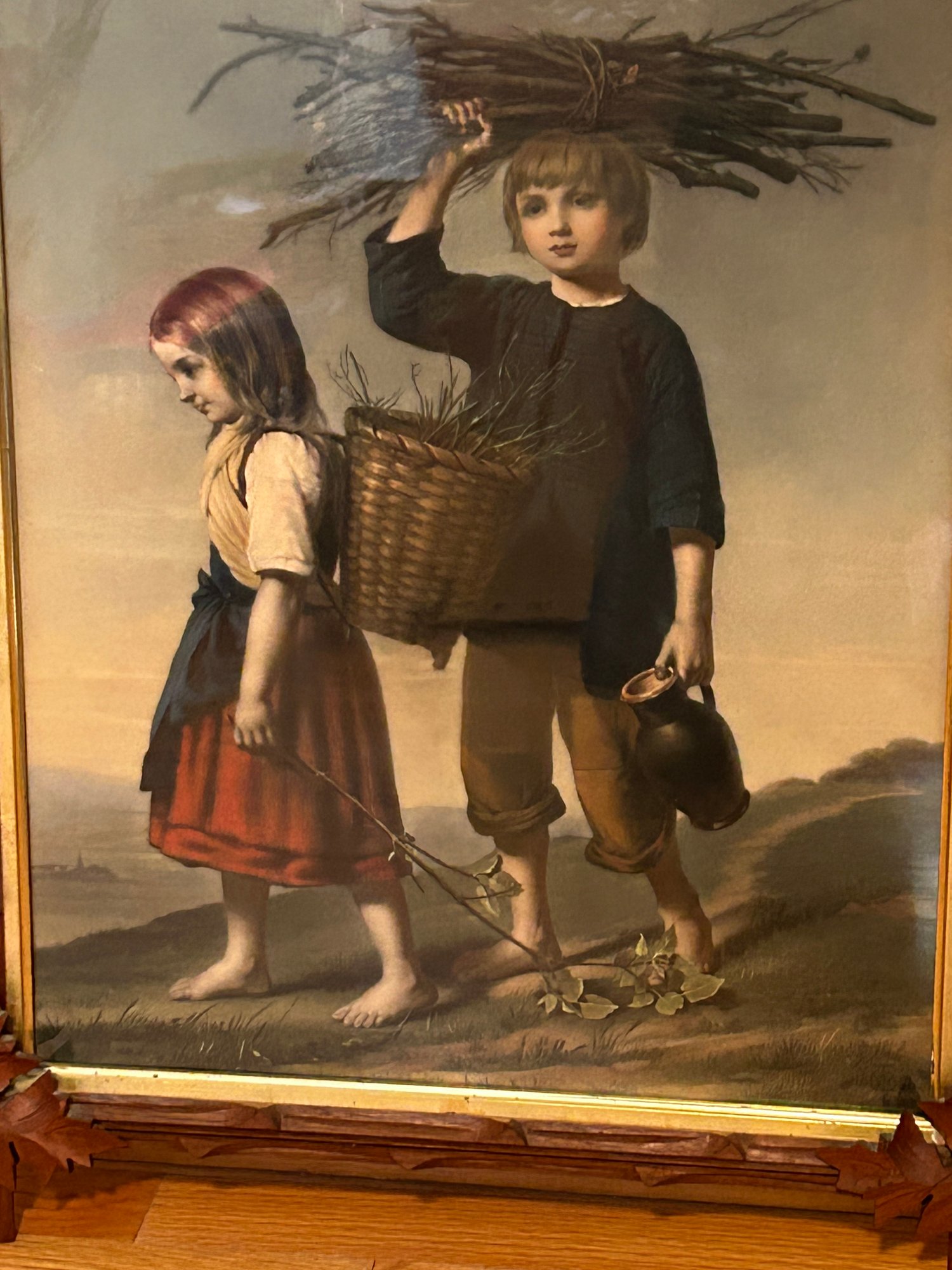 Victorian walnut frame with Oakl eaf corners and gold insert. Print of two children, one carrying wood and one with basket 26” x 24 1/2”.