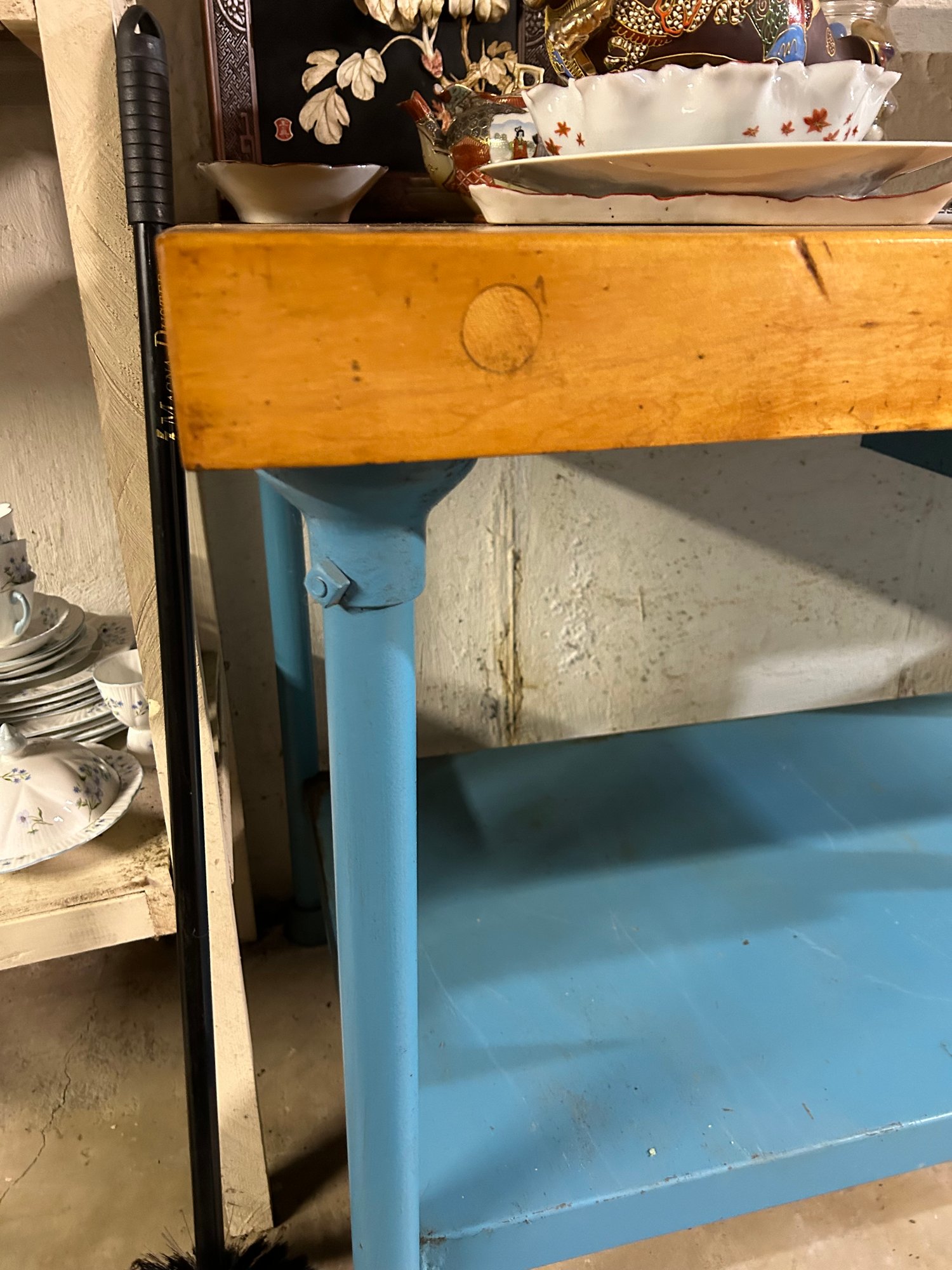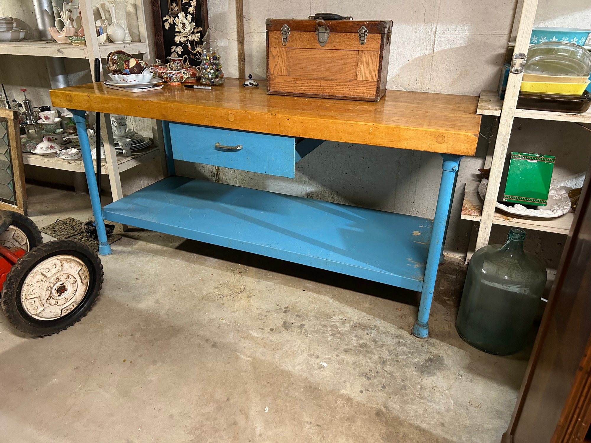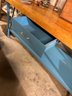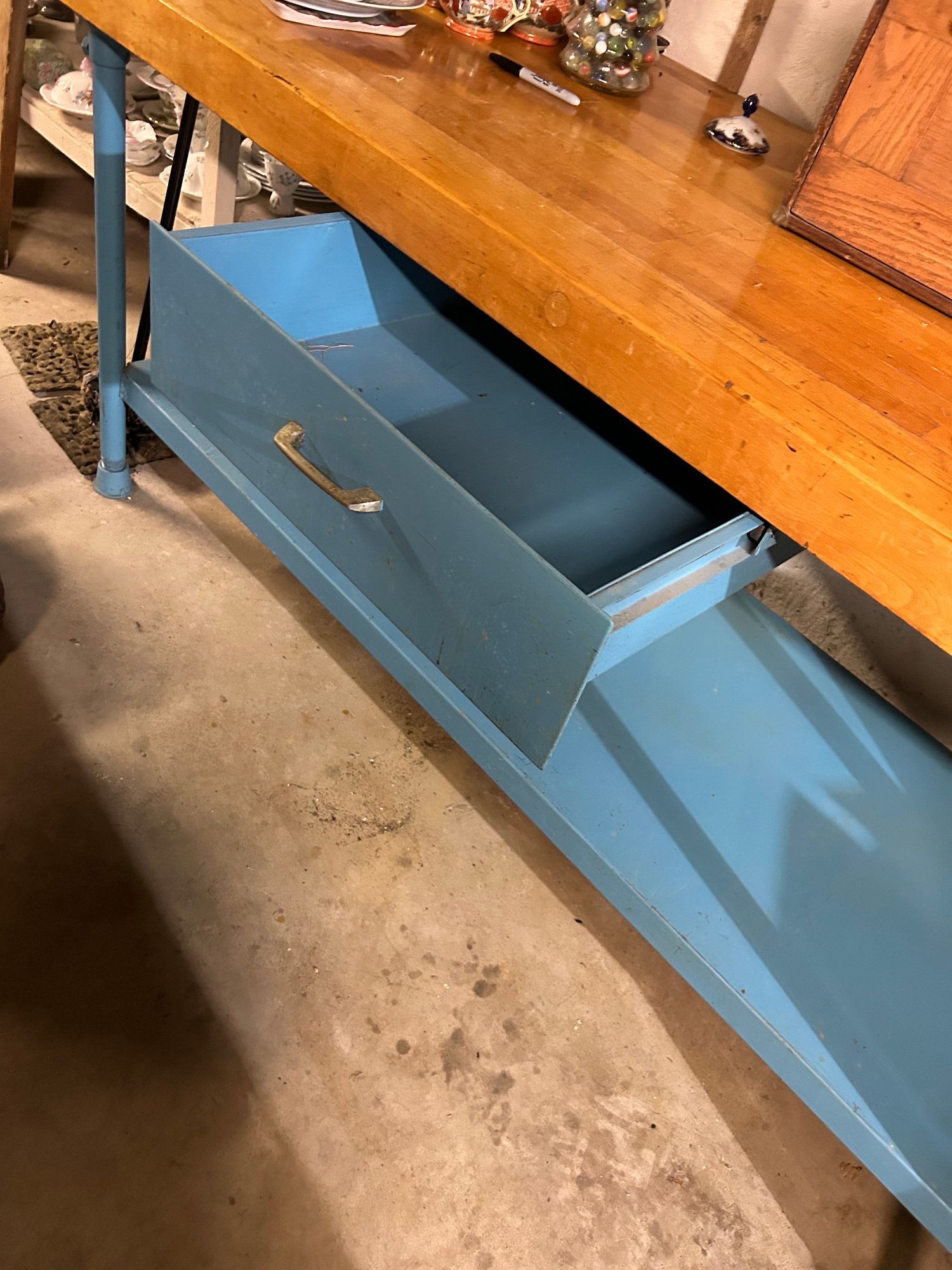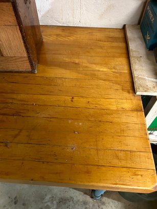 Vintage Bakers table 3 inch maple butcher block top on metal base with metal drawer. 72“ x 30” x 34“ tall.