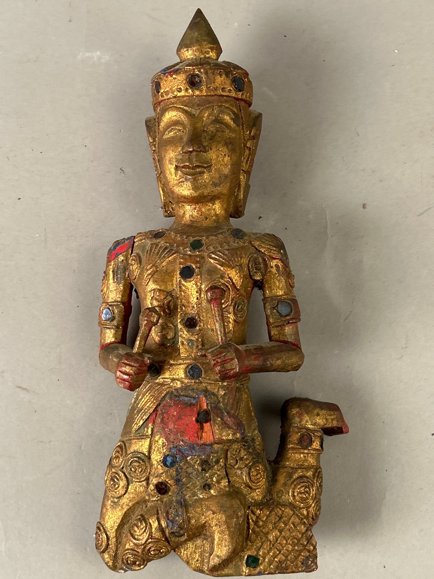 Carved Wooden Tibetan Statue with original painted surface, inset “jewels”. 12 inches tall.