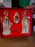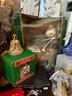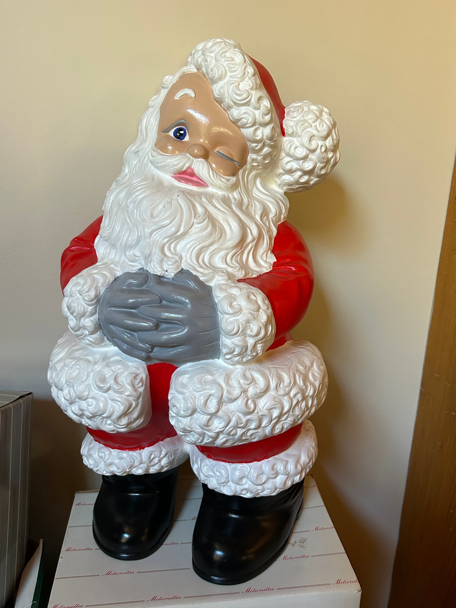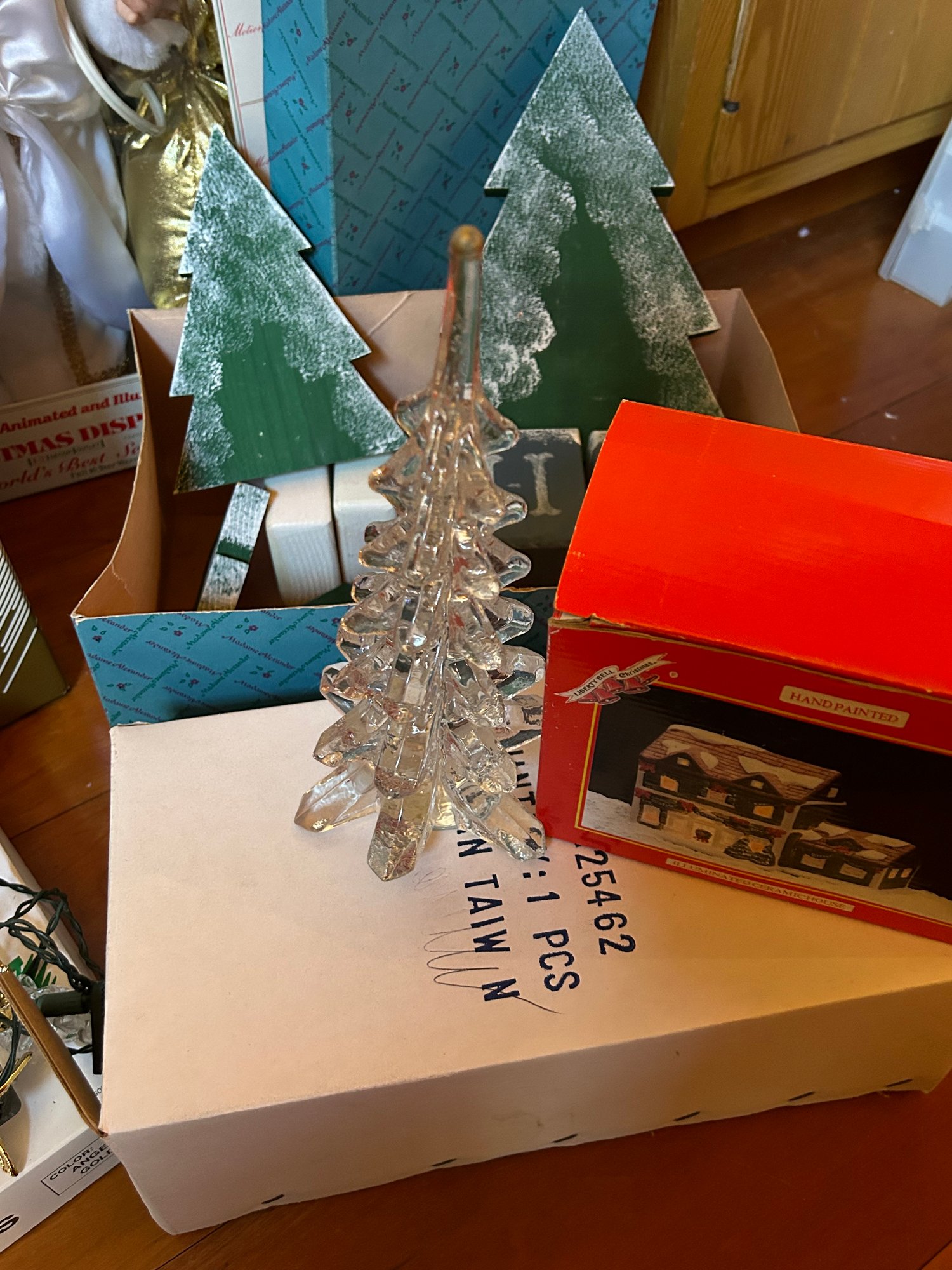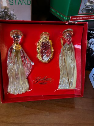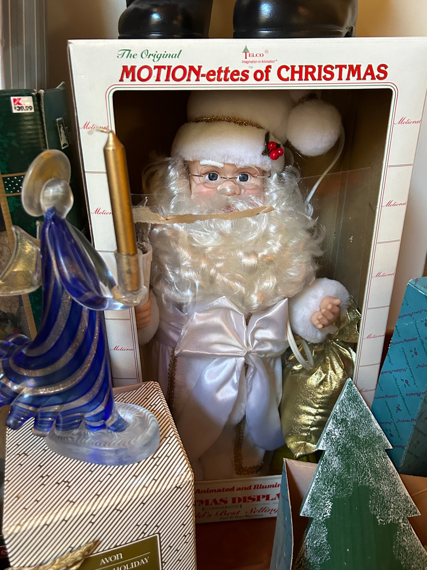 Vintage Christmas items, including Gorham Crystal/gold nativity set, multiple Santa Clausâs, reindeer, lights, Christmas trees, angels, etc... Tallest Santa, 34 inches