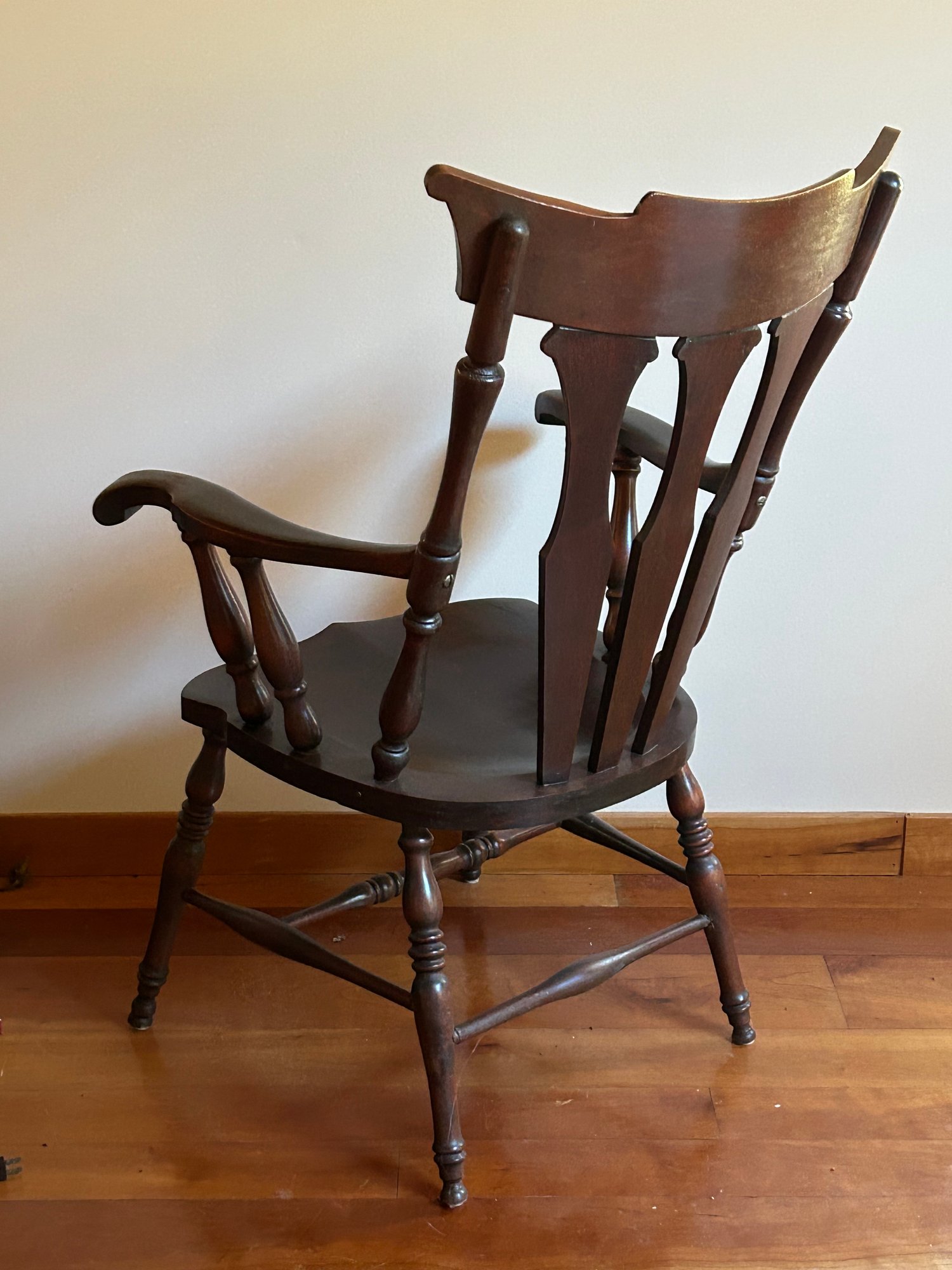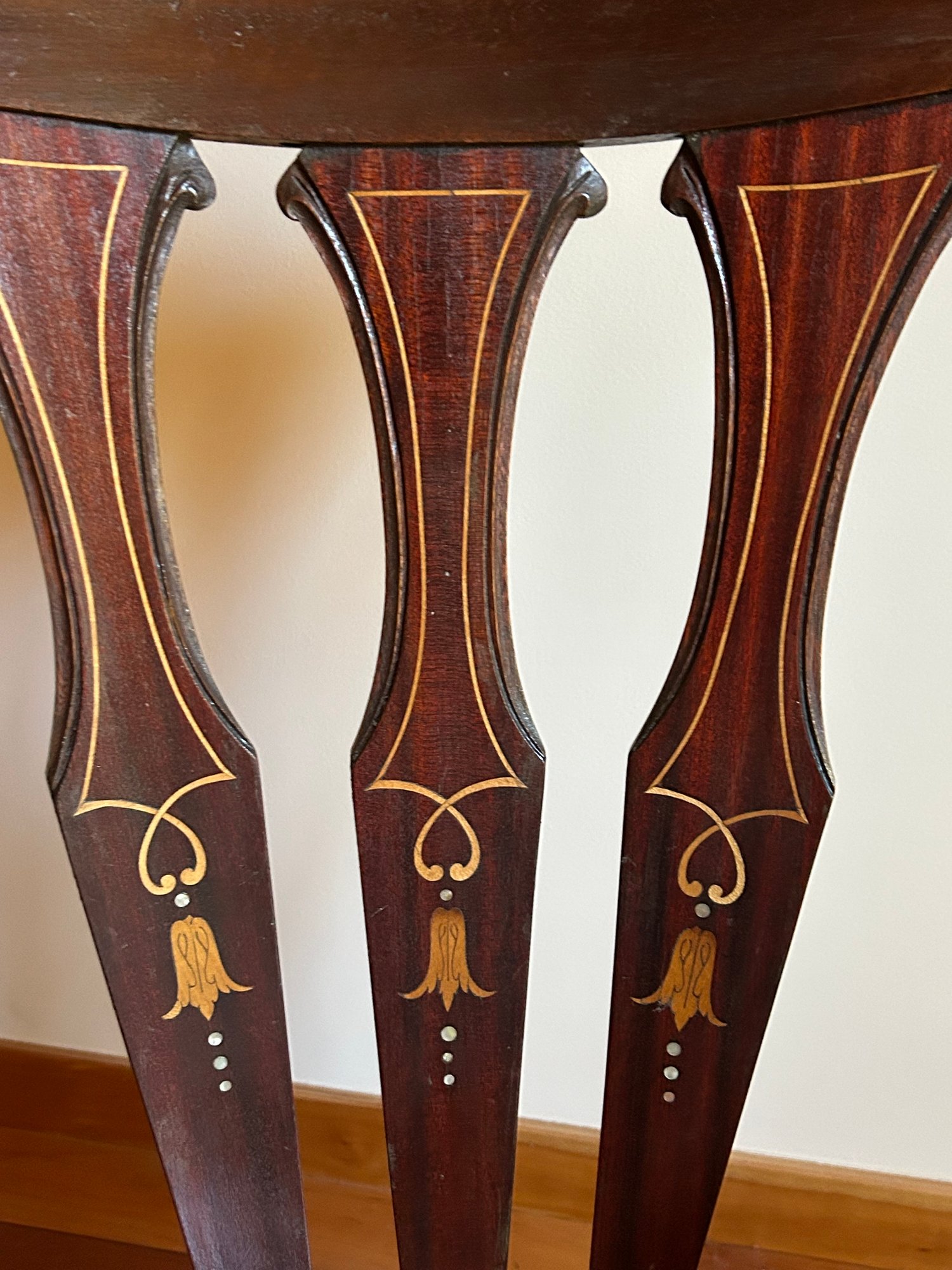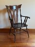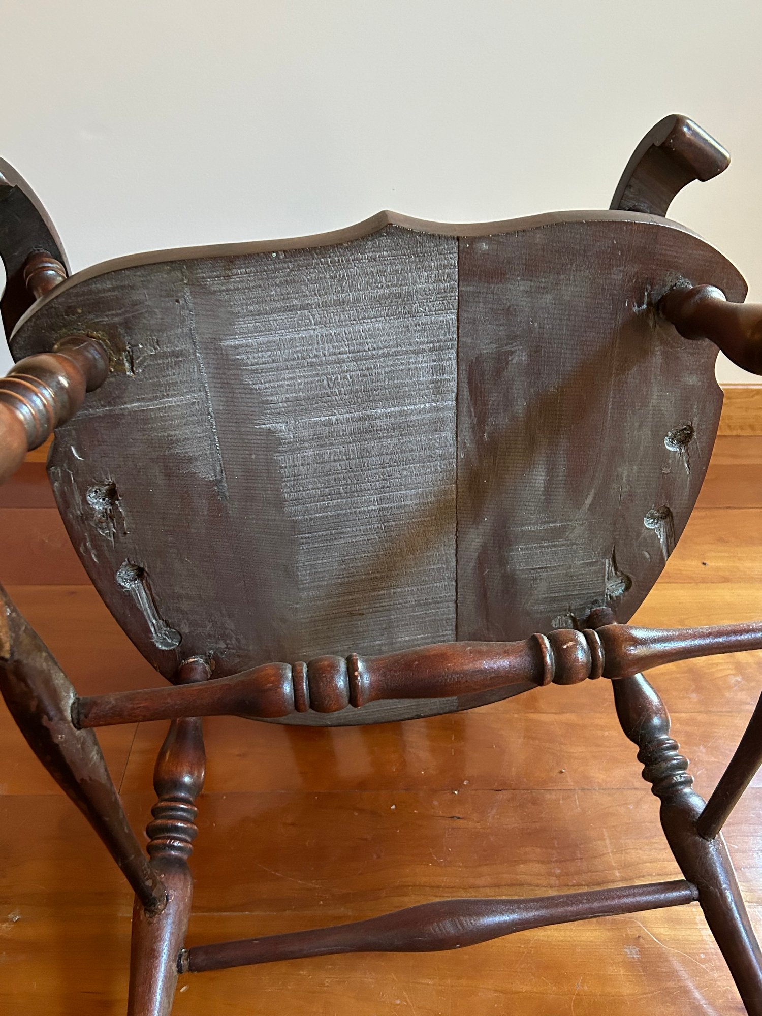 Vintage marketree inlaid armchair, light wood and mother-of-pearl inlay on back slats. 28“ x 21“ x 40“ tall.