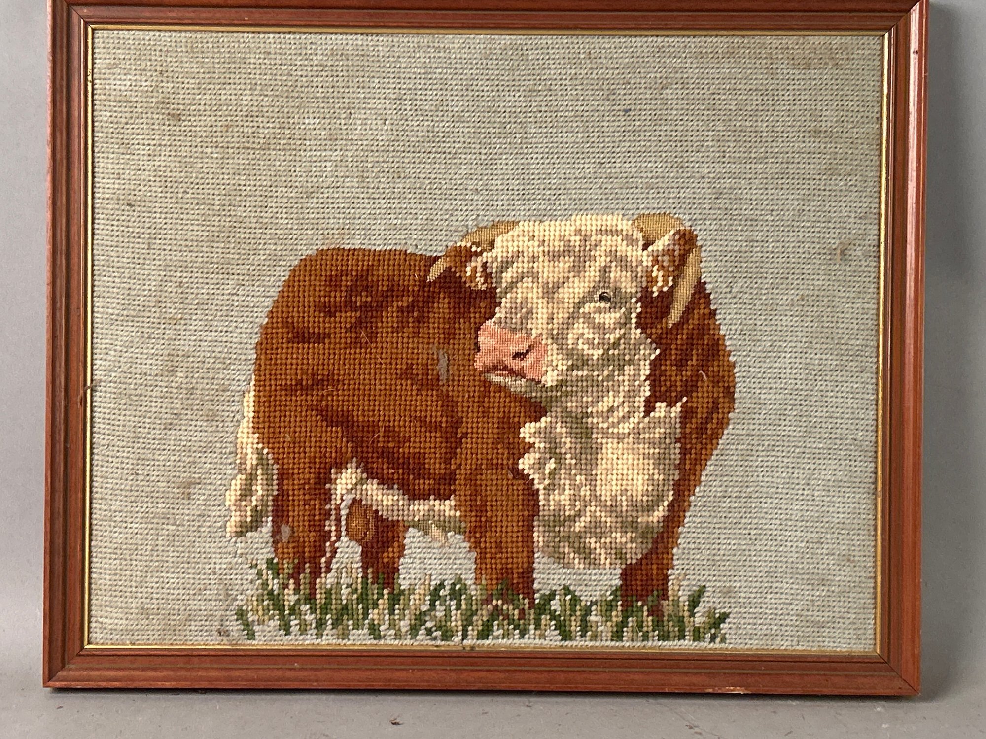 Needle point of cow standing in field. Nicely framed 13 1/4“ x 16 1/2“