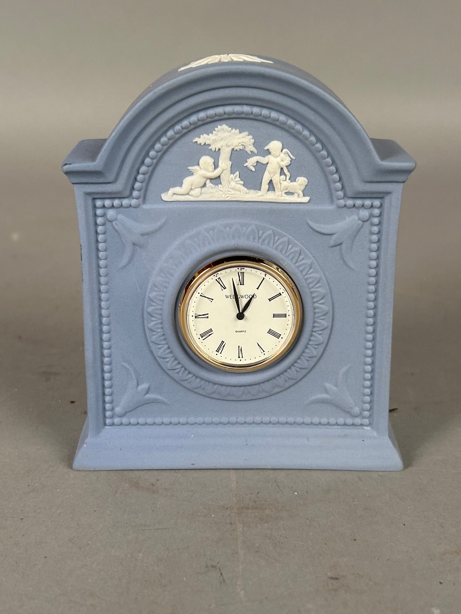 Vintage Wedgewood quartz desk Clock. Blue and white porcelain case