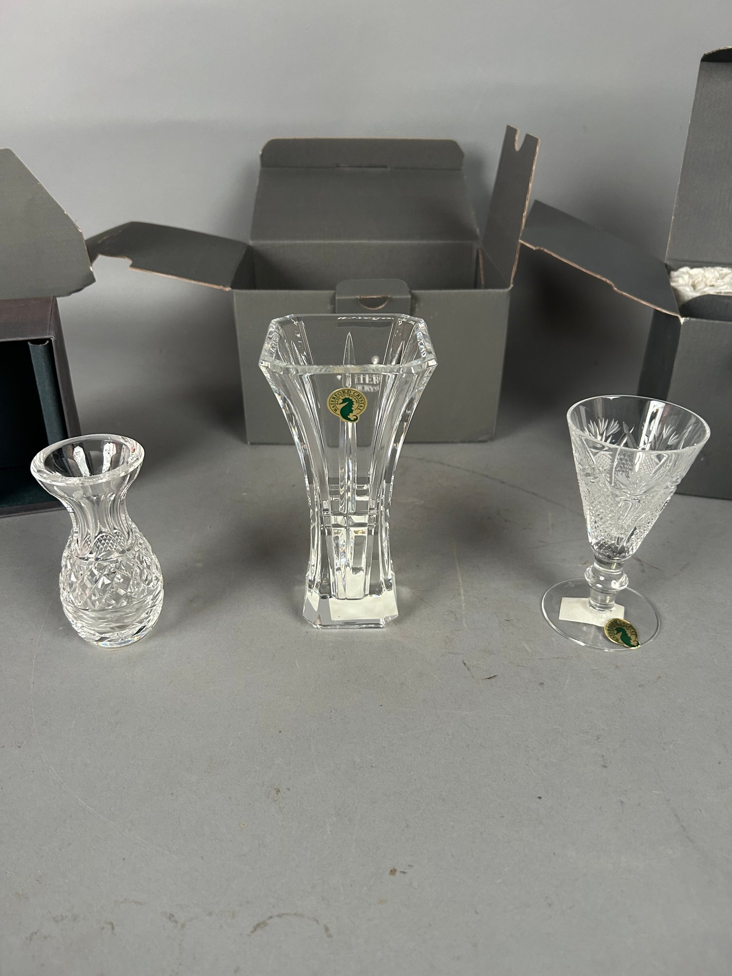 Waterford crystal 3 pieces 1998WS Posey vase, Dunmore Sherry glass set of 4, 6 inch bud all new inbox