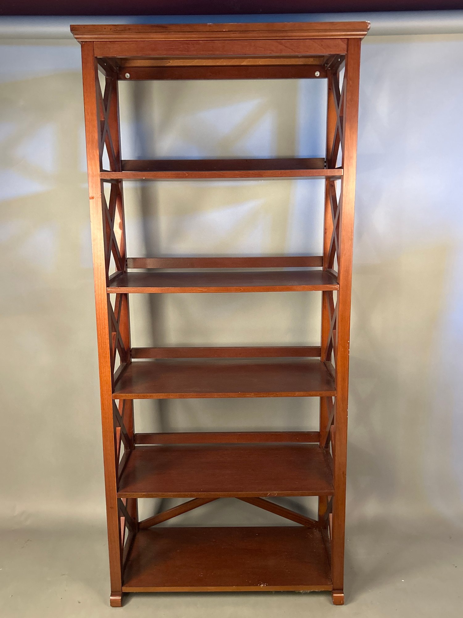 Wooden Five Tiered Bookshelf With X design on sides 30 1/2 x 14 x 70“ tall