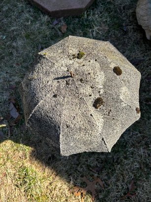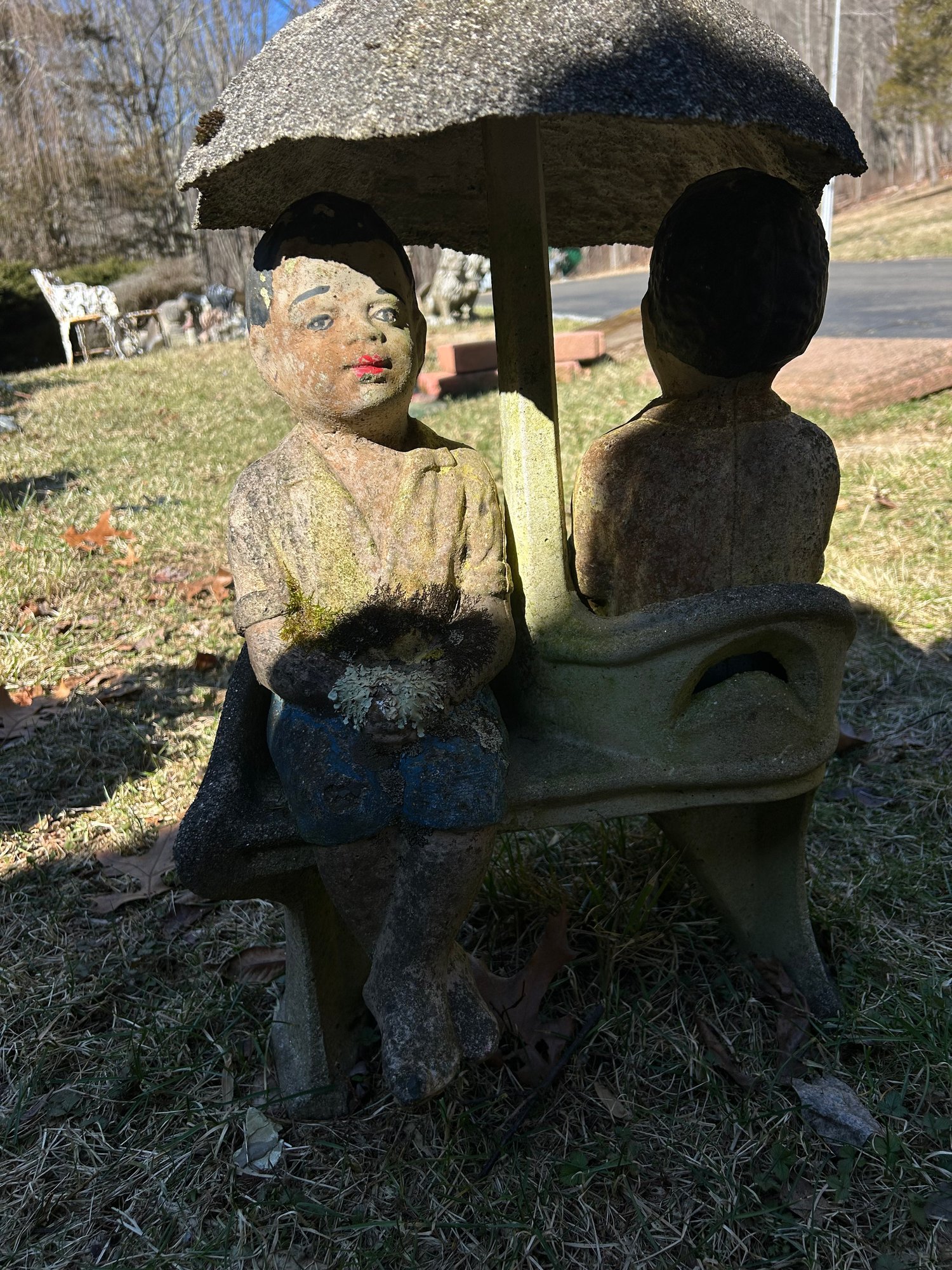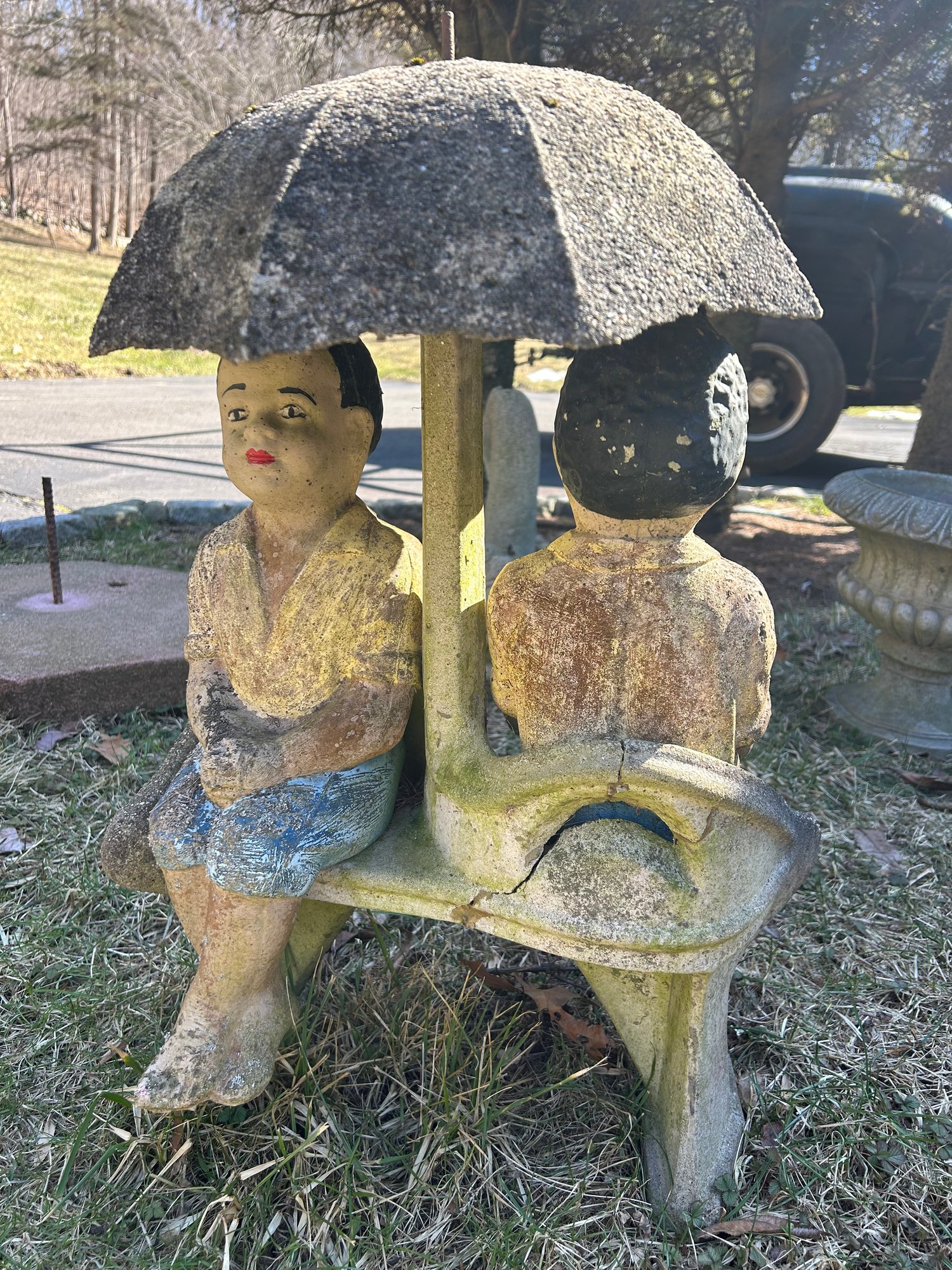 Yard ornament of two seated figures under umbrella. Cast stone, weathered, painted, minor damage. see photos. 26 inches tall.