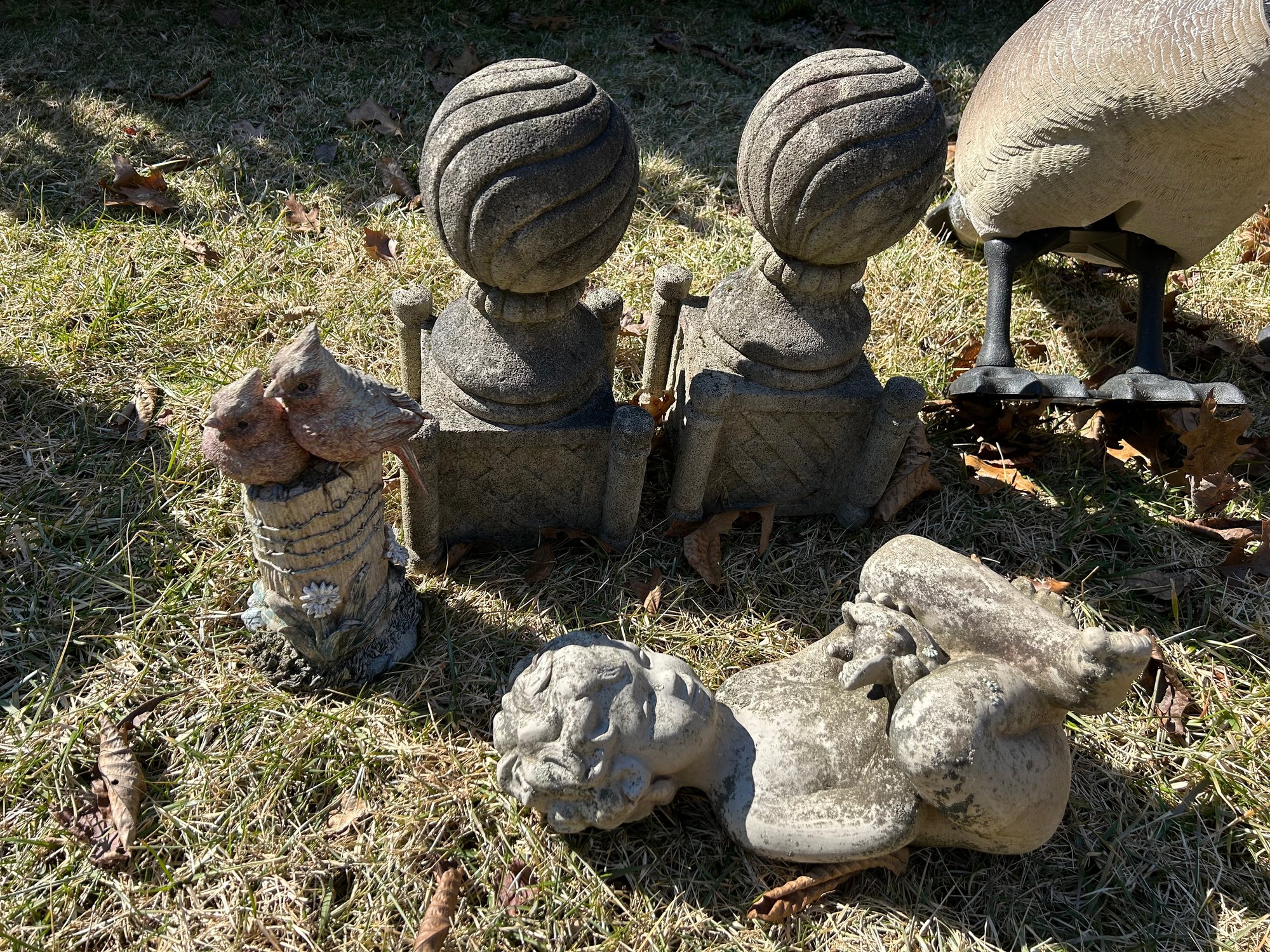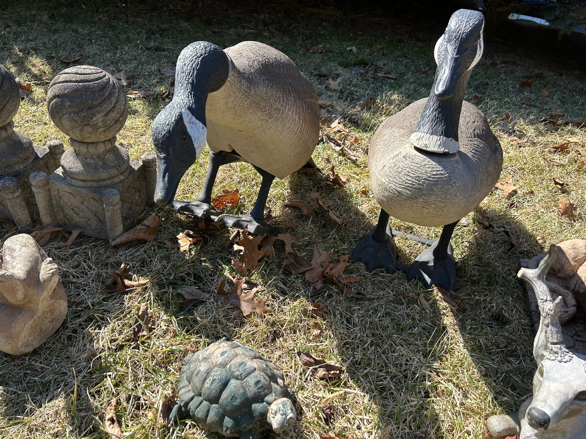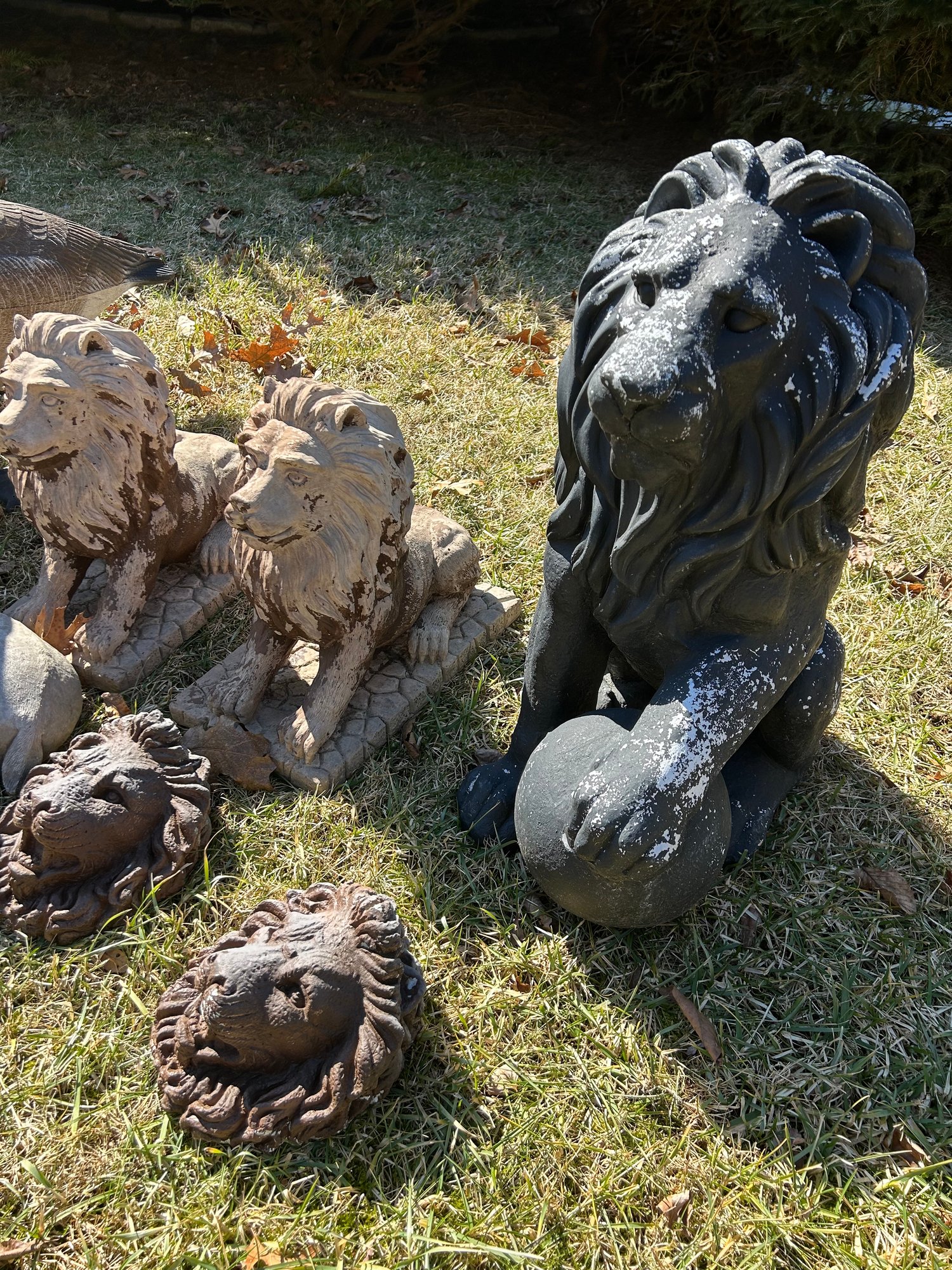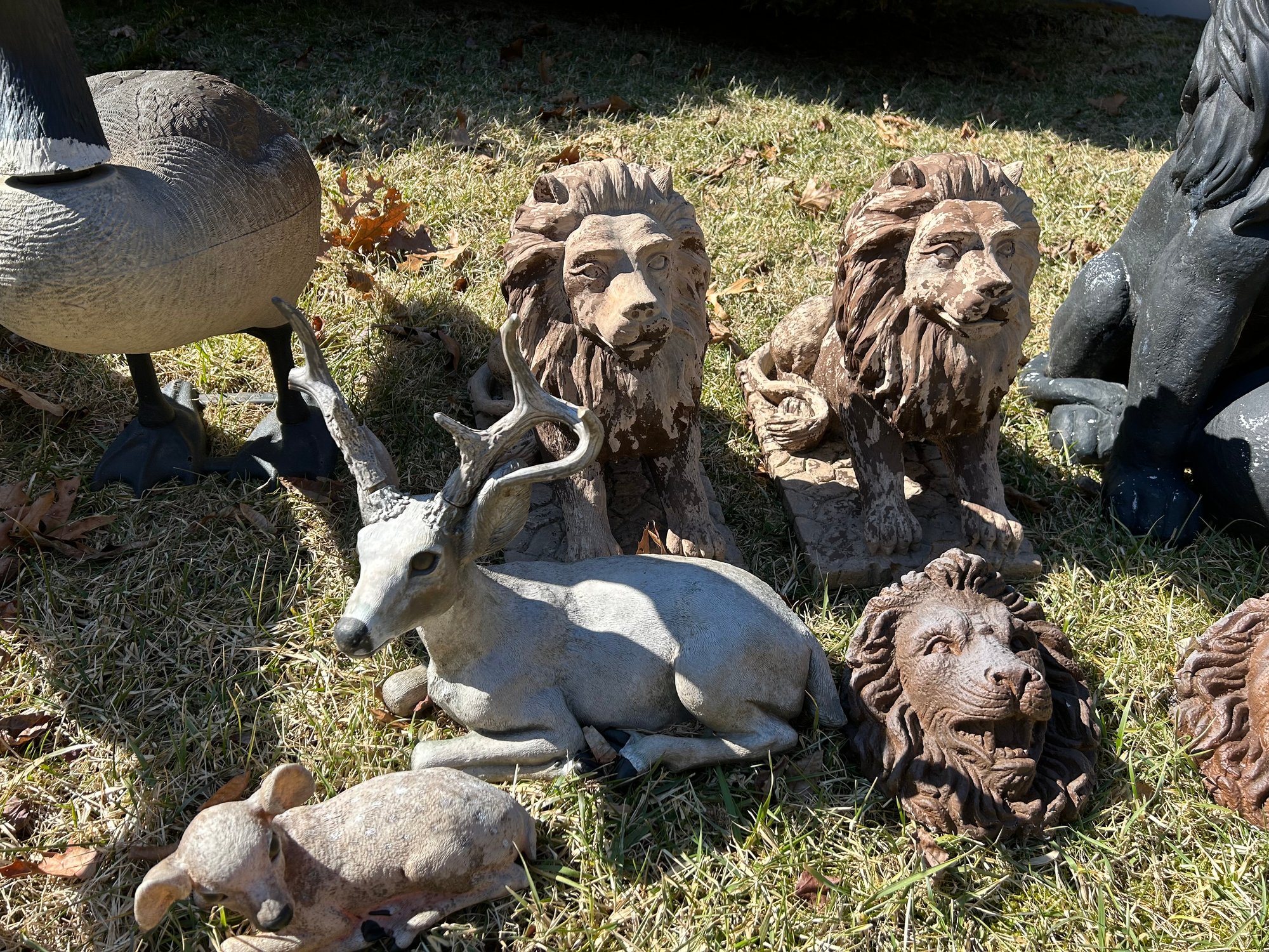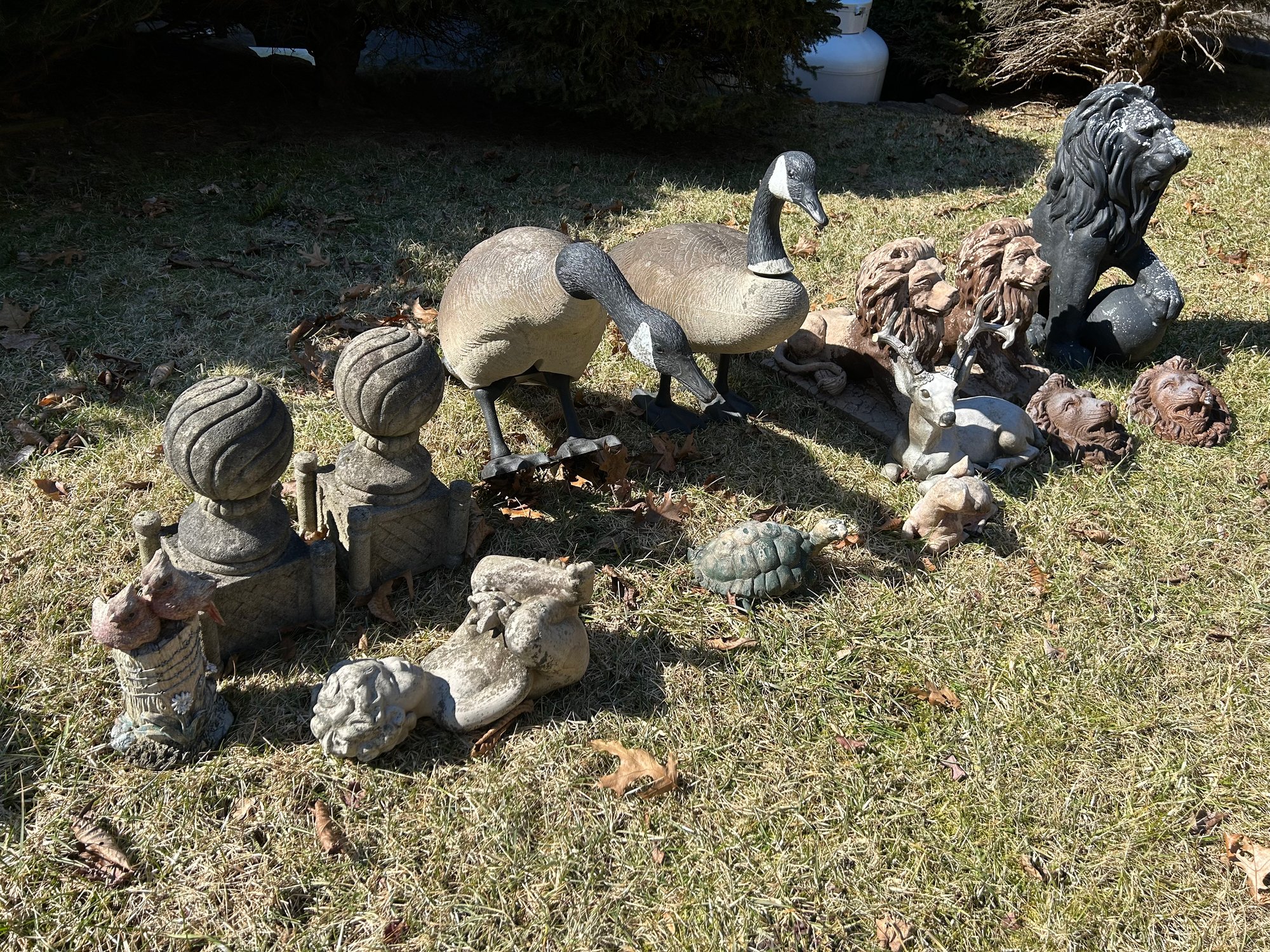 Yard ornaments and animals, all composition includes lions, geese, deer, turtle, ball finials. 15 pieces.