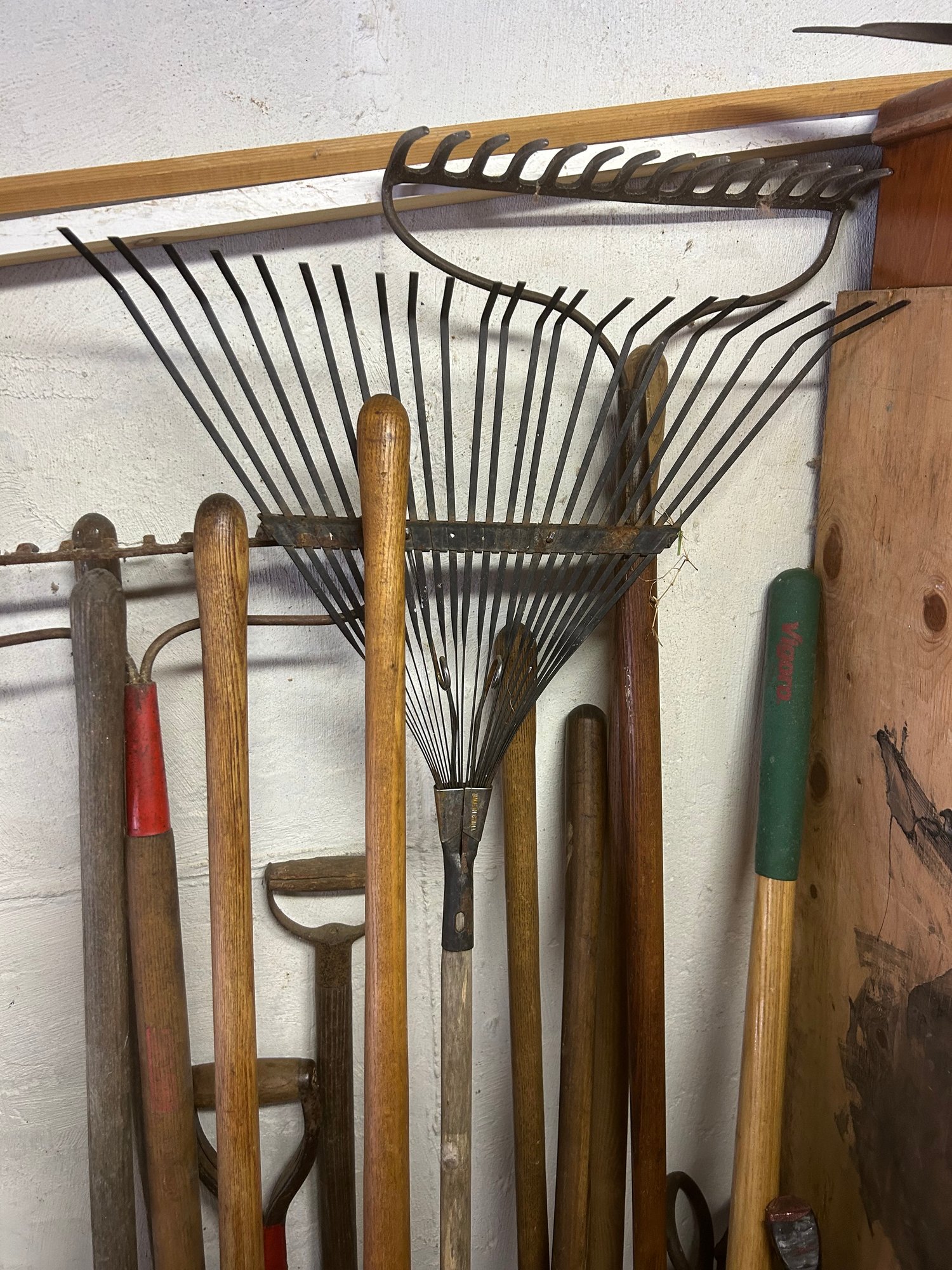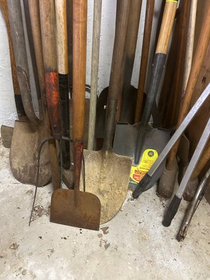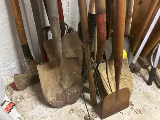 Yard tool lot approximately 20 pieces, including shovels, rakes, hatchets, pitchfork, etc.