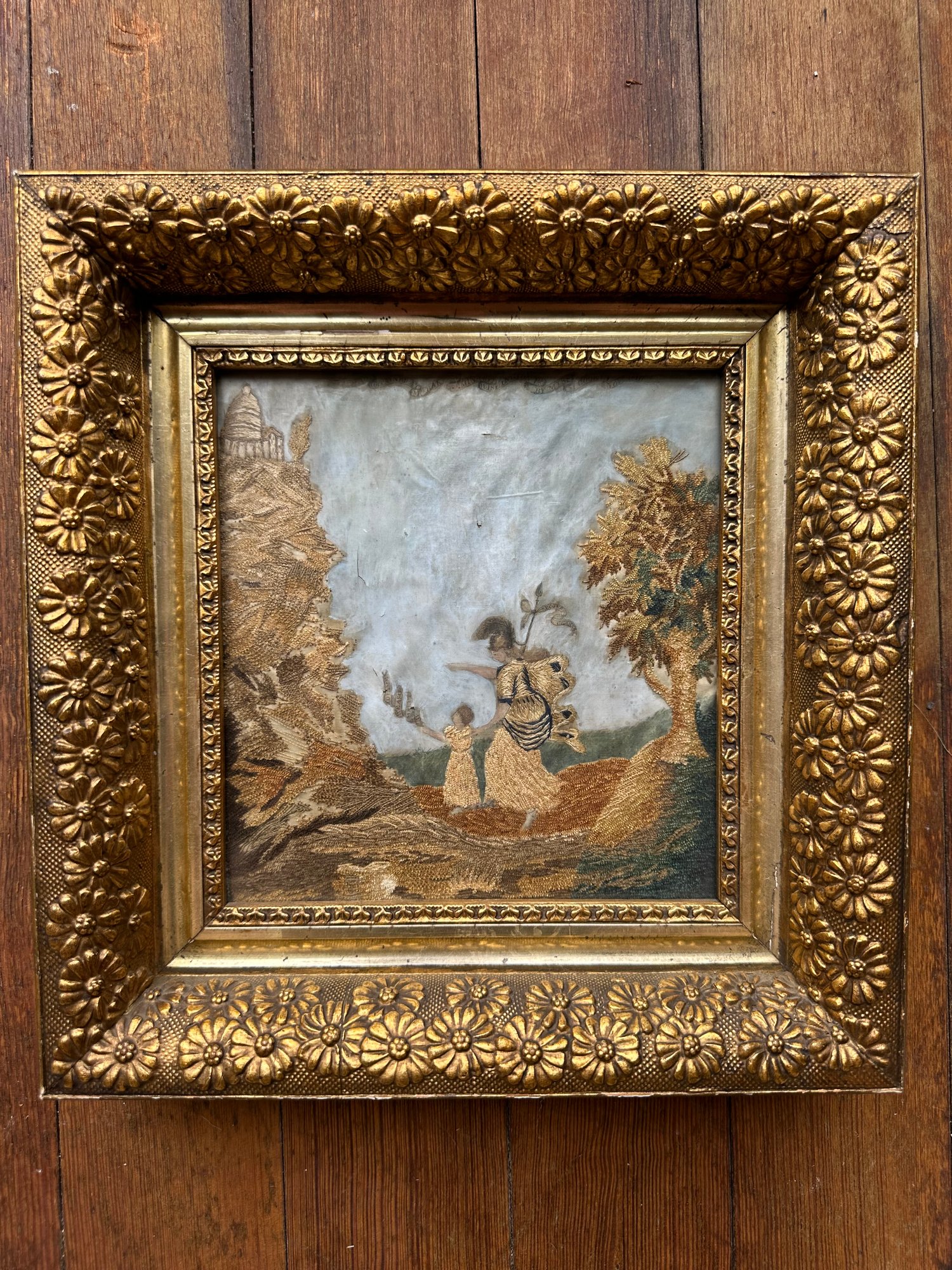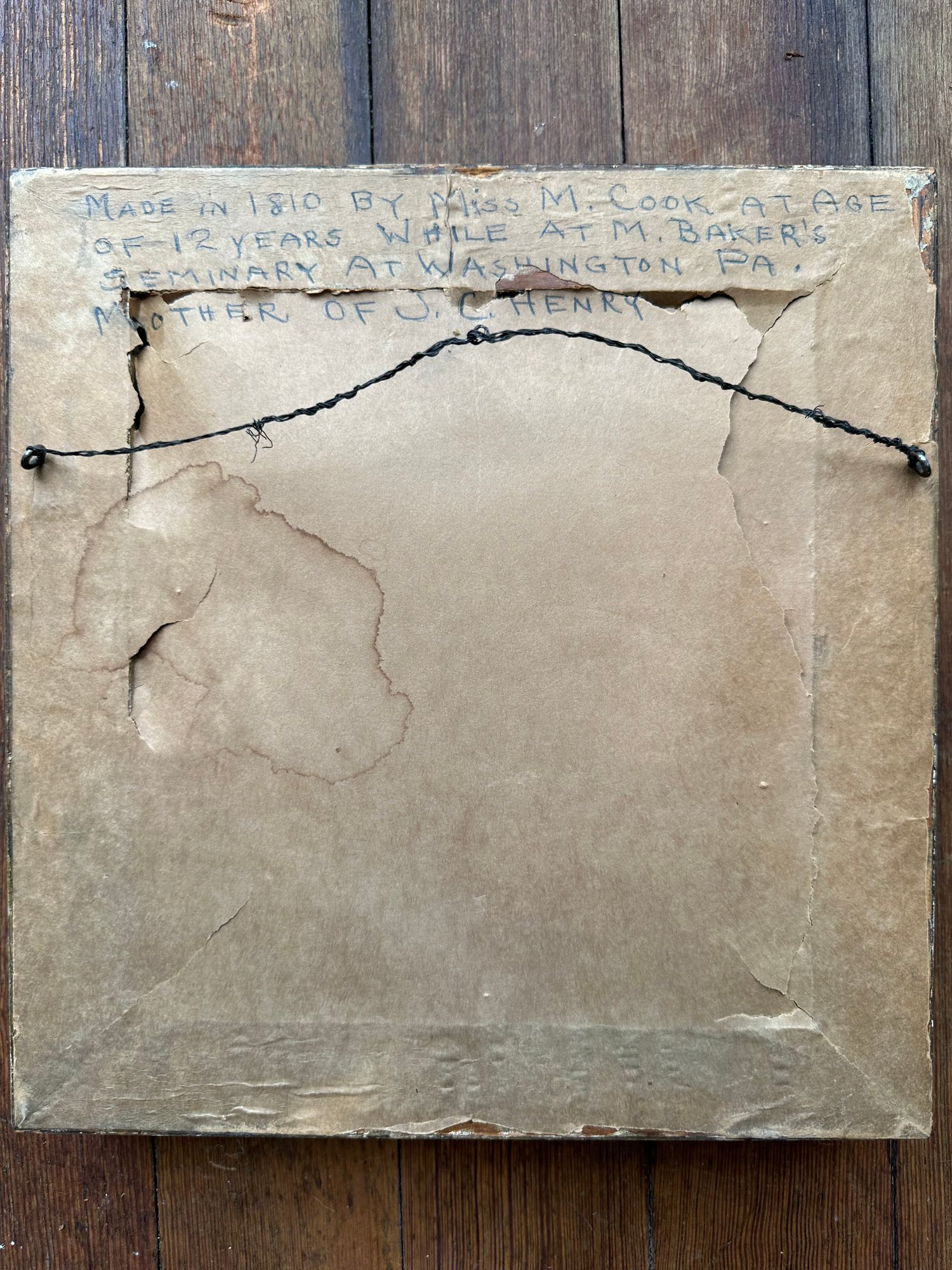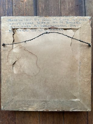 on back hand written "made in 1810 by miss m. cook at age of 12 years while at m. baker's seminary at washinton pa." mother of j.c. henry