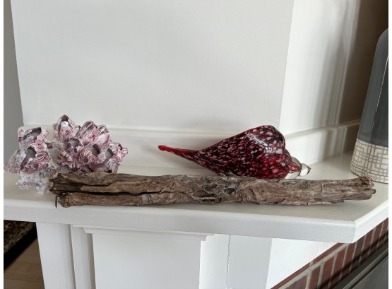 3 Piece Nautical Items / Drift Wood Glass Shell And Natural Shells - Lr4