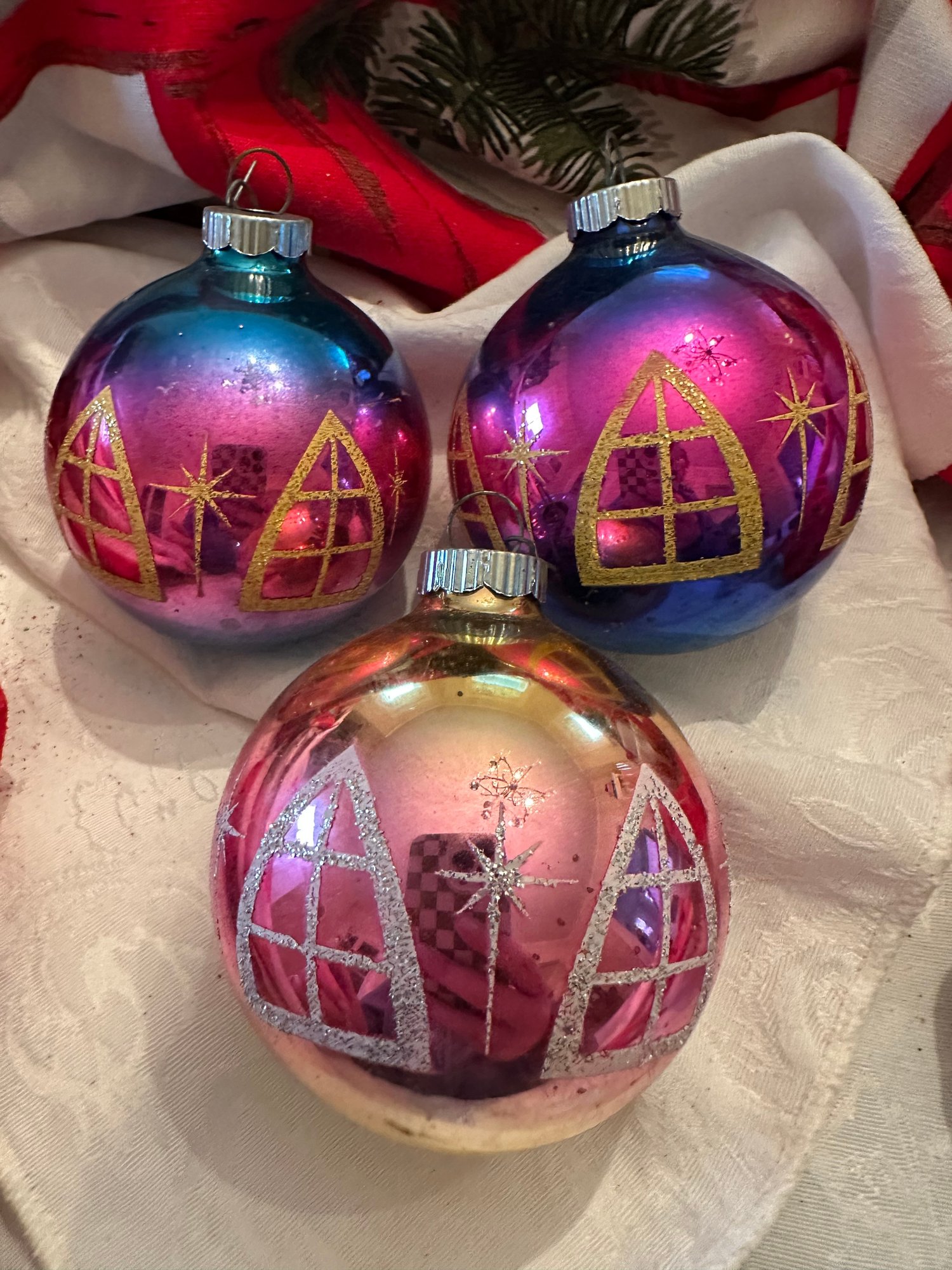 3 Vintage Shiny Brite Christmas Church Window Glass Ornaments - 29