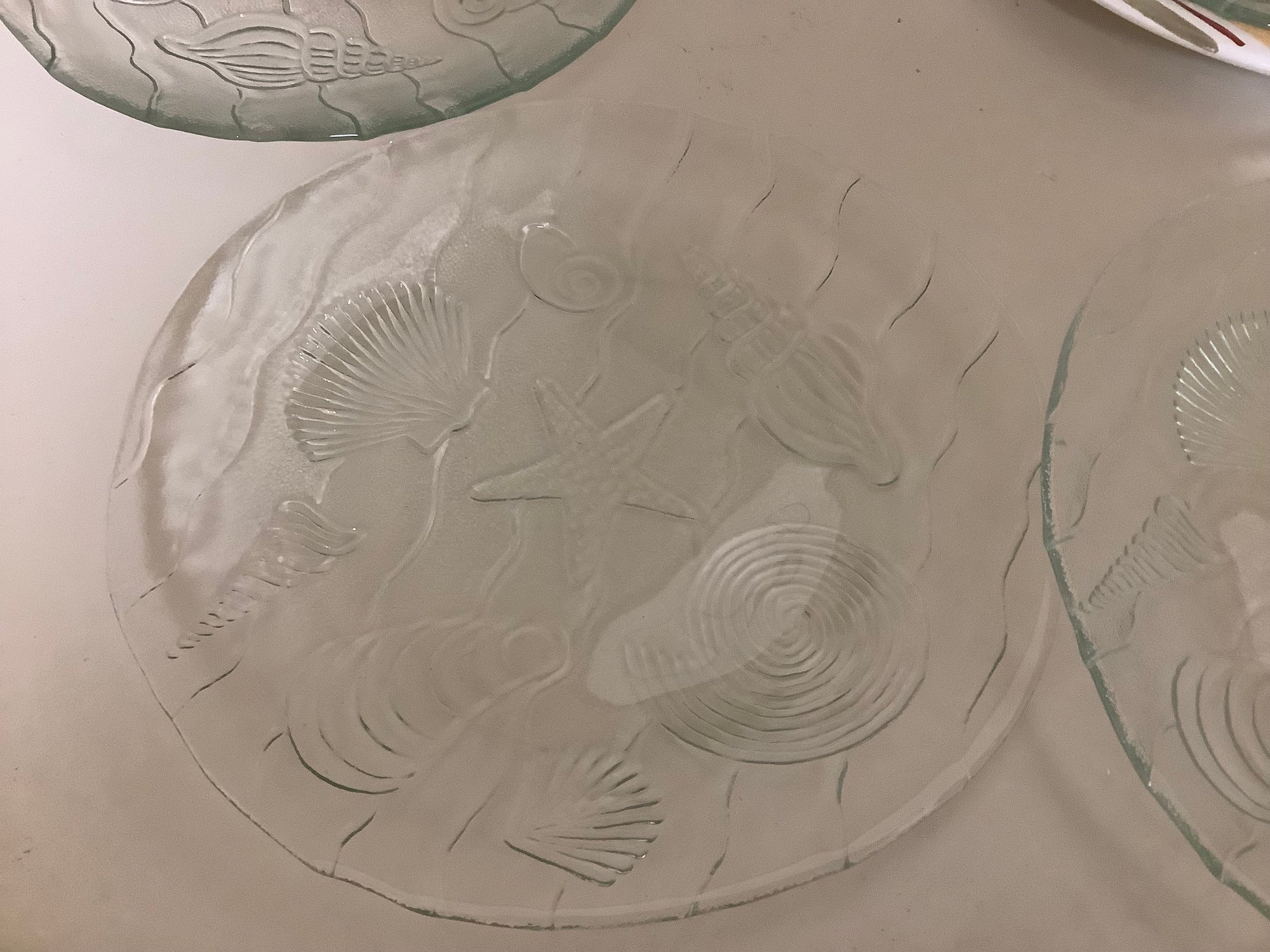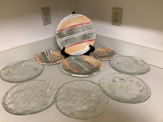 4 Pier One Striped Plates And 4 Sea Shell Clear Glass Plates - K