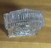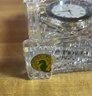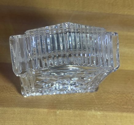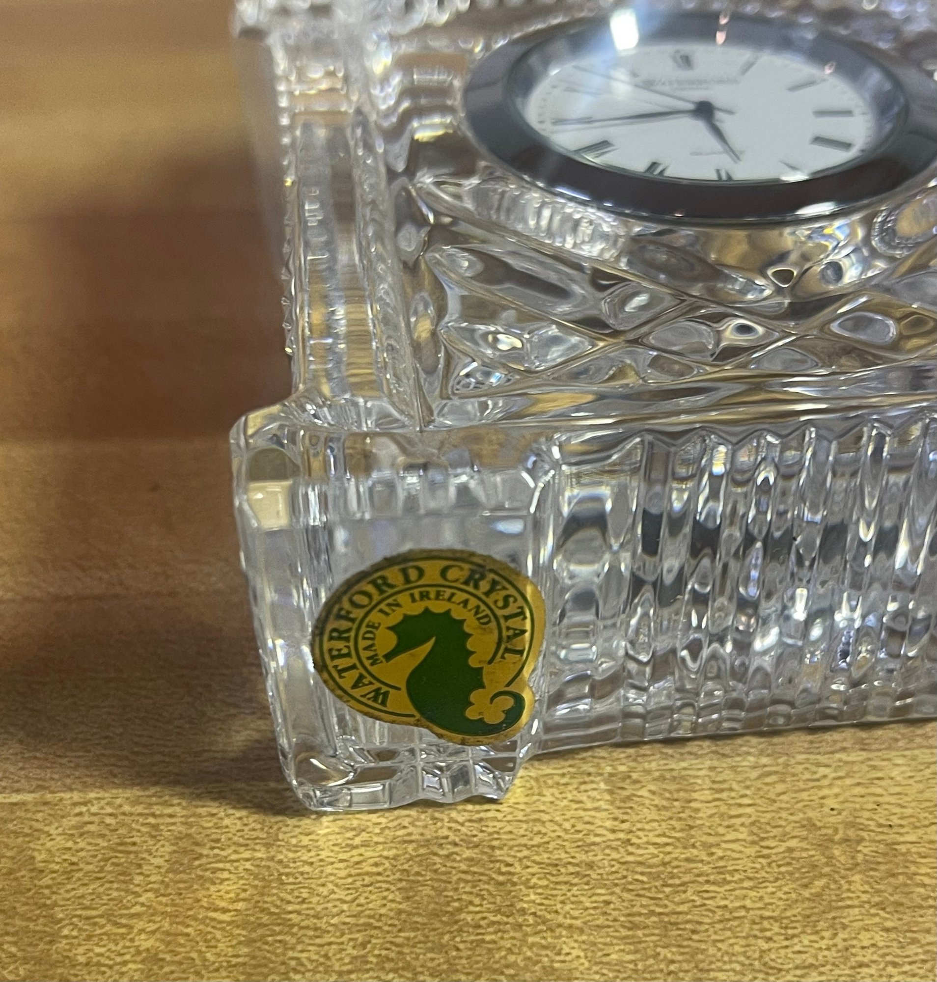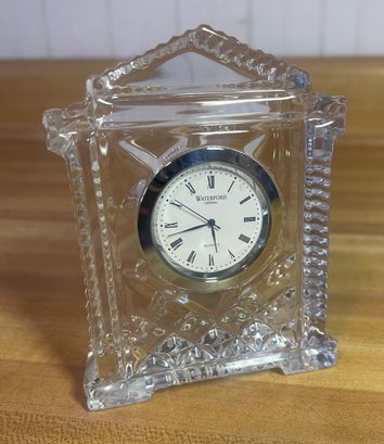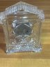 vintage Waterford Crystal quartz desk clock, specifically recognized as the Grecian or Acropolis model, featuring hand-cut leaded crystal and Roman numerals