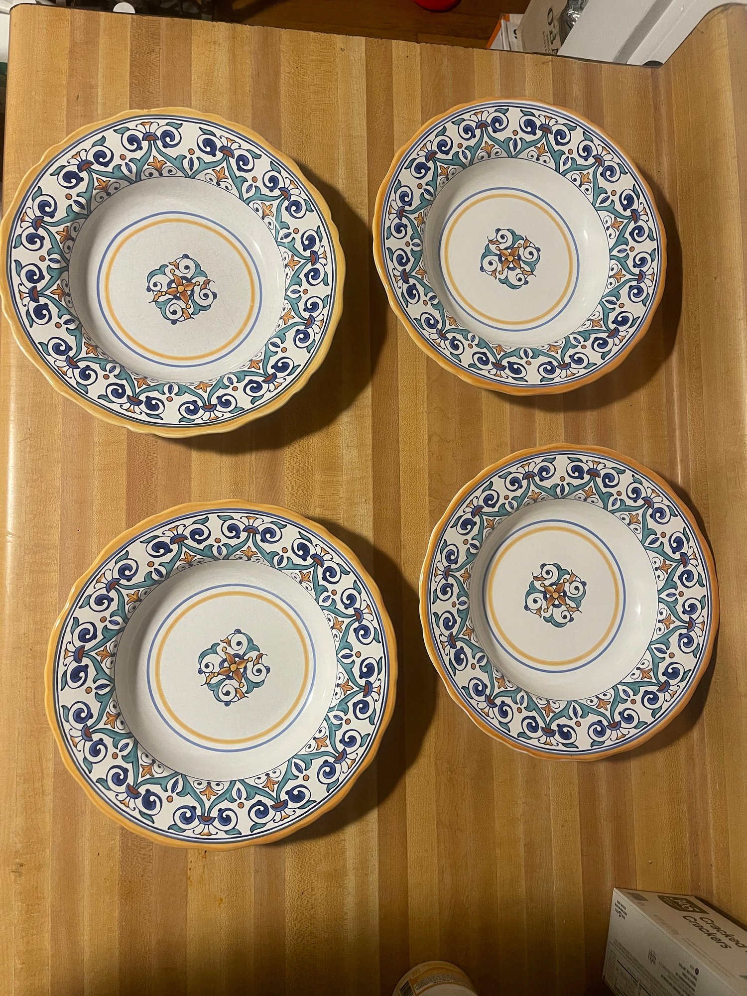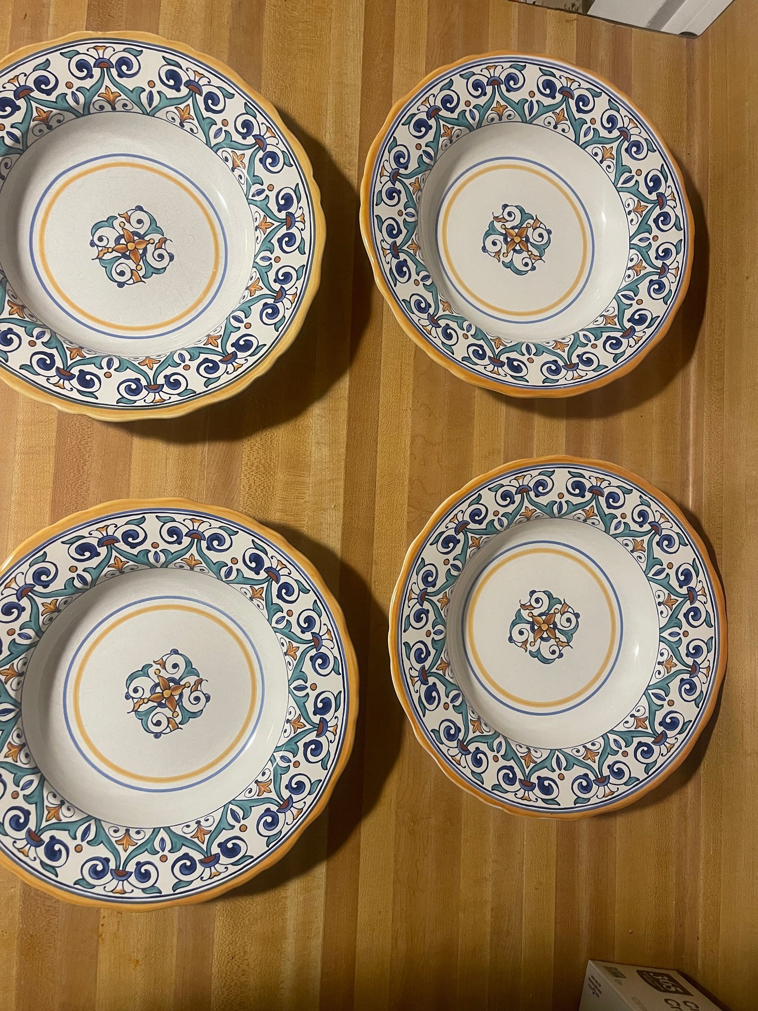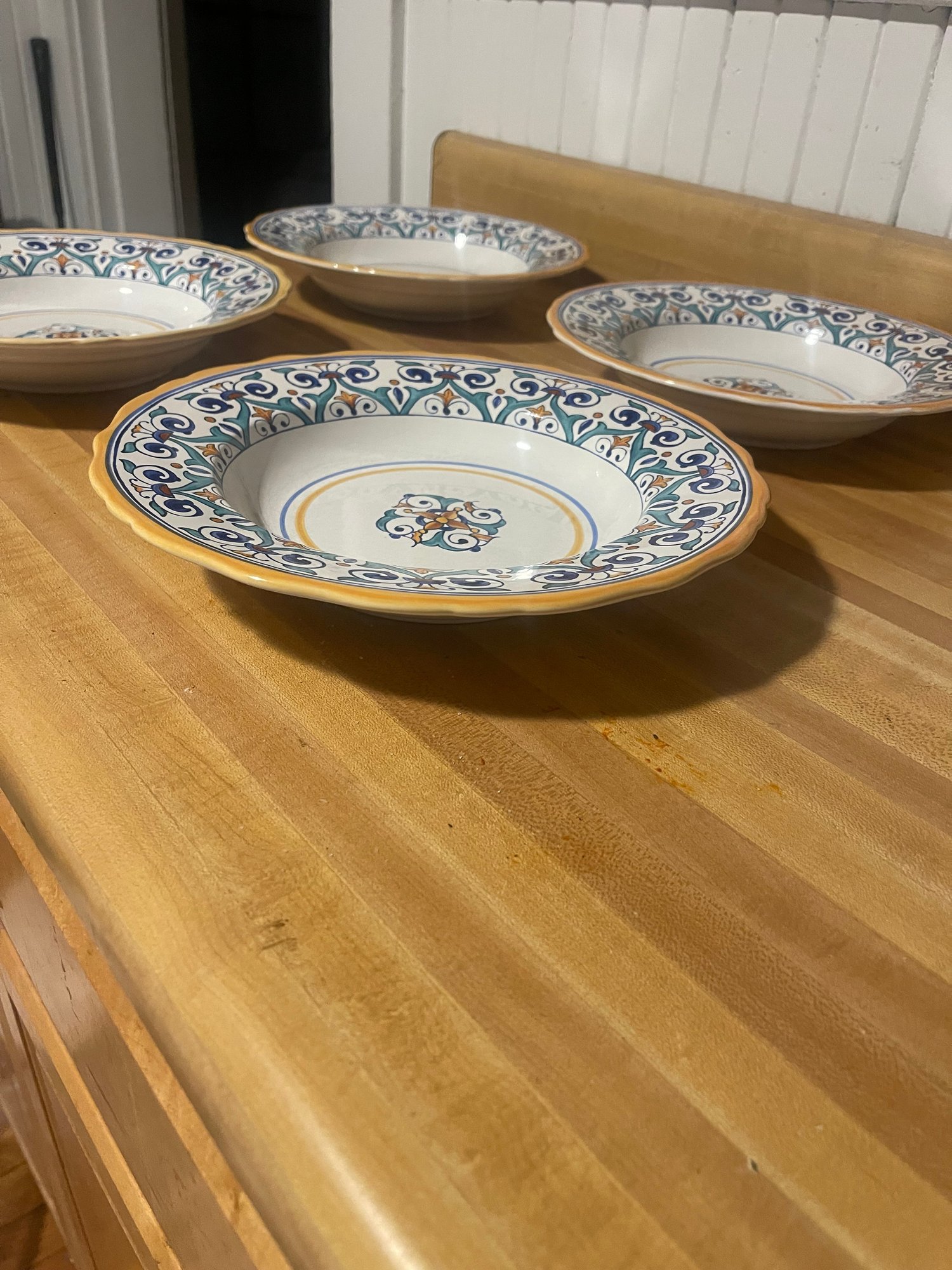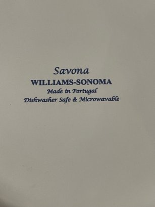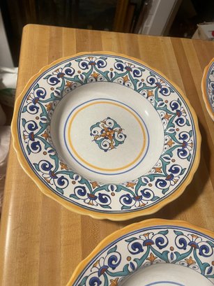 These are vintage ceramic pasta bowls by Williams Sonoma in the Savona pattern, crafted in Portugal and featuring a distinctive blue, teal, and yellow scroll design