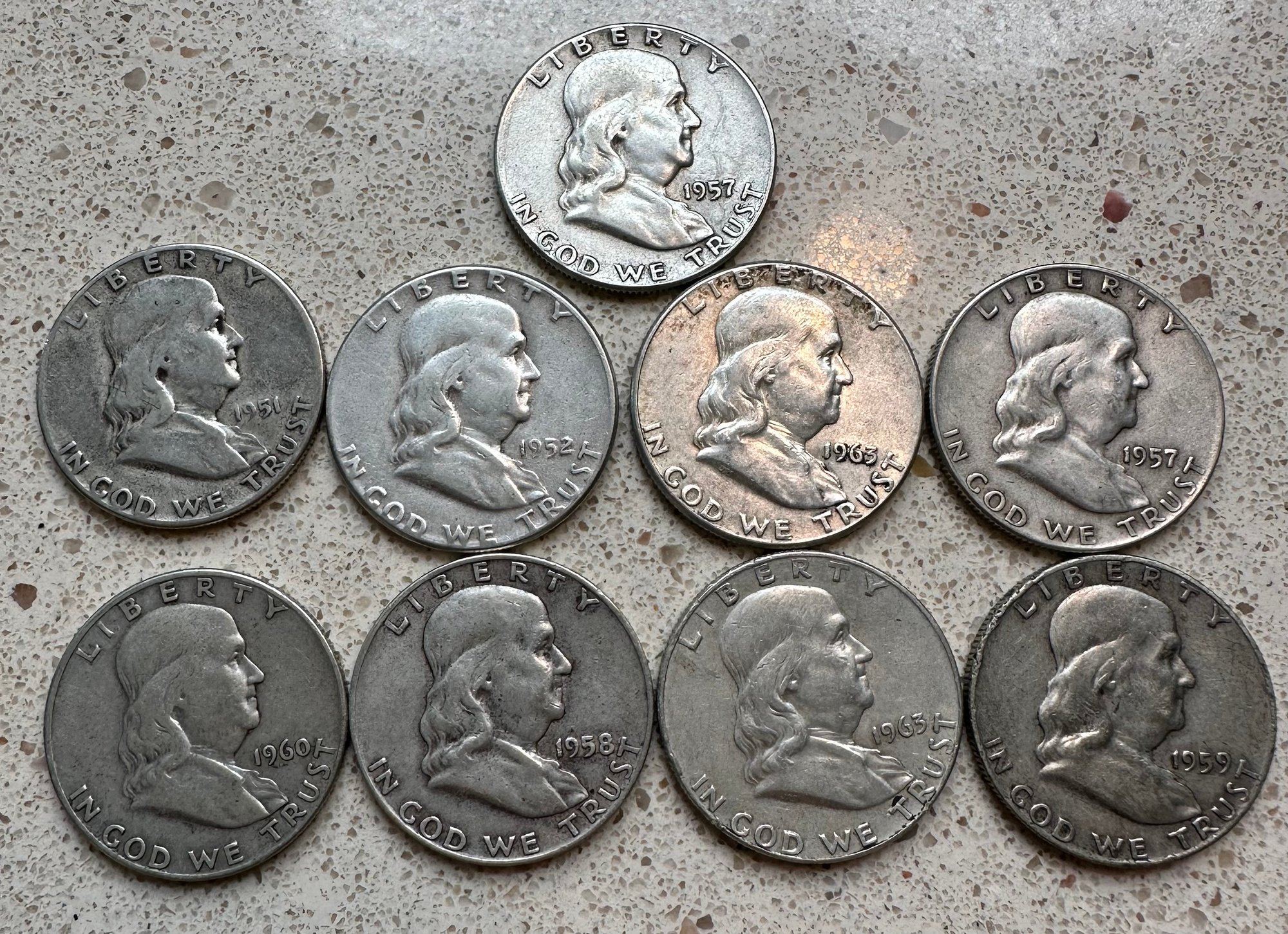 9 (Nine) Benjamin Franklin Silver Half Dollars Various Years 1950-1963 - 32