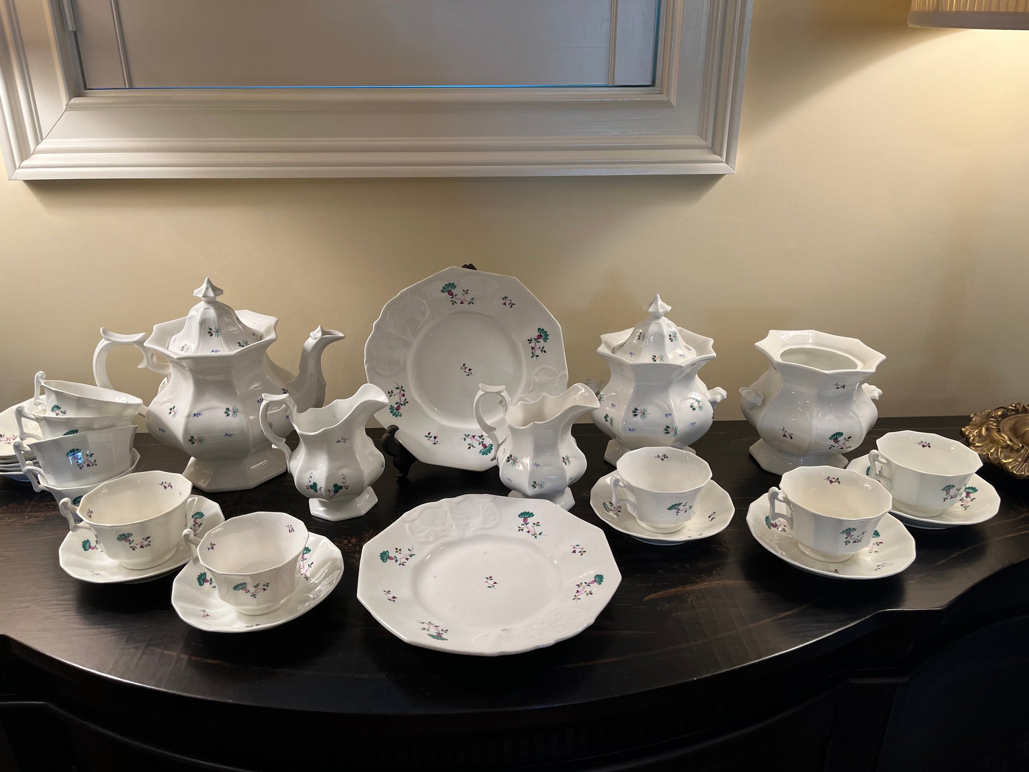 See pictures for colorations and condition. Small cracks one pitcher but minor. 4 saucers showing small cracks not included in the count. Missing one lid. Tea cup and saucer are counted as two.