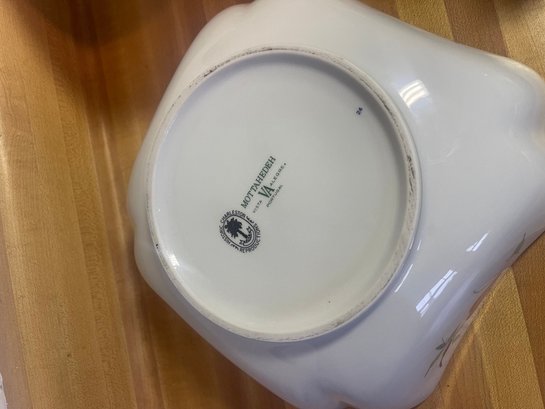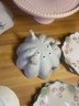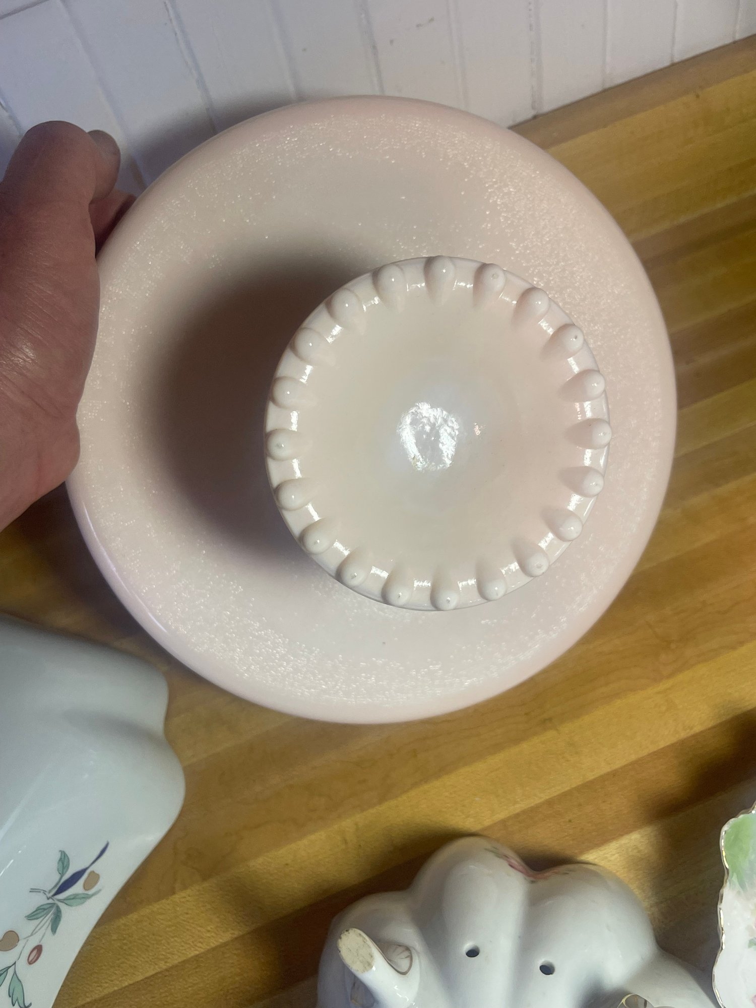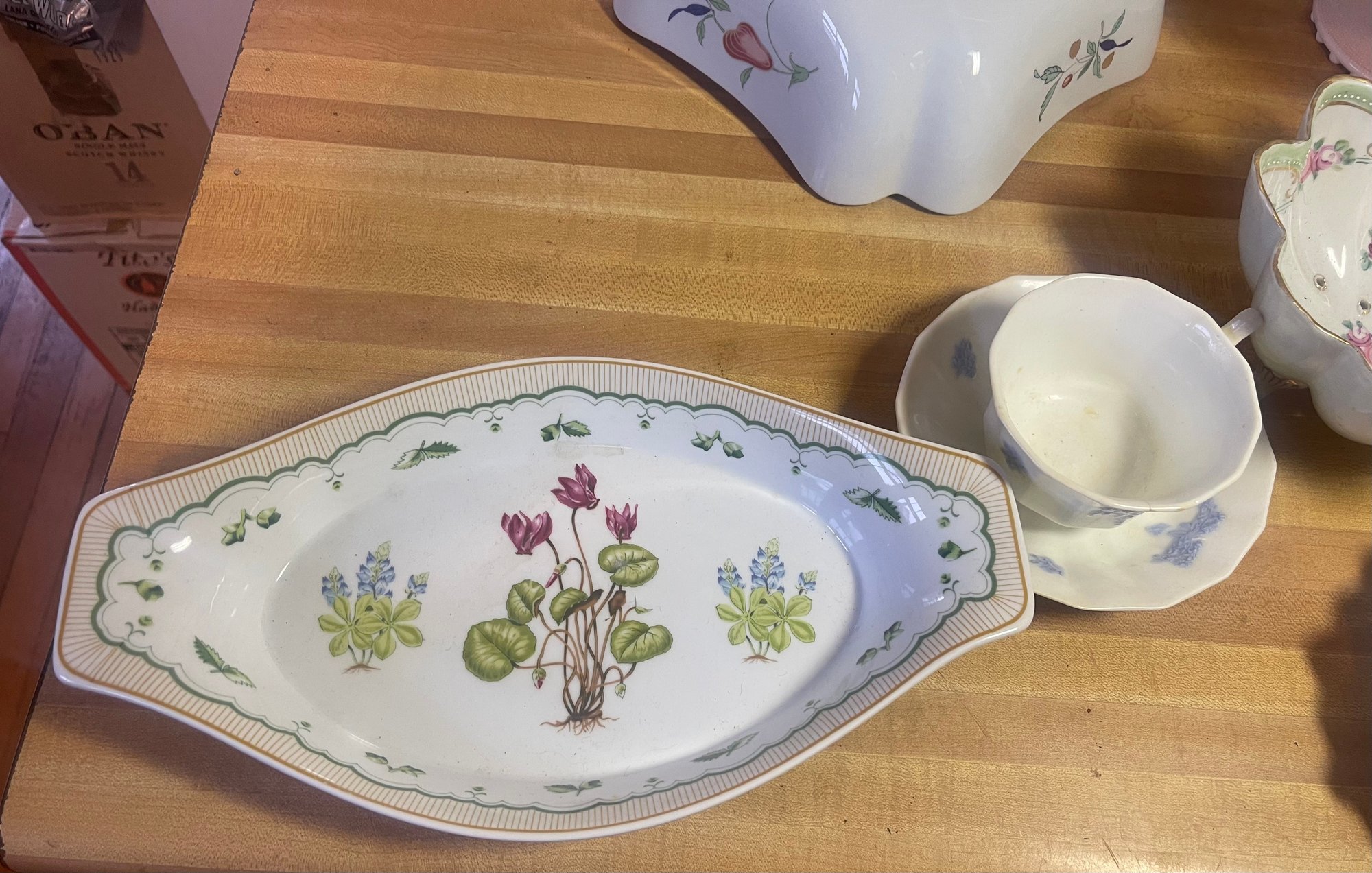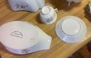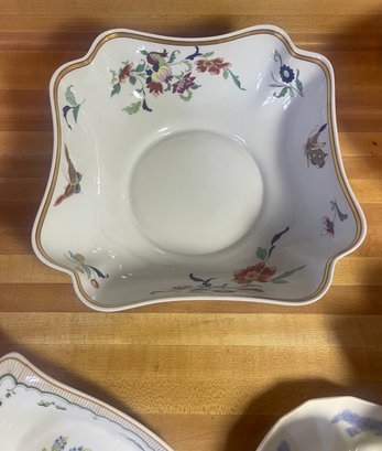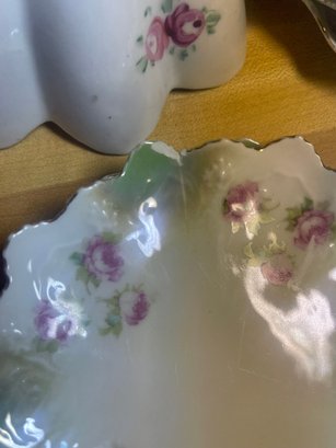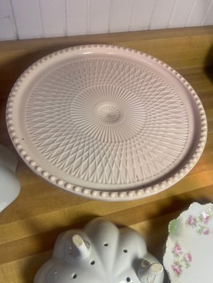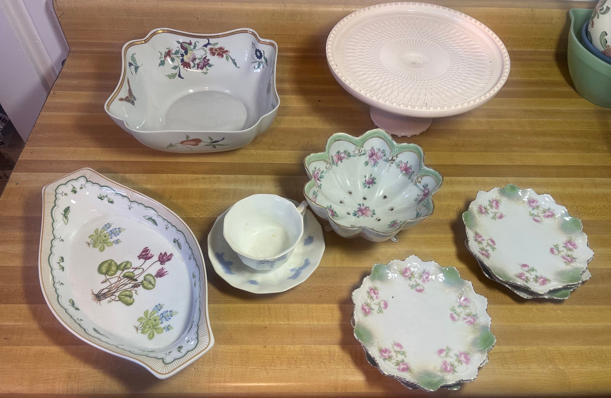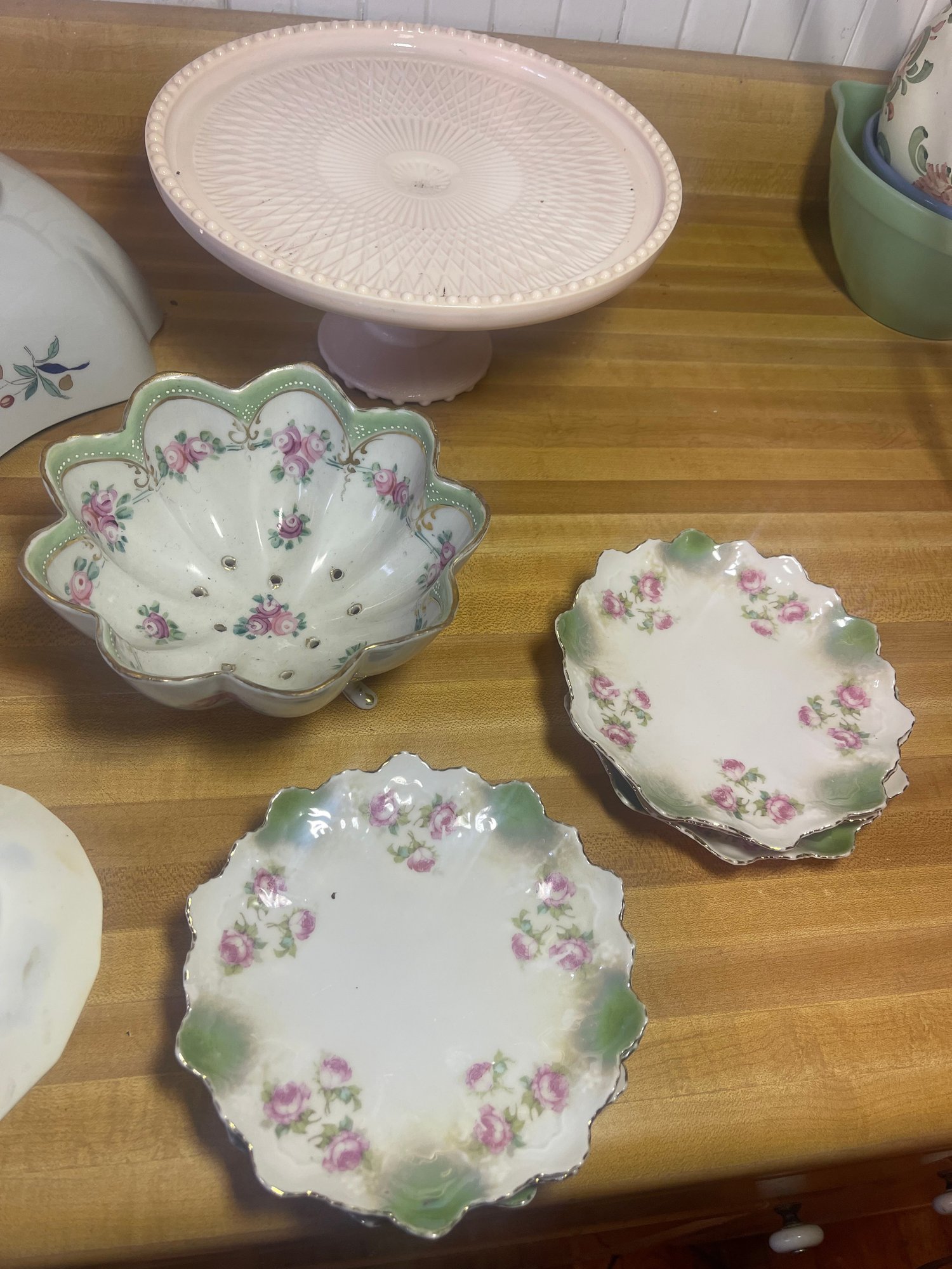 This collection features various antique and vintage porcelain tableware pieces, including a cake stand, a serving bowl with a scalloped edge, and decorative plates featuring floral designs.